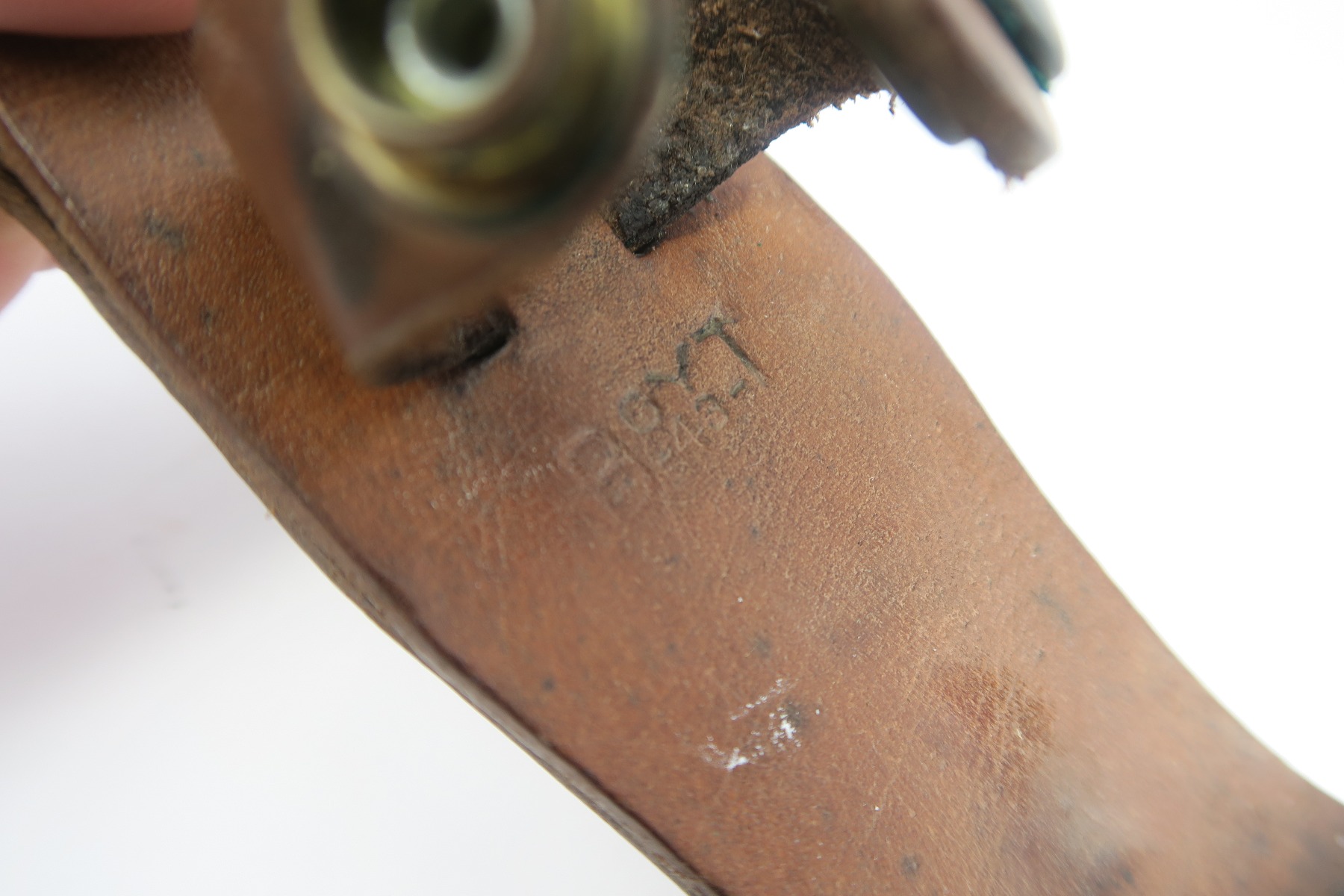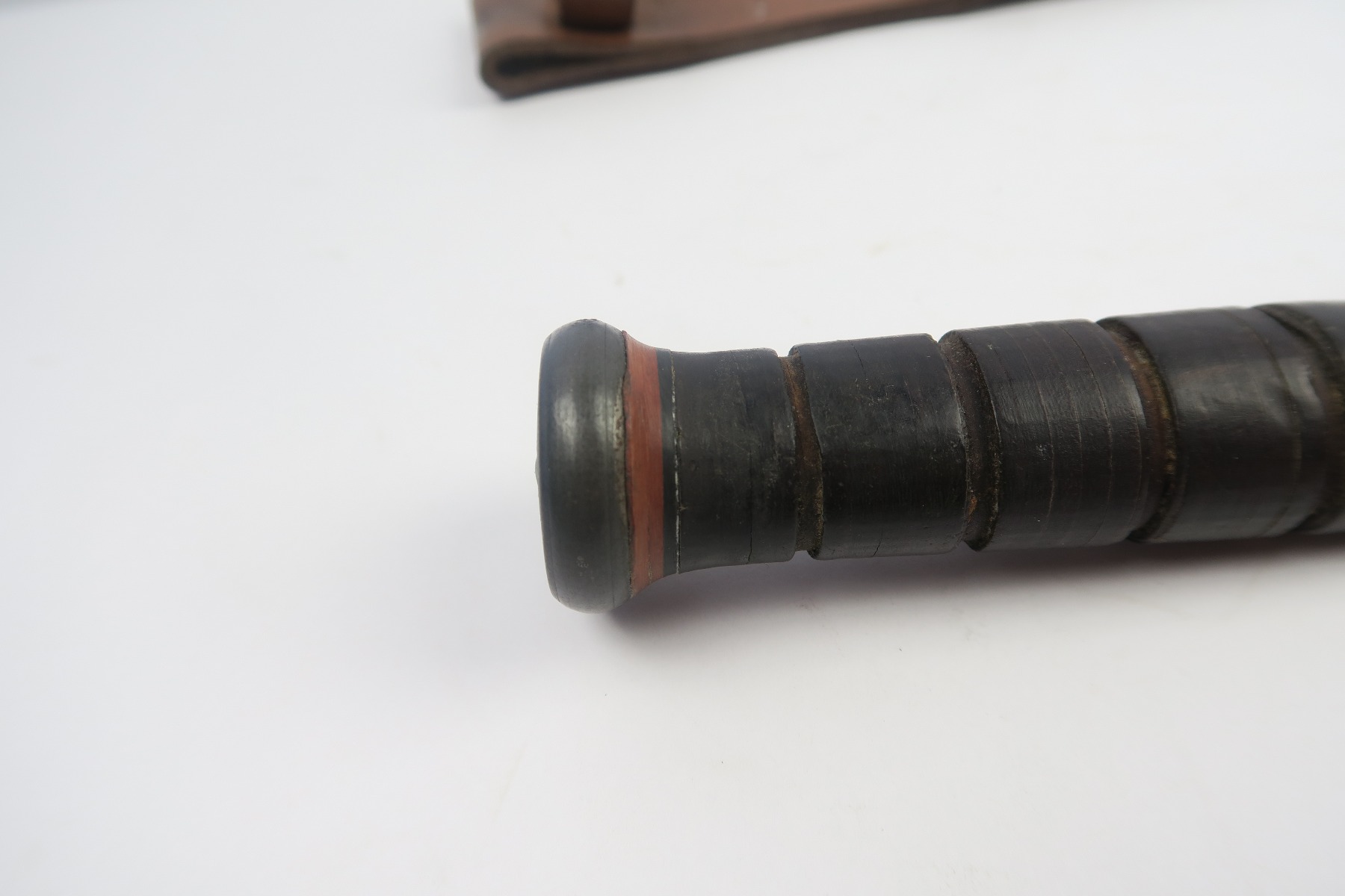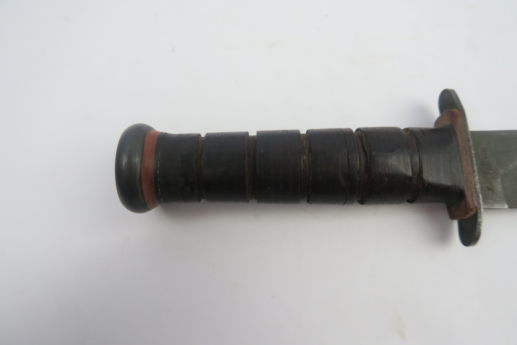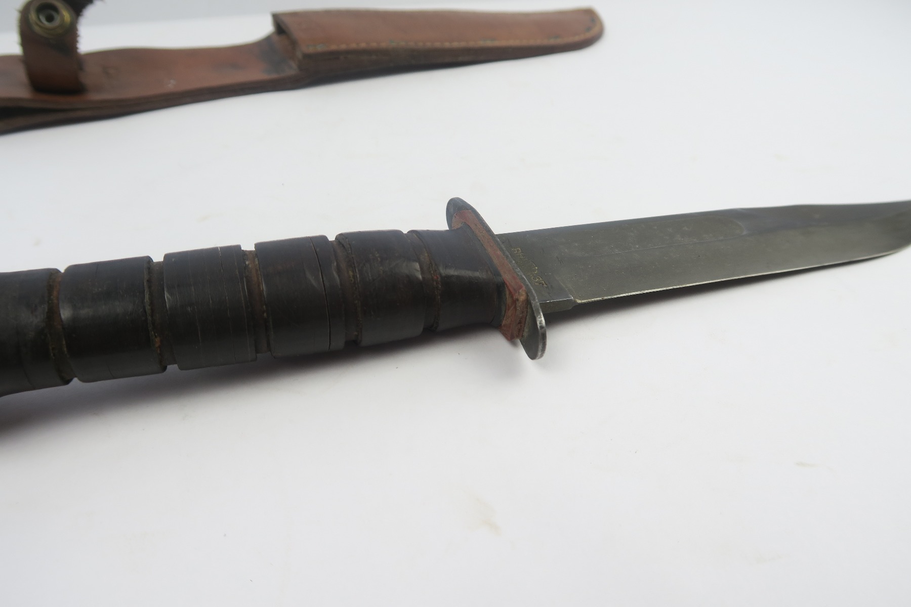 12/28/17 – This is an original PAL model 37 US Navy fighting knife, complete with the original leather scabbard made by BOYT. The blade is in excellent condition with only minor patina and spotting, but no major issues and no signs of sharpening. The left side is maker stamped and marked “RH 37” – the reverse side is “U.S. NAVY” stamped. The blade handle has iconic early red spacers. The scabbard is similarly U.S.N. stamped and marked BOYT with a “4” meaning the scabbard was made in 1944. Guaranteed original and authentic.