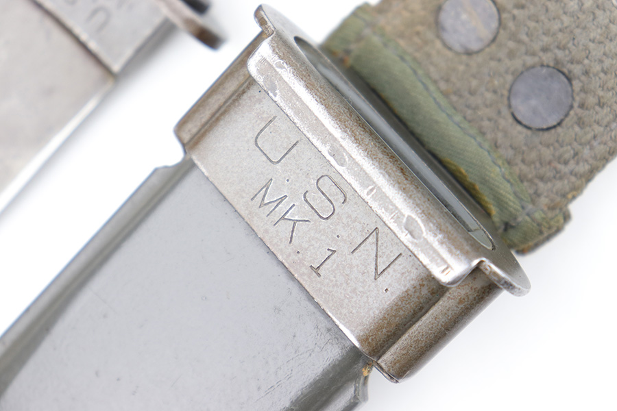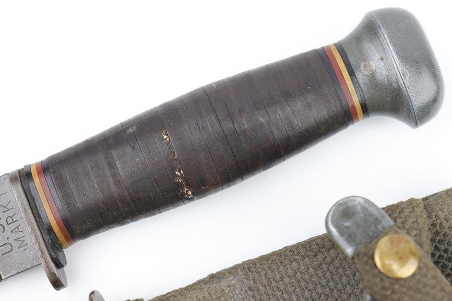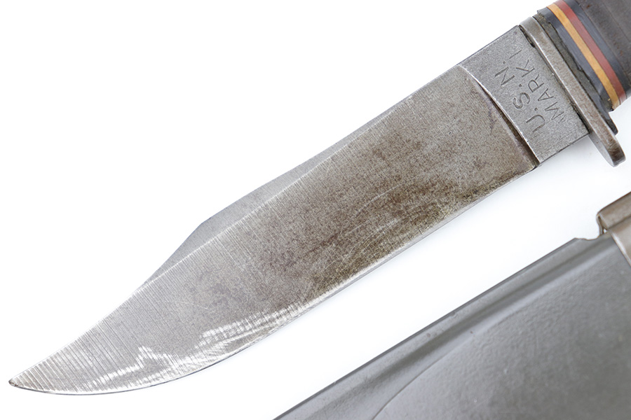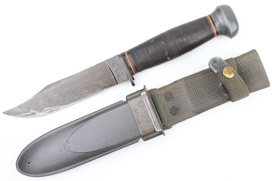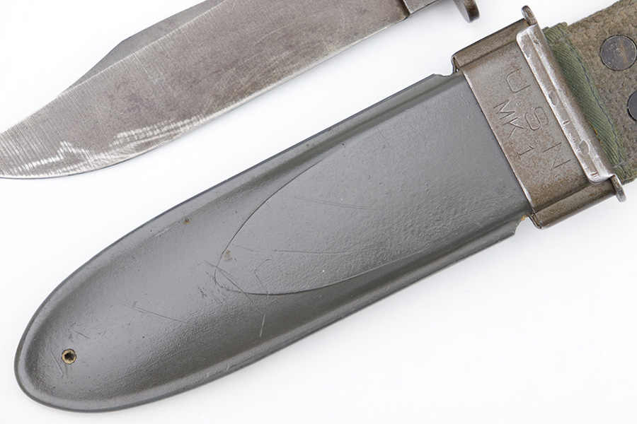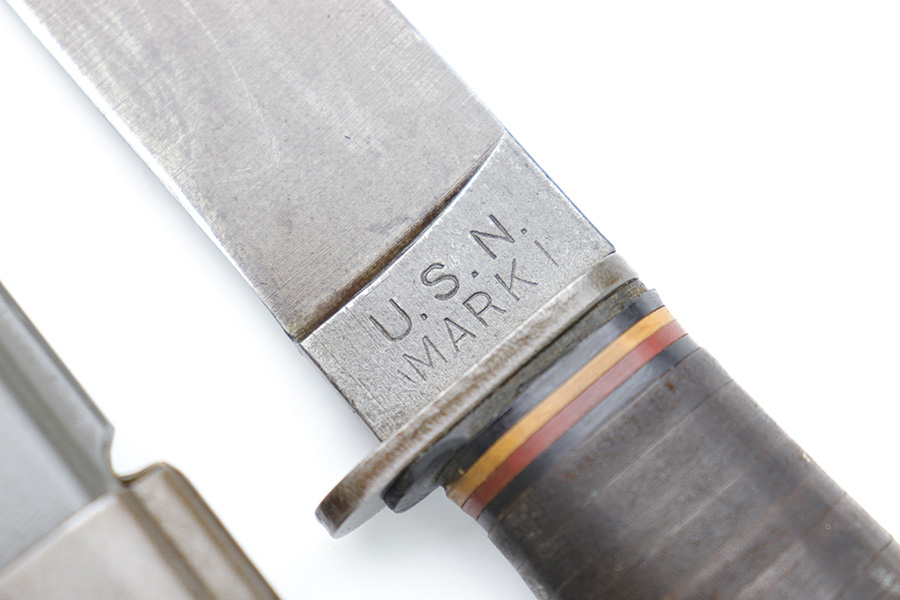 3/24/23 – This is an original WW2 era production USN Mk1 Fighting / Utility knife. The blade is maker stamped as well as USN designation stamped on the ricasso, as shown. The blade edge has been sharpened and there’s dark surface patina throughout the blade, but no rust or pitting. The early style black, white, and red colored spacers are in good condition, as is the handle, but there’s some light aging wear throughout. Comes with an excellent original scabbard.