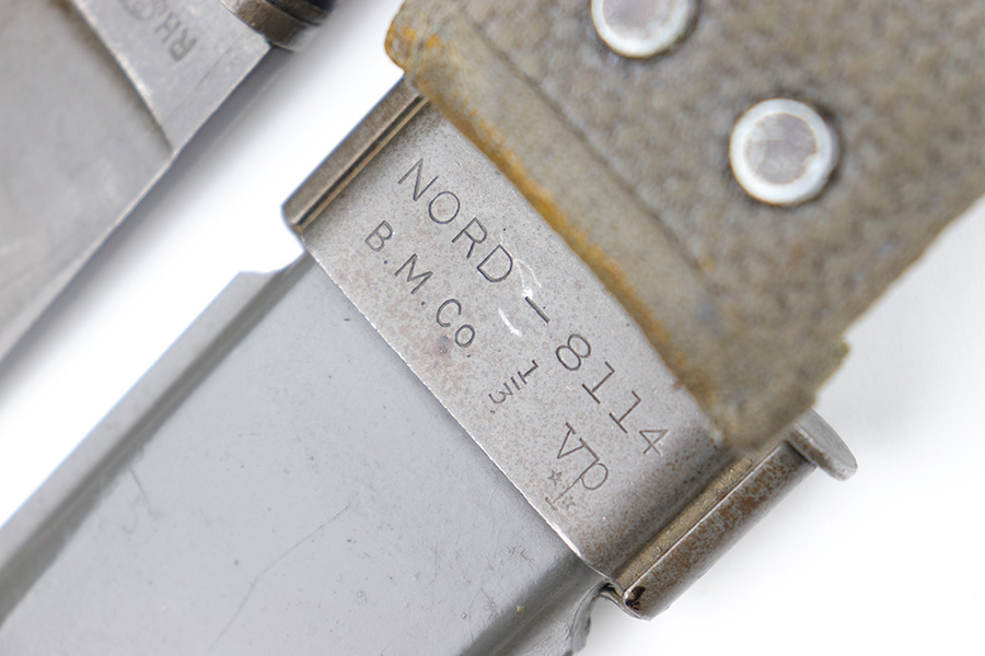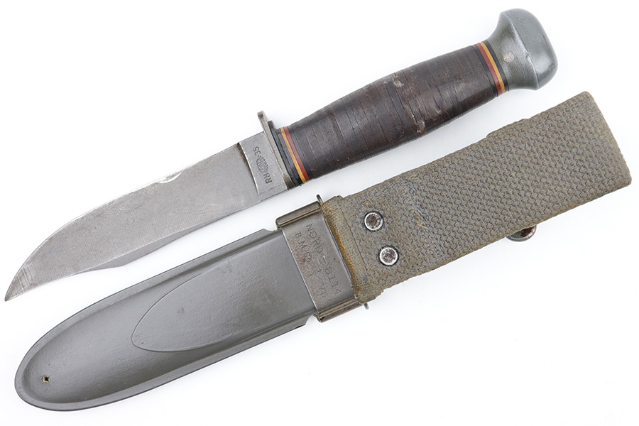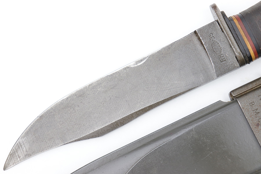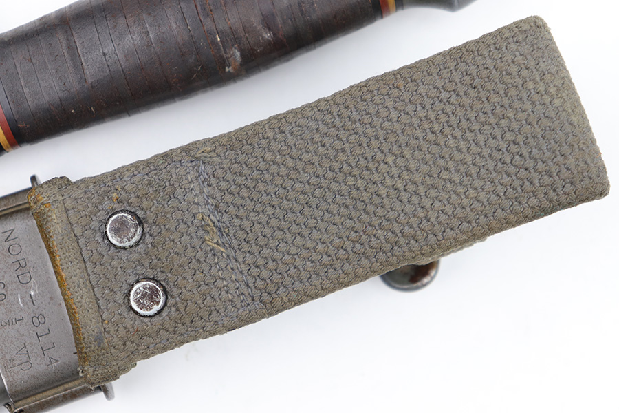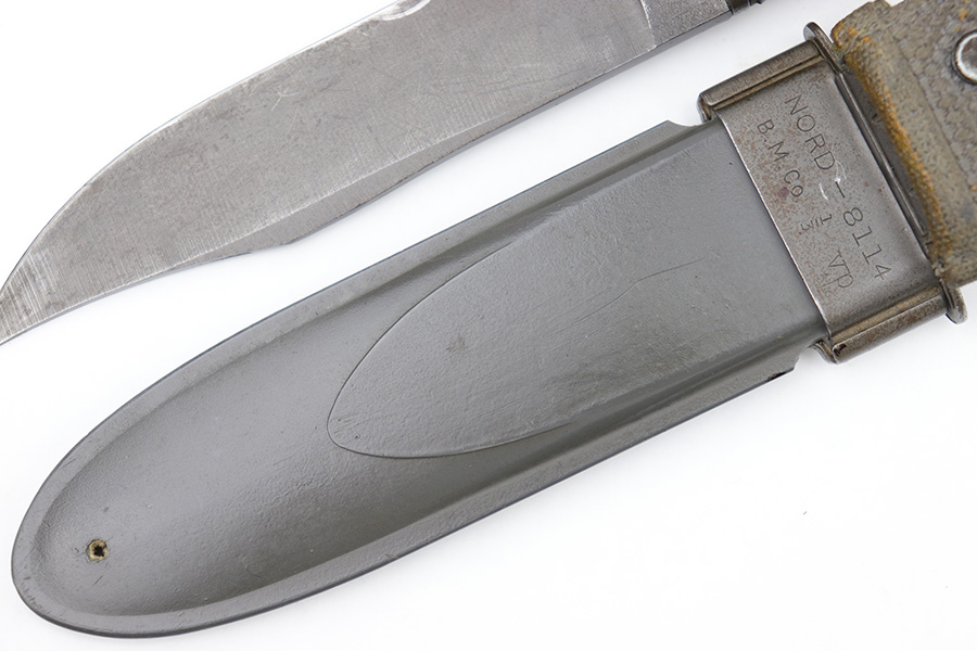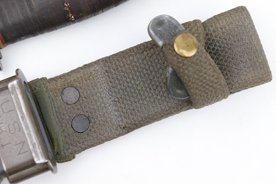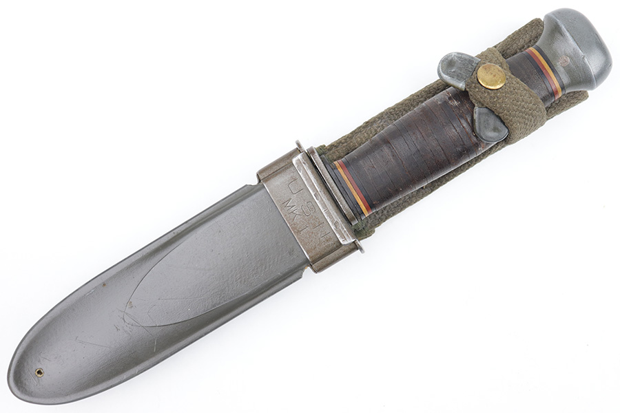 3/24/23 – This is an original WW2 era production USN Mk1 Fighting / Utility knife. The blade is maker stamped as well as USN designation stamped on the ricasso, as shown. The blade edge has been sharpened and there’s dark surface patina throughout the blade, but no rust or pitting. The early style black, white, and red colored spacers are in good condition, as is the handle, but there’s some light aging wear throughout. Comes with an excellent original scabbard.