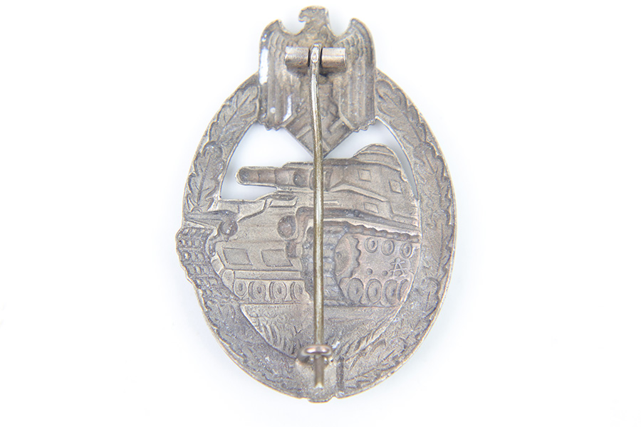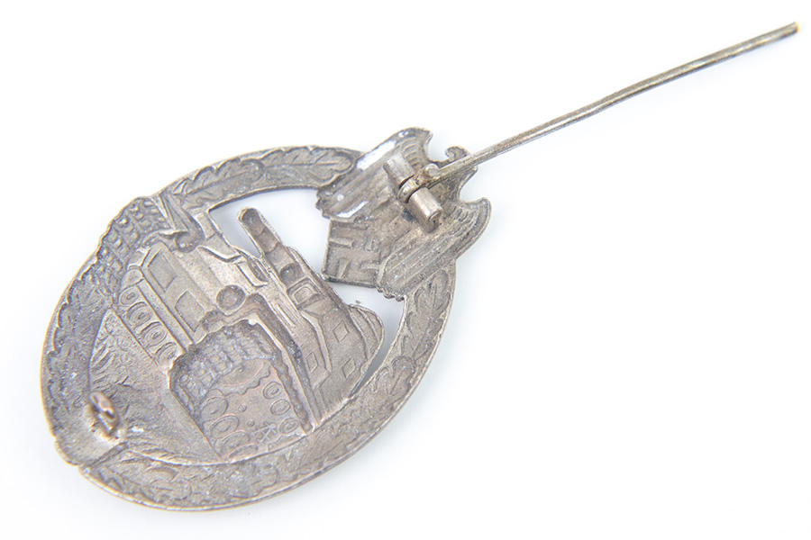 2/21/23 – This is an original WW2 wartime production Panzer Assault Badge. The medal is one piece construction and non-magnetic throughout (zinc construction). The original pin, hook, and hinge are in great shape and functional. There’s typical surface wear / patina throughout but no excessive damage. Maker stamped on the interior as shown.
