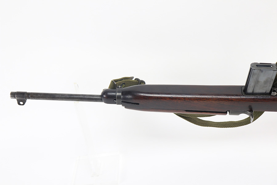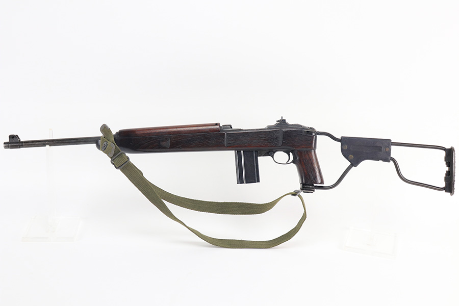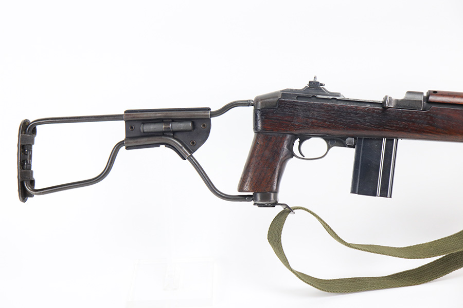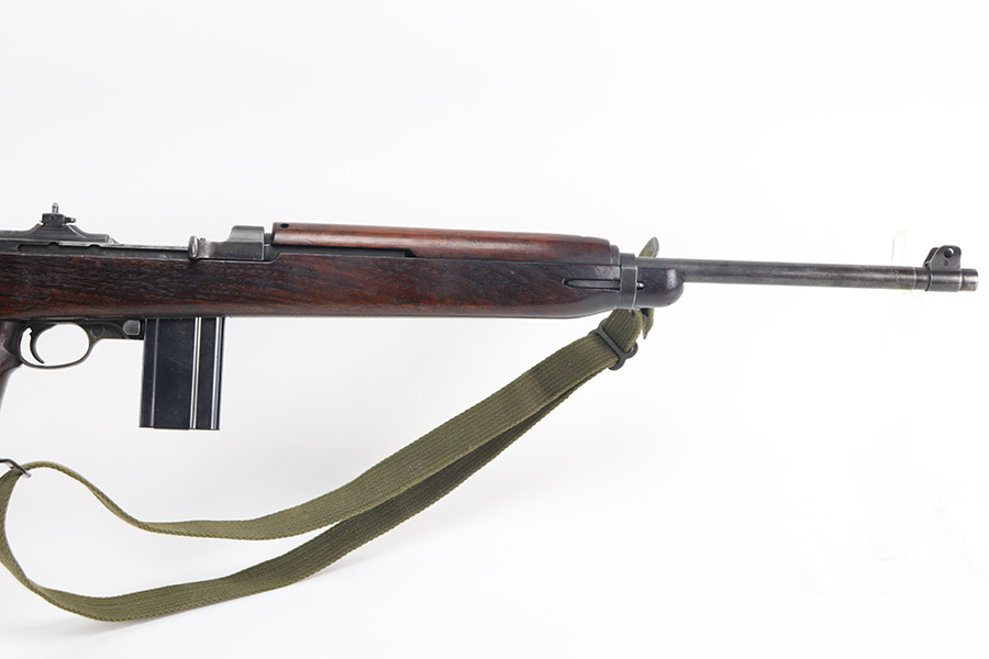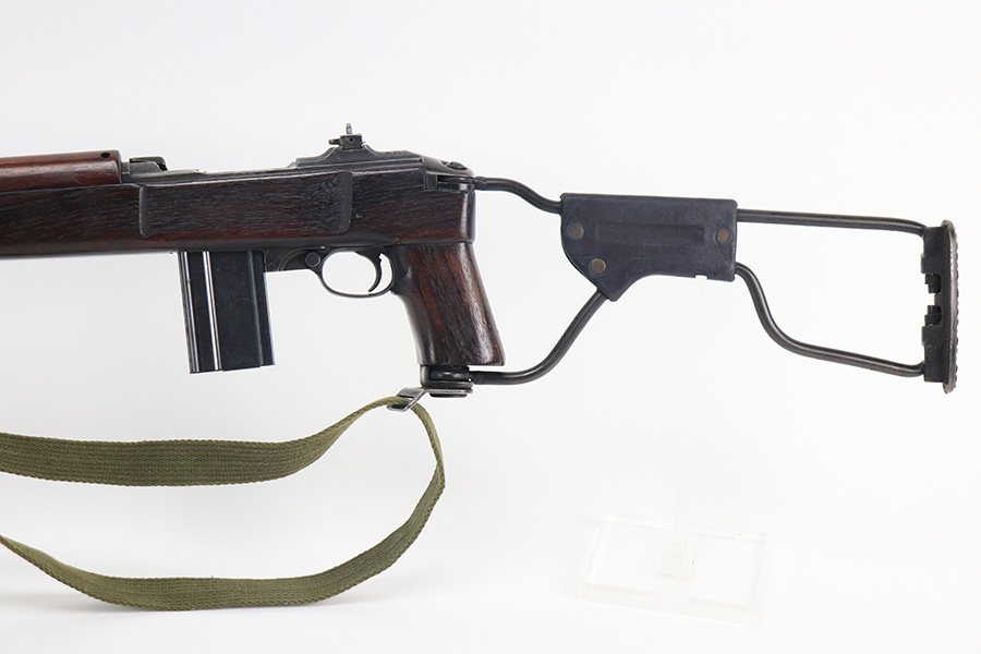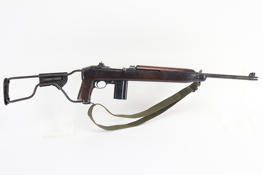 12/14/21 – This is a rare Inland Paratrooper M1A1 carbine in all original condition. It’s an early Type 1 example with flip sight, six digit serial and no bayonet lug. Barrel dated to March of 1943, and Inland parts throughout. Original cheekpad with correct brass rivets. Worn and dinged stock but otherwise pretty nice. Slight hairline crack on left back (see photo). Crossed cannons cartouche on bottom of handle. IO marked as well on inside of handguard. Circle P on the back of the stock. All marking are original and not re-stamped or enhanced. No signs of a bayo lug ever added or removed. No stake marks on the original rear site. Original finish on the metal parts that shows some thinning on the barrel and receiver. Excellent, shiny bore. Comes with original canvas sling.