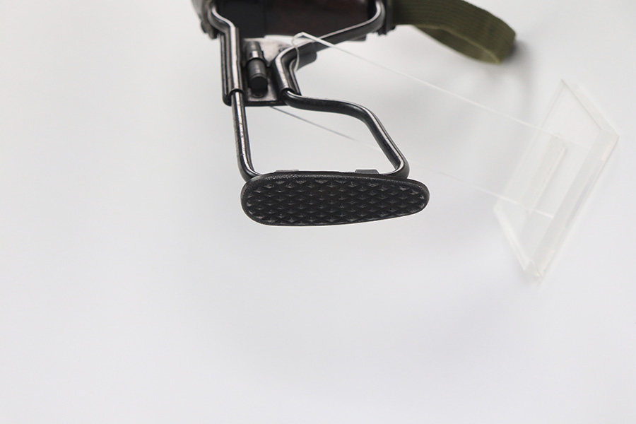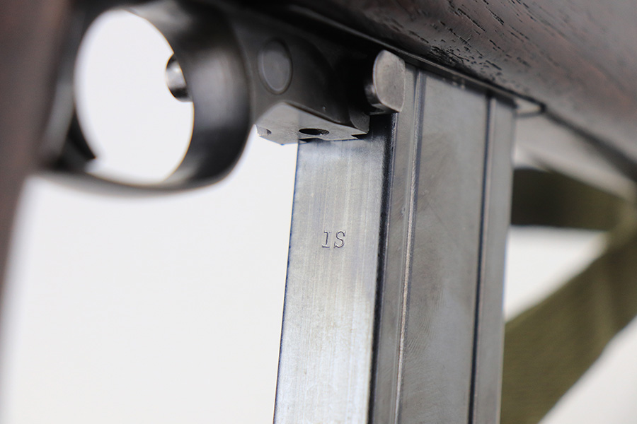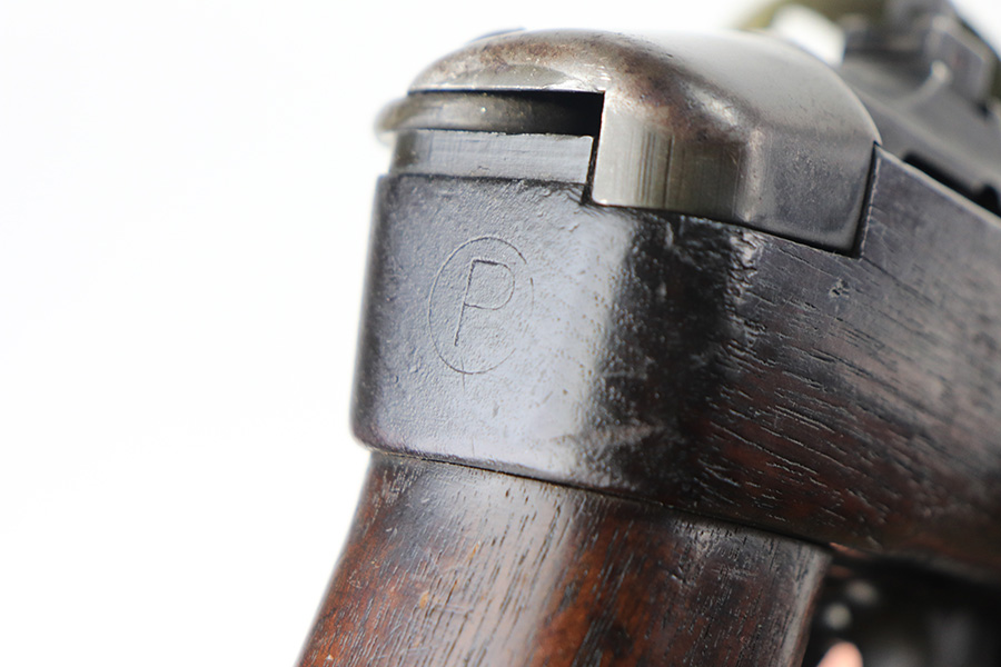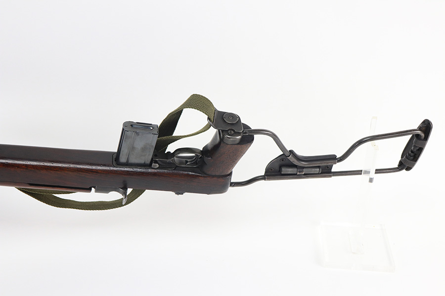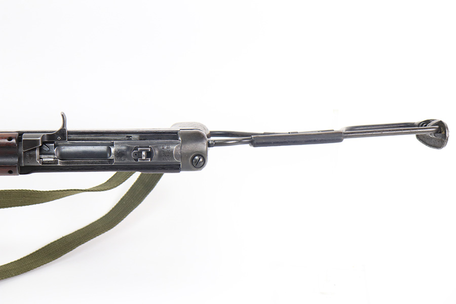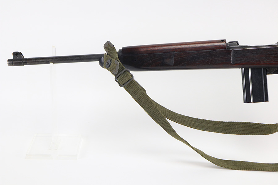 12/14/21 – This is a rare Inland Paratrooper M1A1 carbine in all original condition. It’s an early Type 1 example with flip sight, six digit serial and no bayonet lug. Barrel dated to March of 1943, and Inland parts throughout. Original cheekpad with correct brass rivets. Worn and dinged stock but otherwise pretty nice. Slight hairline crack on left back (see photo). Crossed cannons cartouche on bottom of handle. IO marked as well on inside of handguard. Circle P on the back of the stock. All marking are original and not re-stamped or enhanced. No signs of a bayo lug ever added or removed. No stake marks on the original rear site. Original finish on the metal parts that shows some thinning on the barrel and receiver. Excellent, shiny bore. Comes with original canvas sling.