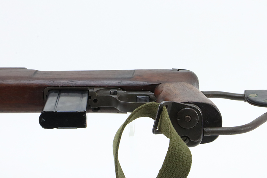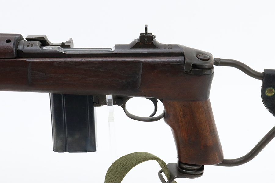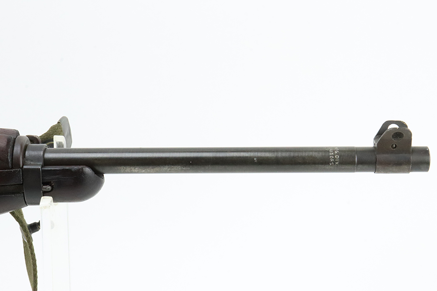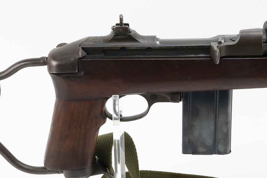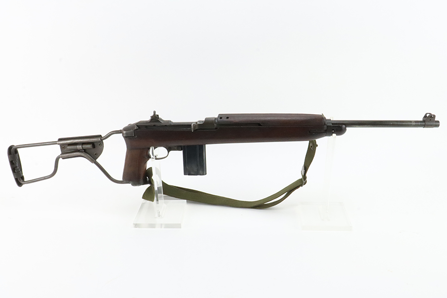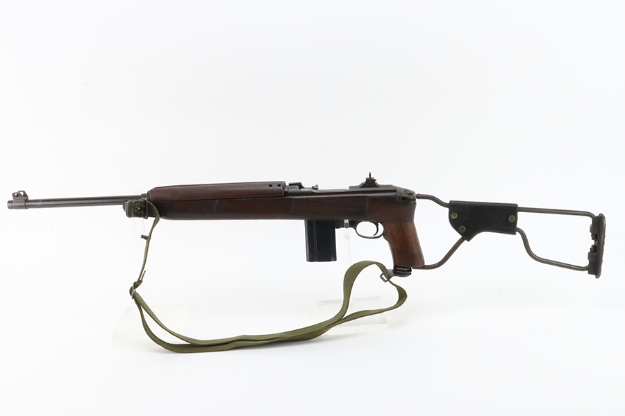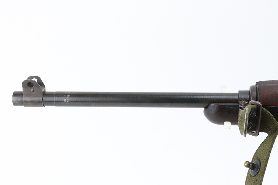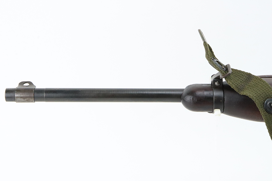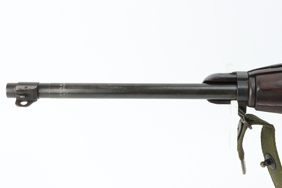 3/11/24 – This is a rare Inland Paratrooper M1A1 carbine in all original condition. It’s an early Type 1 example with flip sight, six digit serial and no bayonet lug. Barrel dated to February of 1943, and Inland parts throughout. Original cheekpad with correct brass rivets. Crossed cannons cartouche on bottom of the grip. IO marked as well on inside of handguard. Circle P on the back of the stock. No signs of a bayo lug ever added or removed. No stake marks on the original rear site. Excellent, original finish that rates about 97%. Mint bore. Comes with a canvas sling and one magazine. A couple of bruises on the left side of the stock. The upper handguard is a little loose.