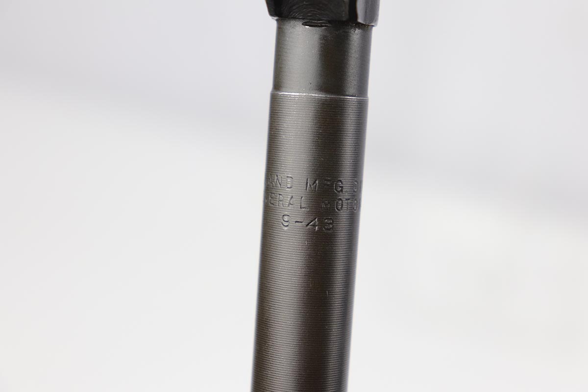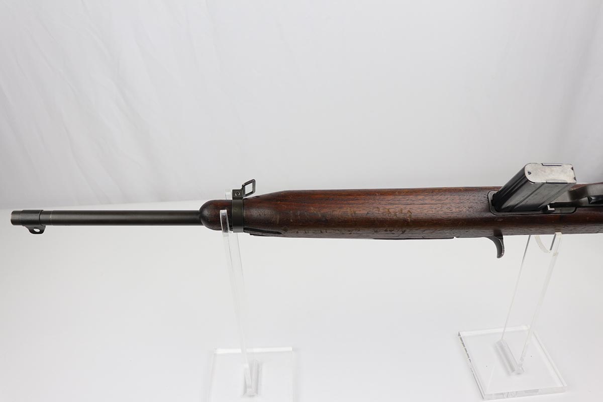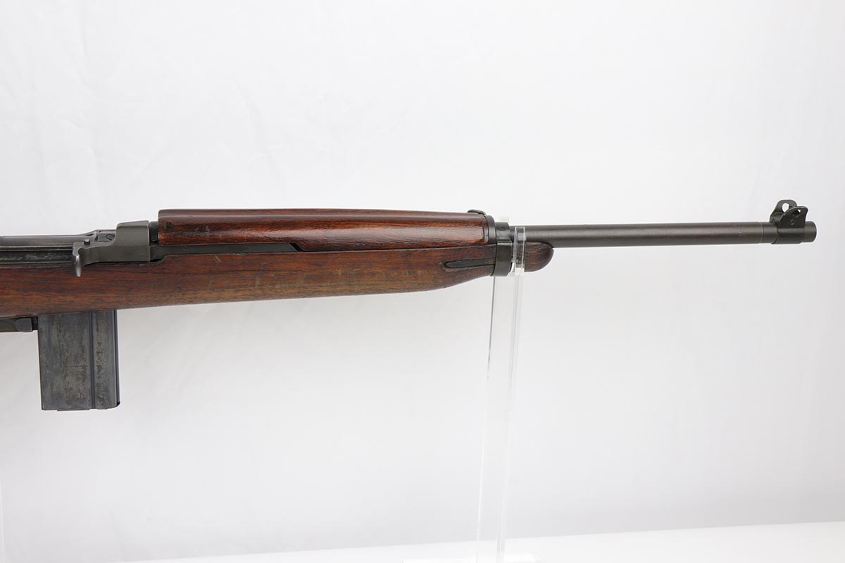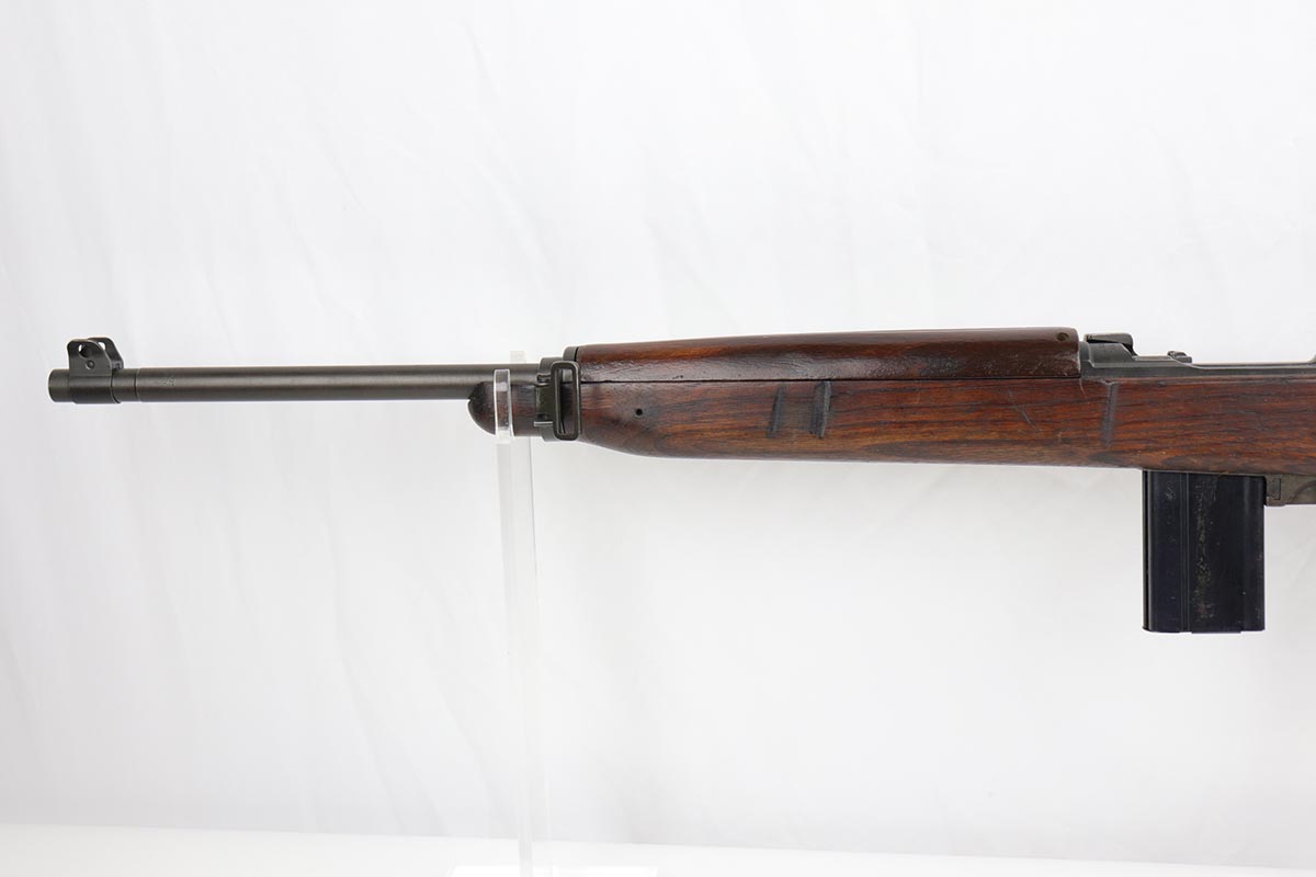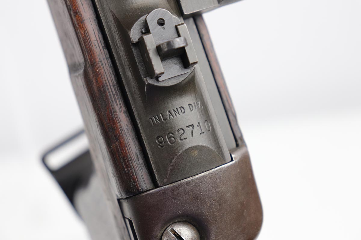 6/18/19 – This is a terrific example of an Inland Paratrooper Carbine, made in September of 1943. It is a type 1 example with original stock and correct (six digit) serial range. The stock is the high wood variant and shows obvious age and wear but no major flaws or cracks. It has the common indentations on the left side where the folded stock presses against the wood. P in circle proof on the back of the stock and IO proofs under the handle and handguard. Original cheek pad and correct IA magazine. The metal parts show excellent original finish, with almost zero finish loss on the receiver or barrel. Rear sight has no signs of staking and the barrel has never had a bayo lug. Mint bore.