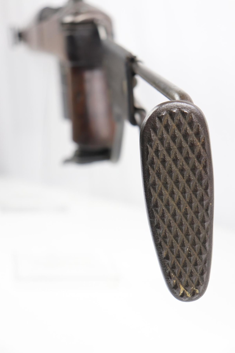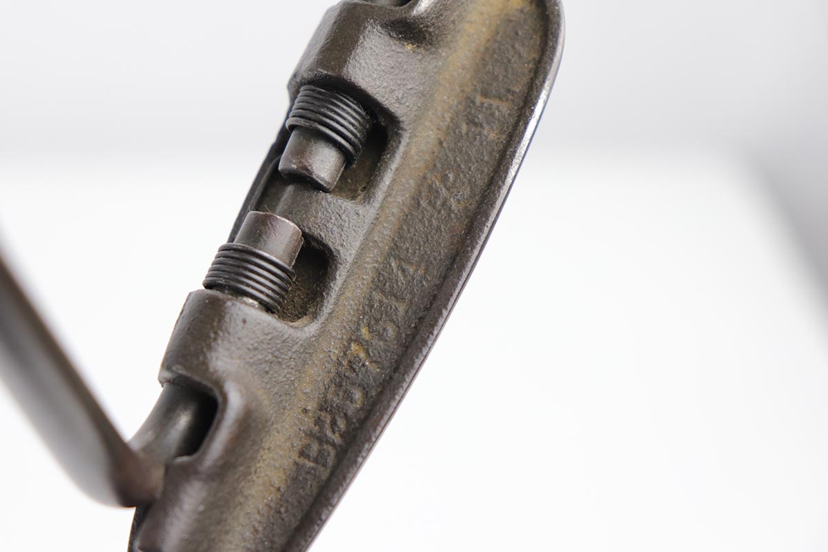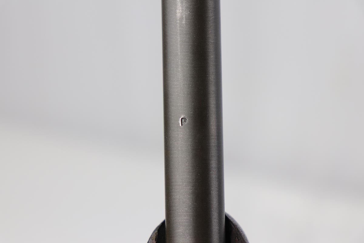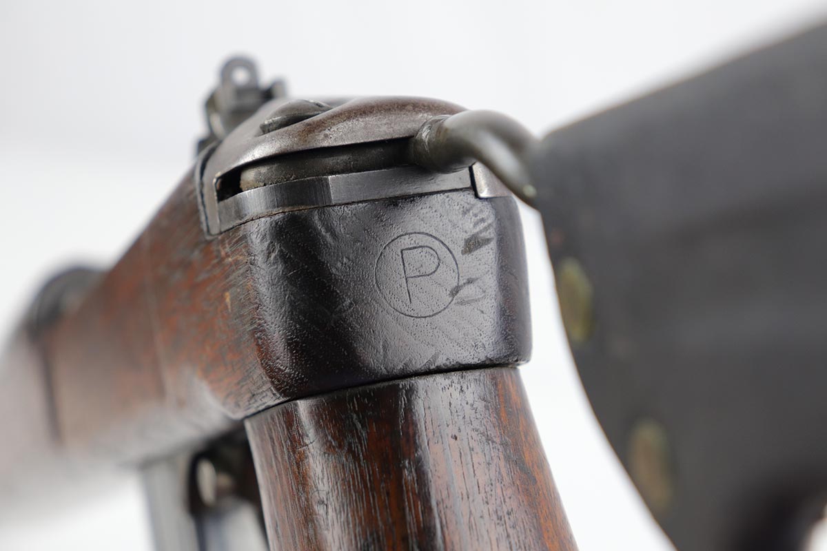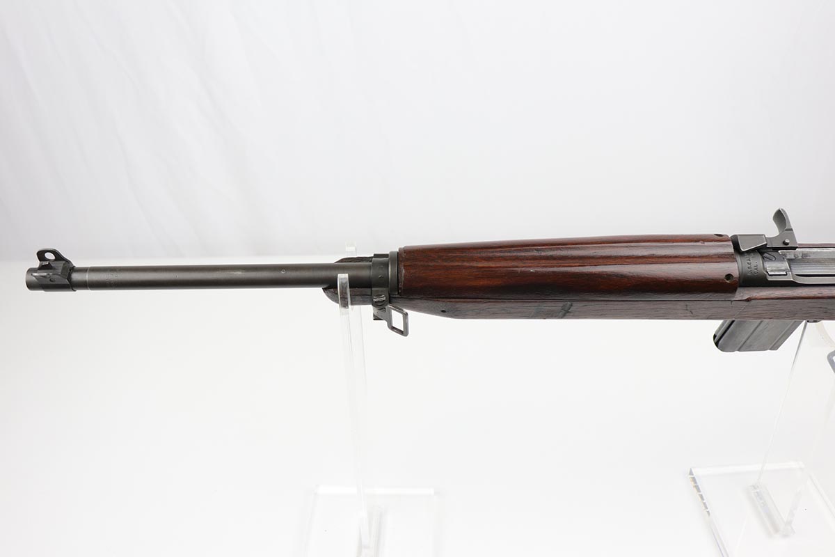 6/18/19 – This is a terrific example of an Inland Paratrooper Carbine, made in September of 1943. It is a type 1 example with original stock and correct (six digit) serial range. The stock is the high wood variant and shows obvious age and wear but no major flaws or cracks. It has the common indentations on the left side where the folded stock presses against the wood. P in circle proof on the back of the stock and IO proofs under the handle and handguard. Original cheek pad and correct IA magazine. The metal parts show excellent original finish, with almost zero finish loss on the receiver or barrel. Rear sight has no signs of staking and the barrel has never had a bayo lug. Mint bore.