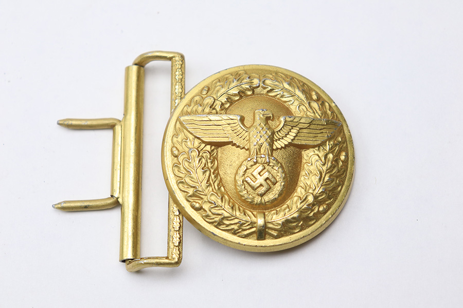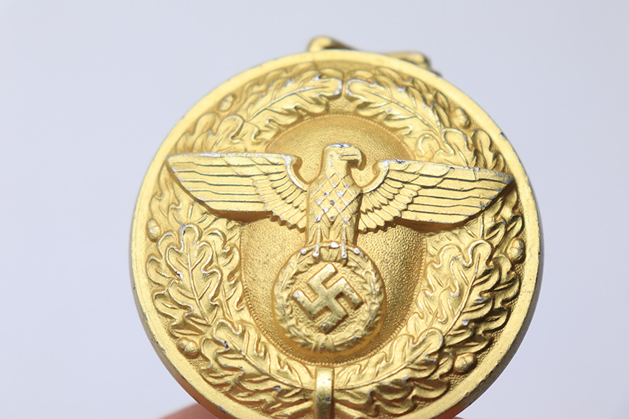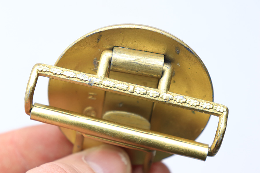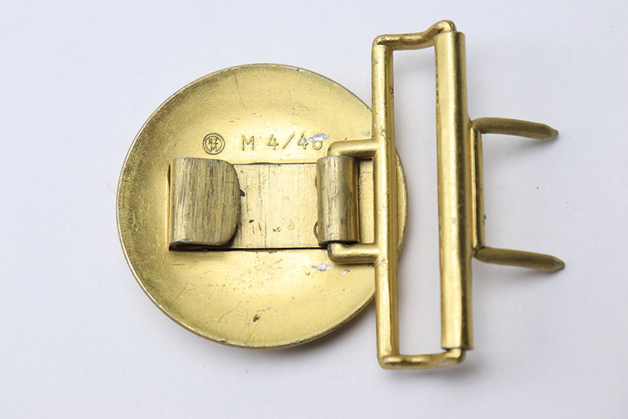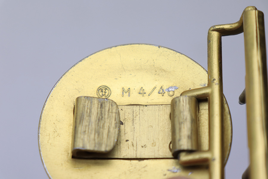 4/6/22 – This is an original WW2 German Party Leader belt buckle. The buckle is in great overall condition with some mild edge wear and light patina, but generally has excellent gold washed finish. The reverse is RZM maker stamped as shown.