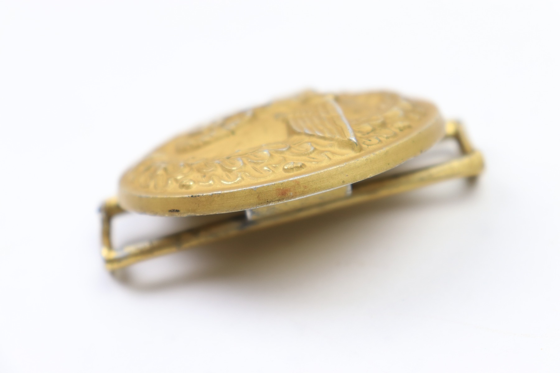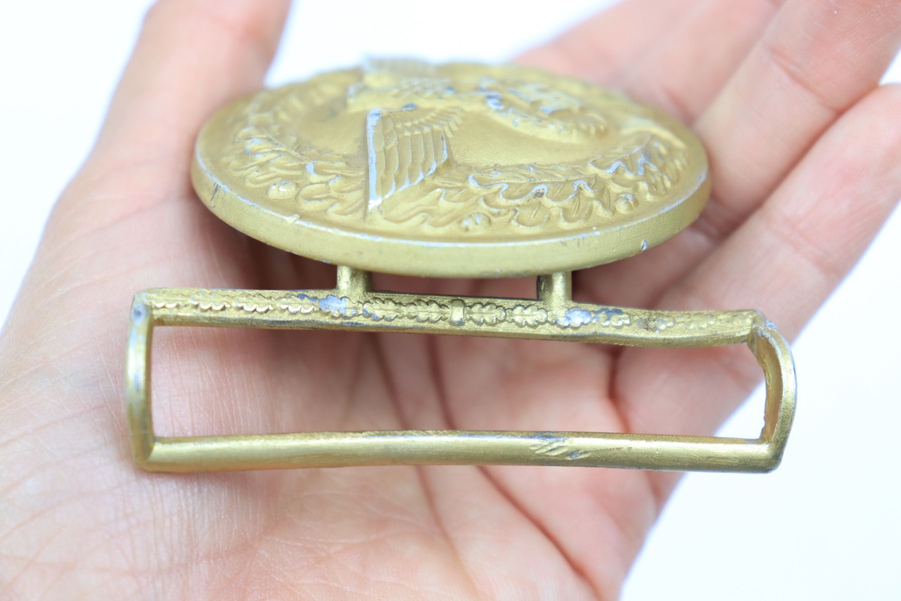 6/28/22 – This is an original RZM stamped Party Leader belt buckle from WW2. The buckle is in great condition with some mild finish loss of the gold-washed finish. This is mostly along the high edges of the eagle wings, talons, and exterior wreath. The reverse is maker stamped “RZM M4/24” and in great condition.