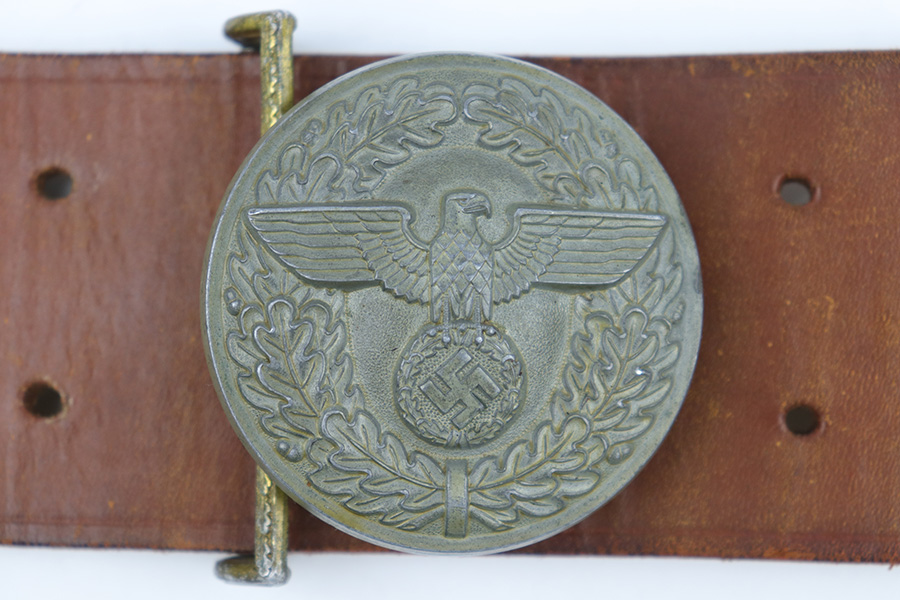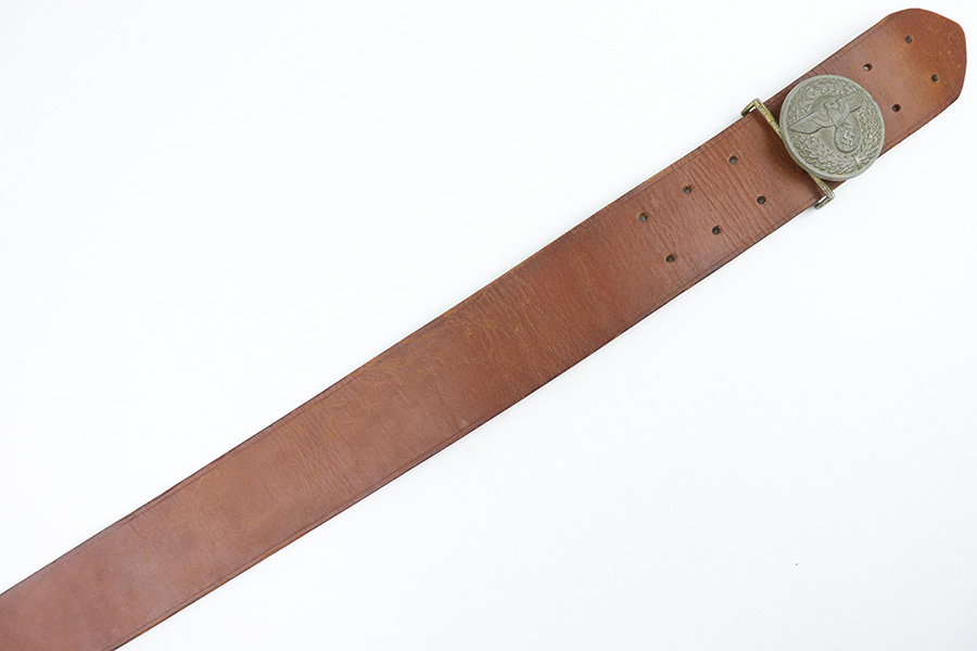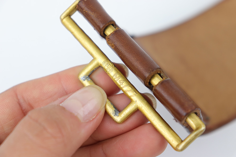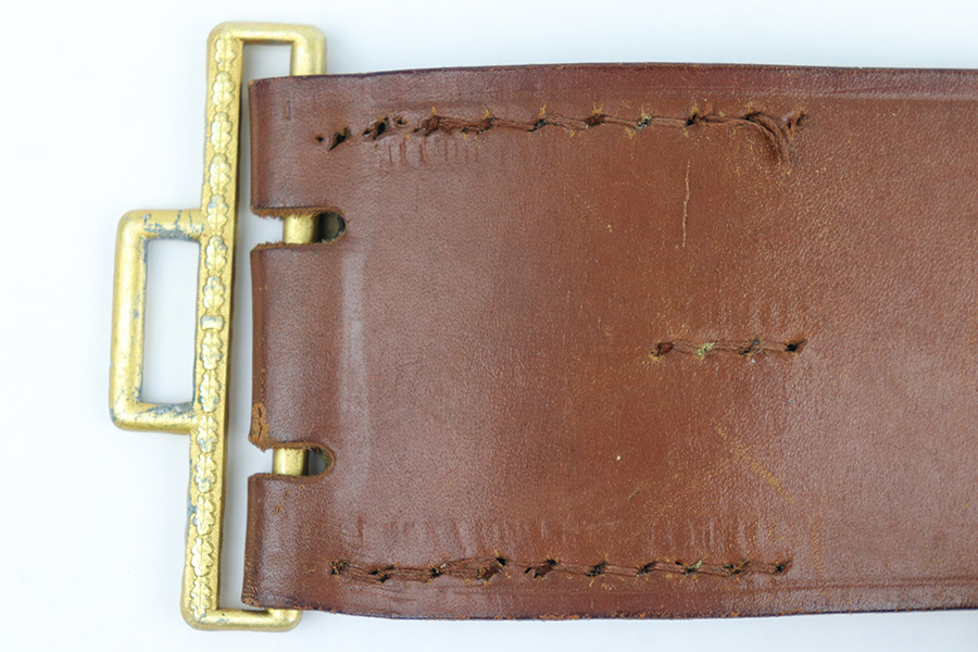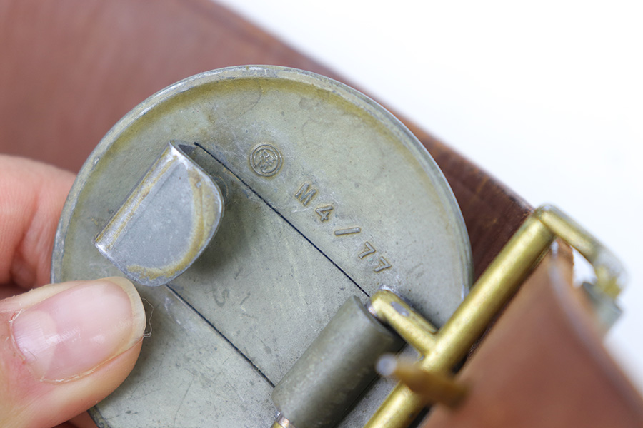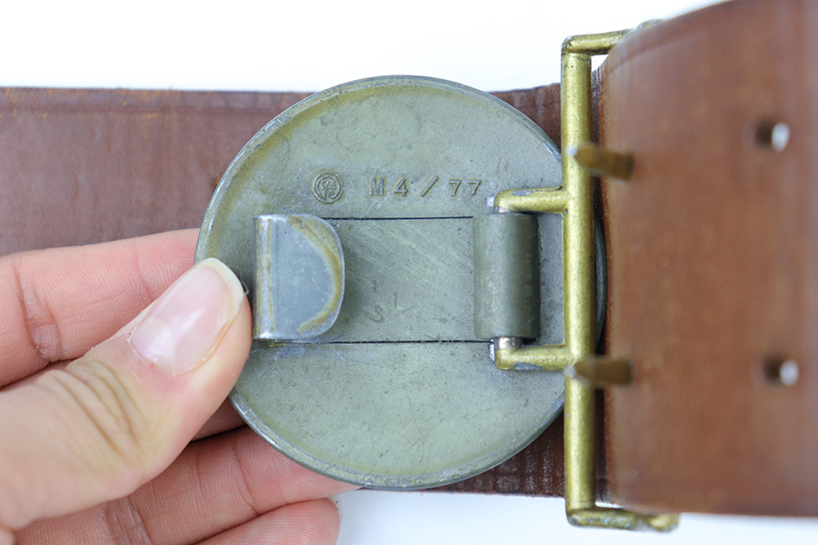 3/25/23 – This is an original RZM Political Leader Belt and Buckle. The buckle is maker stamped “RZM M4/77” which is the code for Gebrüder Gloerfeld. The buckle is made of zinc and was finished with a gold gilding. Most of the gold colored finish has worn off, leaving a natural gray metal look. There is very little dark patina or discoloration from age on the buckle, and the detail is excellent. The leather belt is excellent as well with minimal surface wear and no cracking.