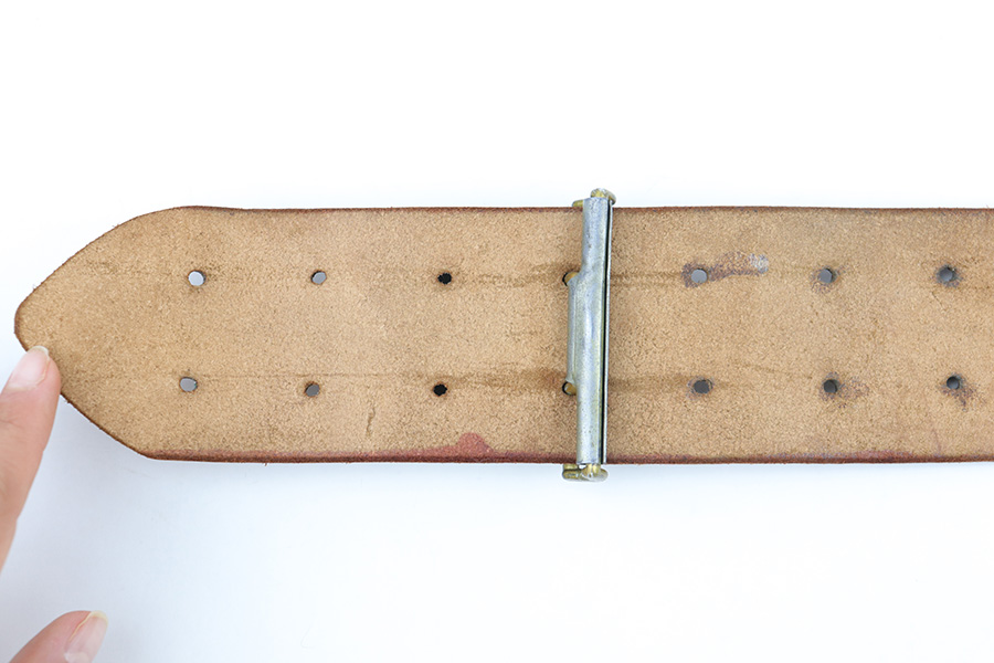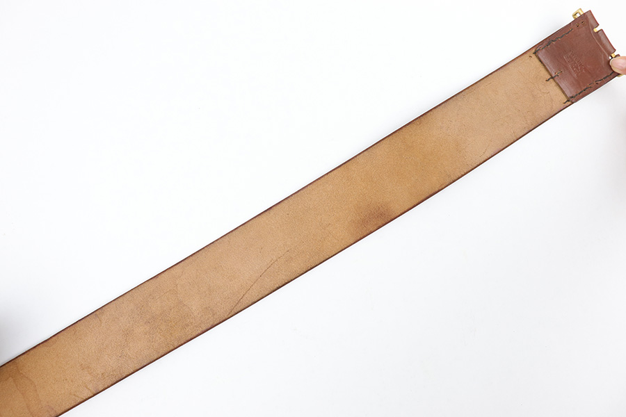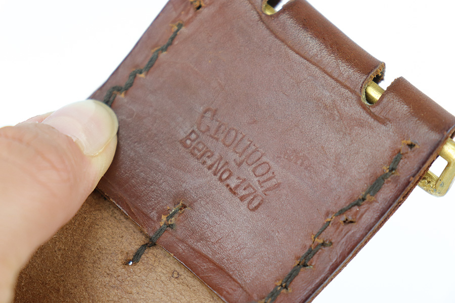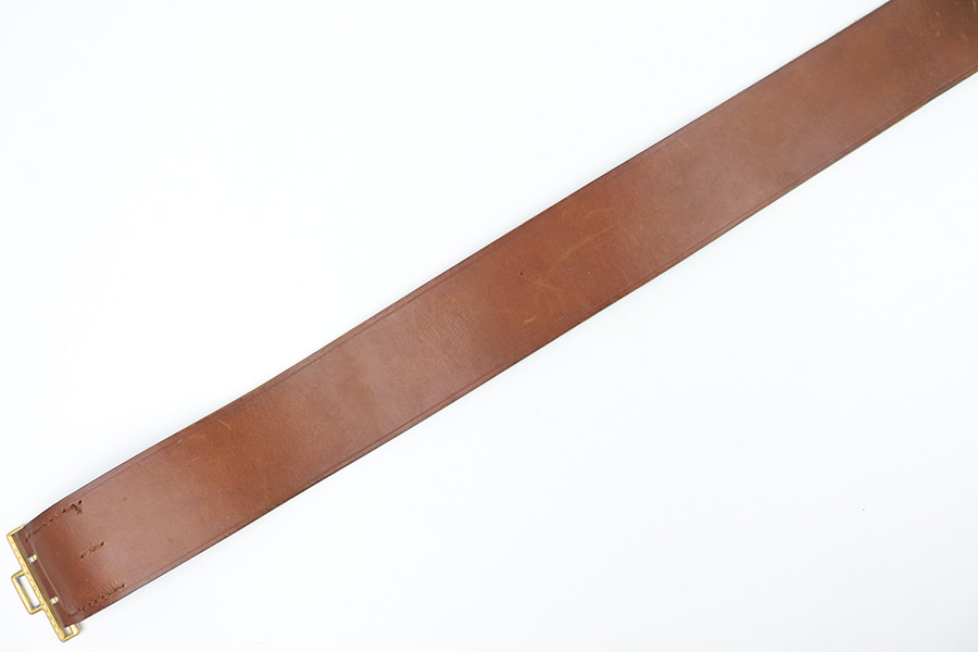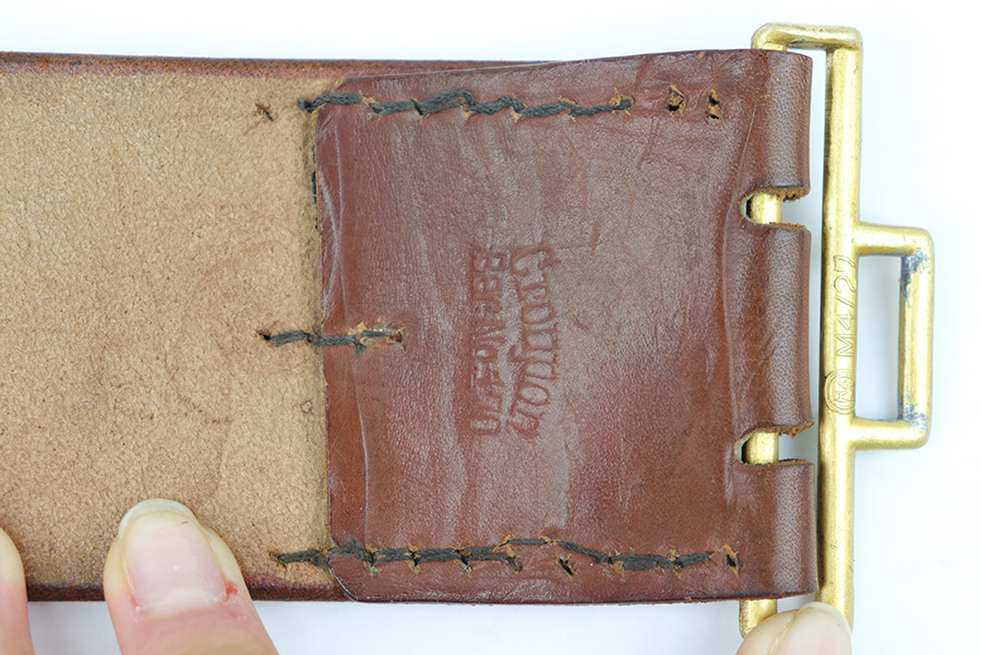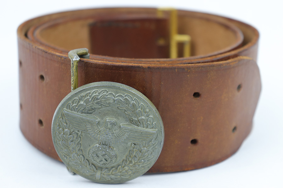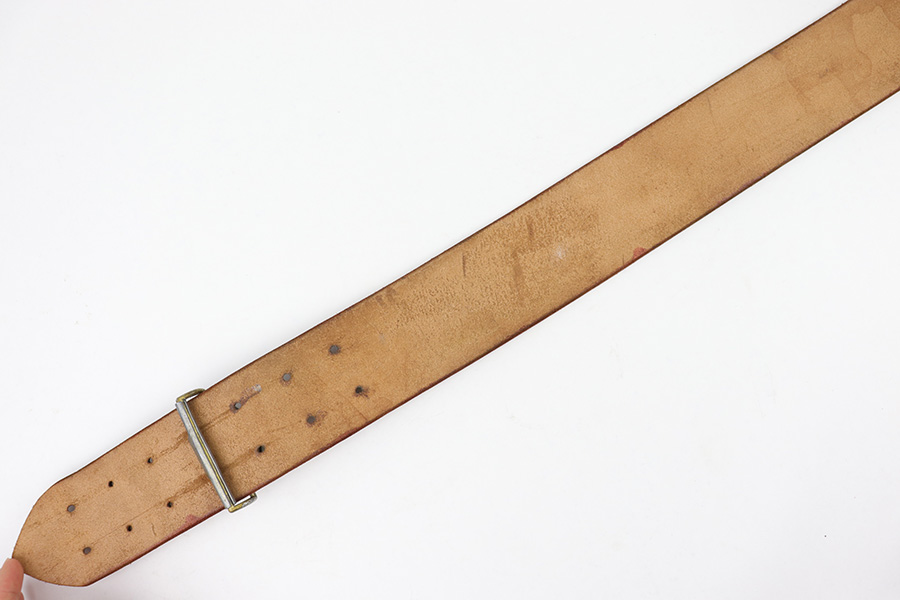 3/25/23 – This is an original RZM Political Leader Belt and Buckle. The buckle is maker stamped “RZM M4/77” which is the code for Gebrüder Gloerfeld. The buckle is made of zinc and was finished with a gold gilding. Most of the gold colored finish has worn off, leaving a natural gray metal look. There is very little dark patina or discoloration from age on the buckle, and the detail is excellent. The leather belt is excellent as well with minimal surface wear and no cracking.