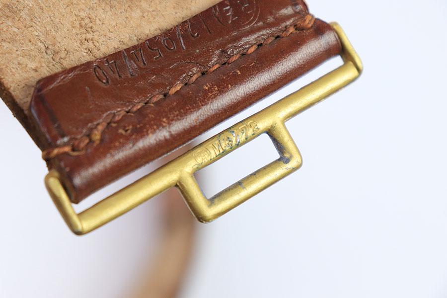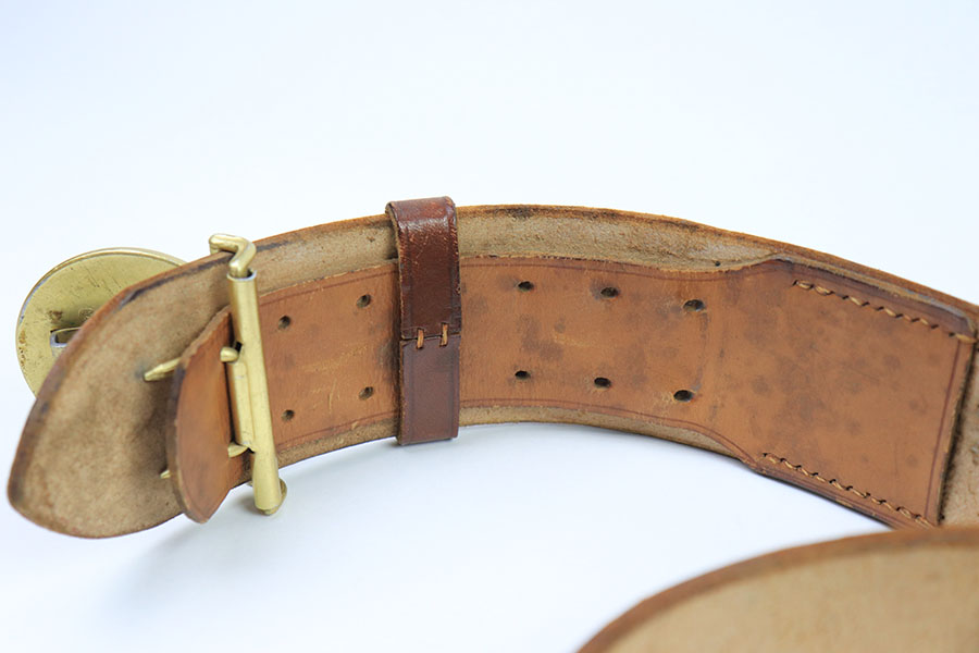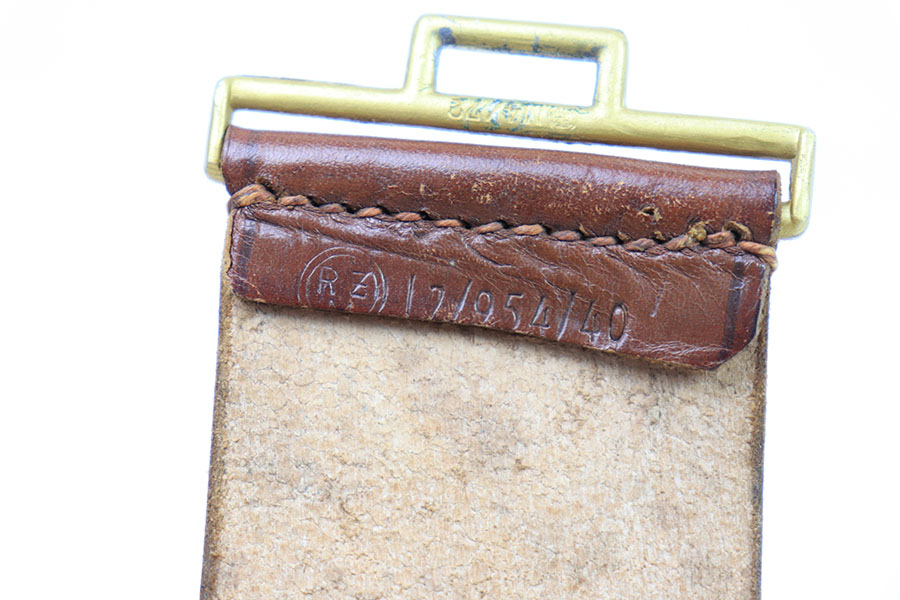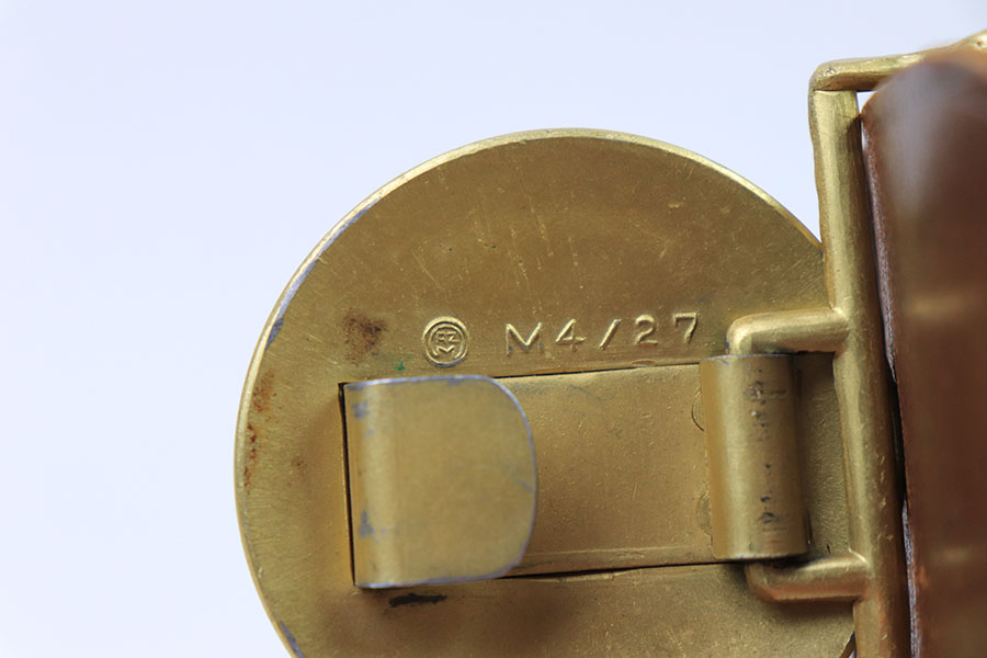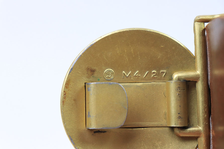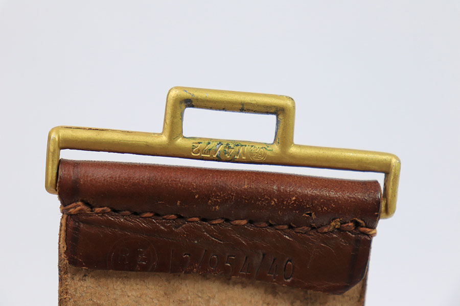 7/26/21 – This is an original WW2 era Party Leader belt and buckle. The buckle has very minimal patina or edge wear, and is excellent overall. RZM M4/27 stamped on the interior. The belt has very nice, strong and clean leather throughout. The only issue is the additional holes punched into the leather, as shown. These holes go almost entirely around the length of the leather belt. The end tab of the belt is also RZM stamped as shown. Great overall condition.