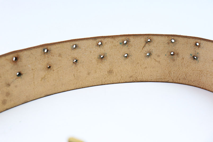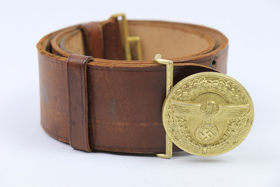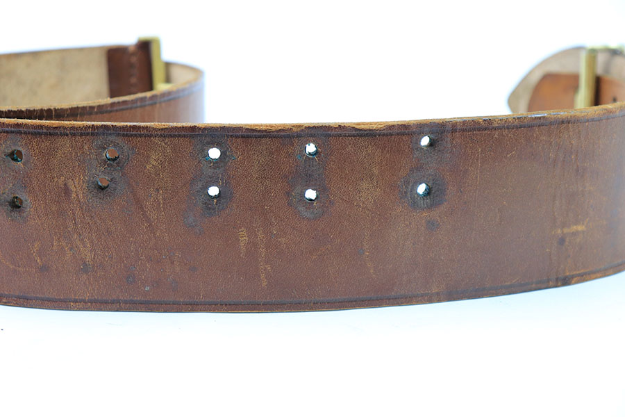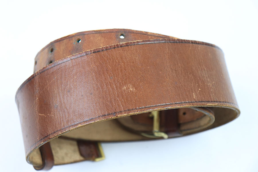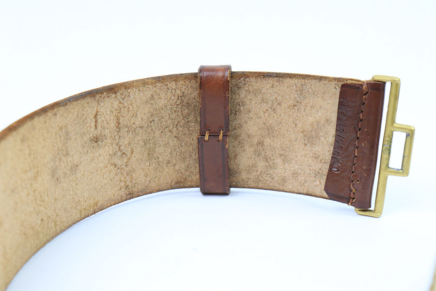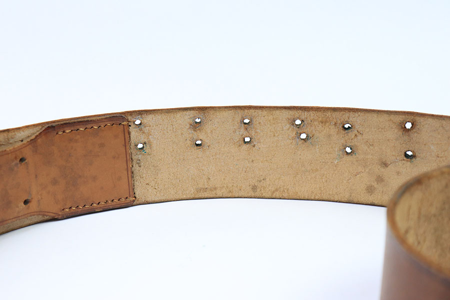 7/26/21 – This is an original WW2 era Party Leader belt and buckle. The buckle has very minimal patina or edge wear, and is excellent overall. RZM M4/27 stamped on the interior. The belt has very nice, strong and clean leather throughout. The only issue is the additional holes punched into the leather, as shown. These holes go almost entirely around the length of the leather belt. The end tab of the belt is also RZM stamped as shown. Great overall condition.