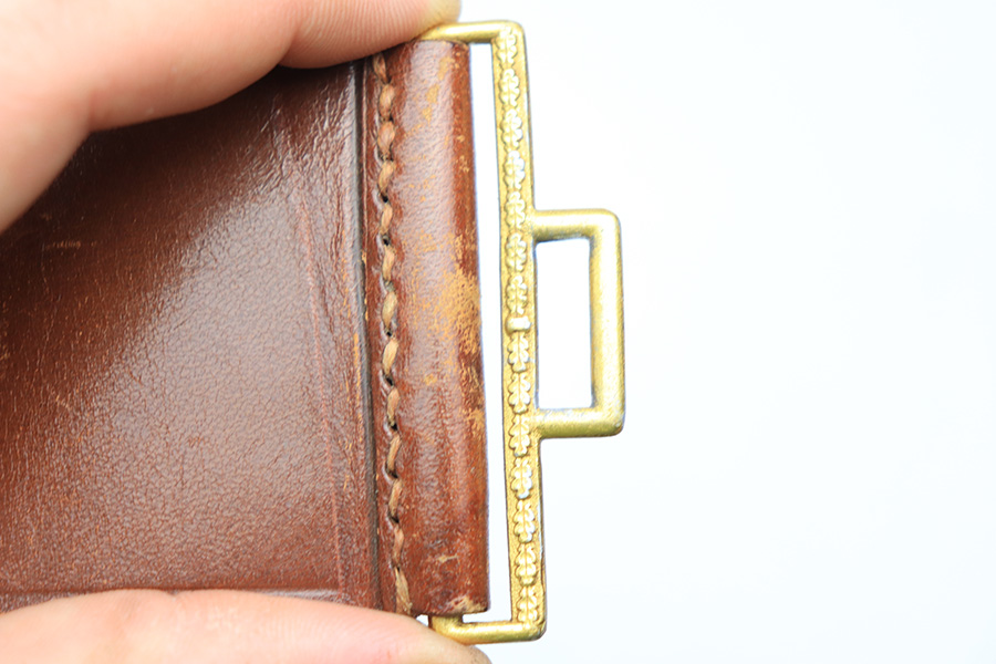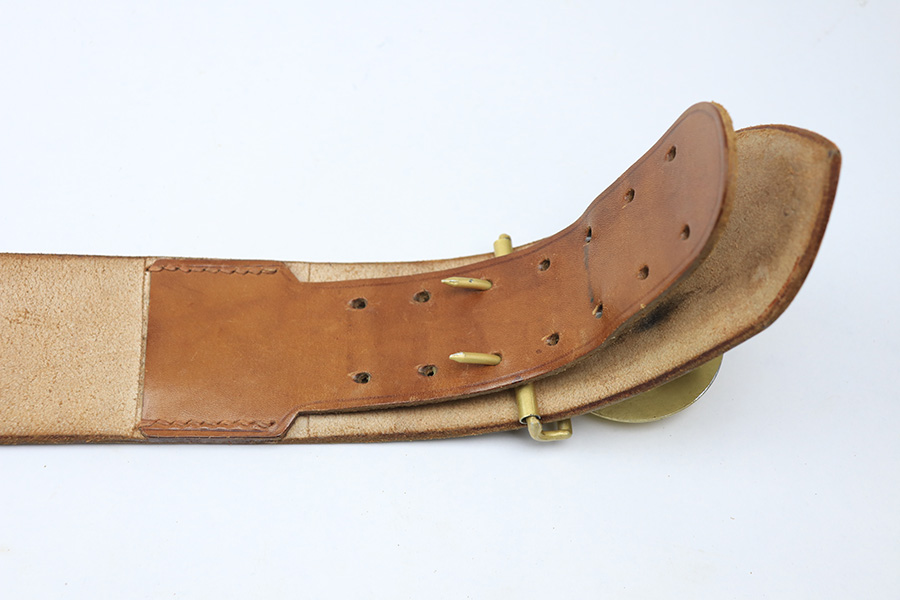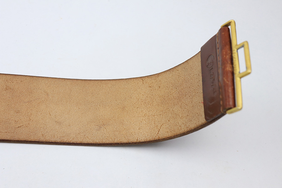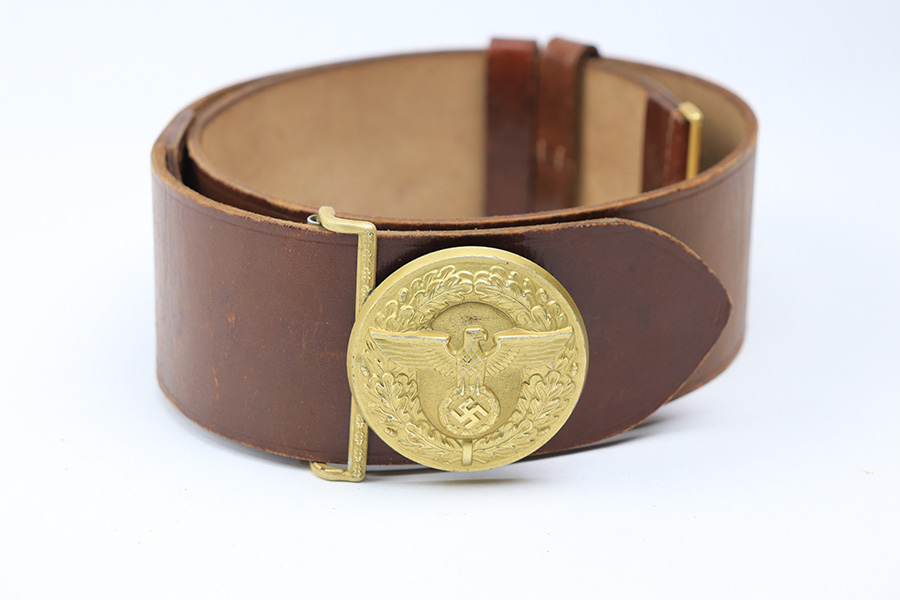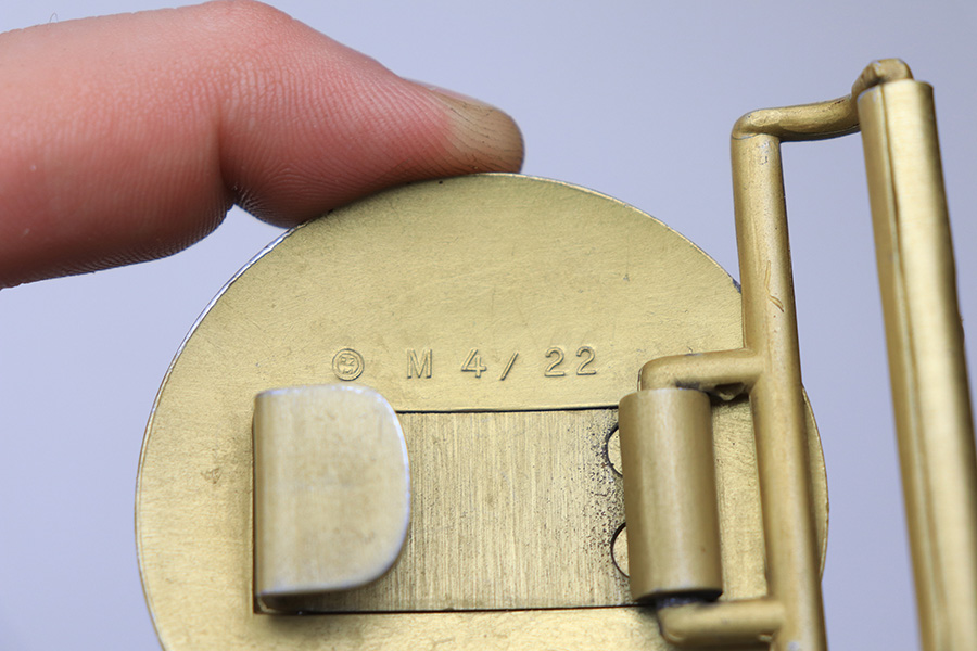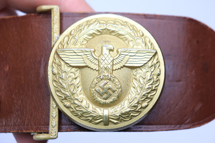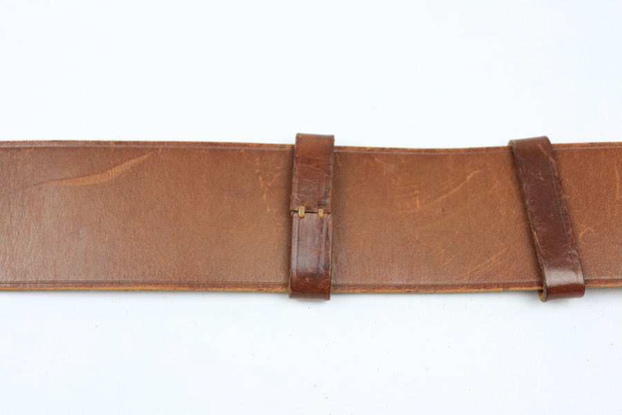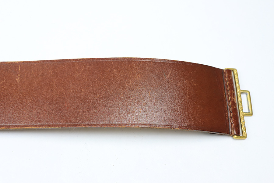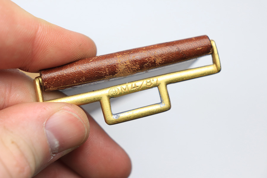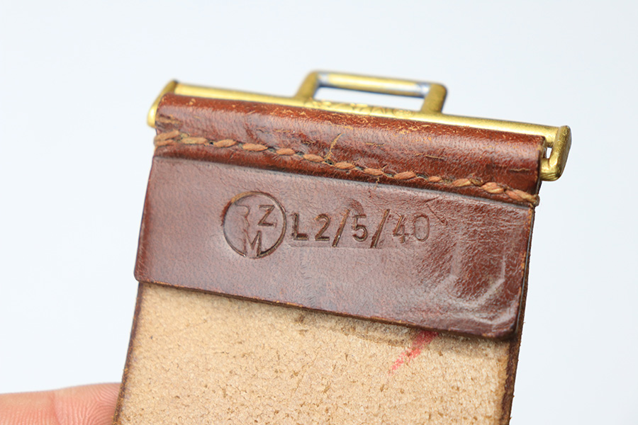 1/6/22 – This is an original Party Leader uniform belt and buckle from WW2. These are fairly scarce and pair well with a Party Leader PPK. The buckle is in great condition with some mild edge wear and patina. The interior is RZM maker code stamped by Christian Theodor Dicke. The leather belt has some surface wrinkling but no significant cracks or chips. The leather is RZM Maker stamped, as is the metal hooked end of the belt. See photos. Great overall condition.