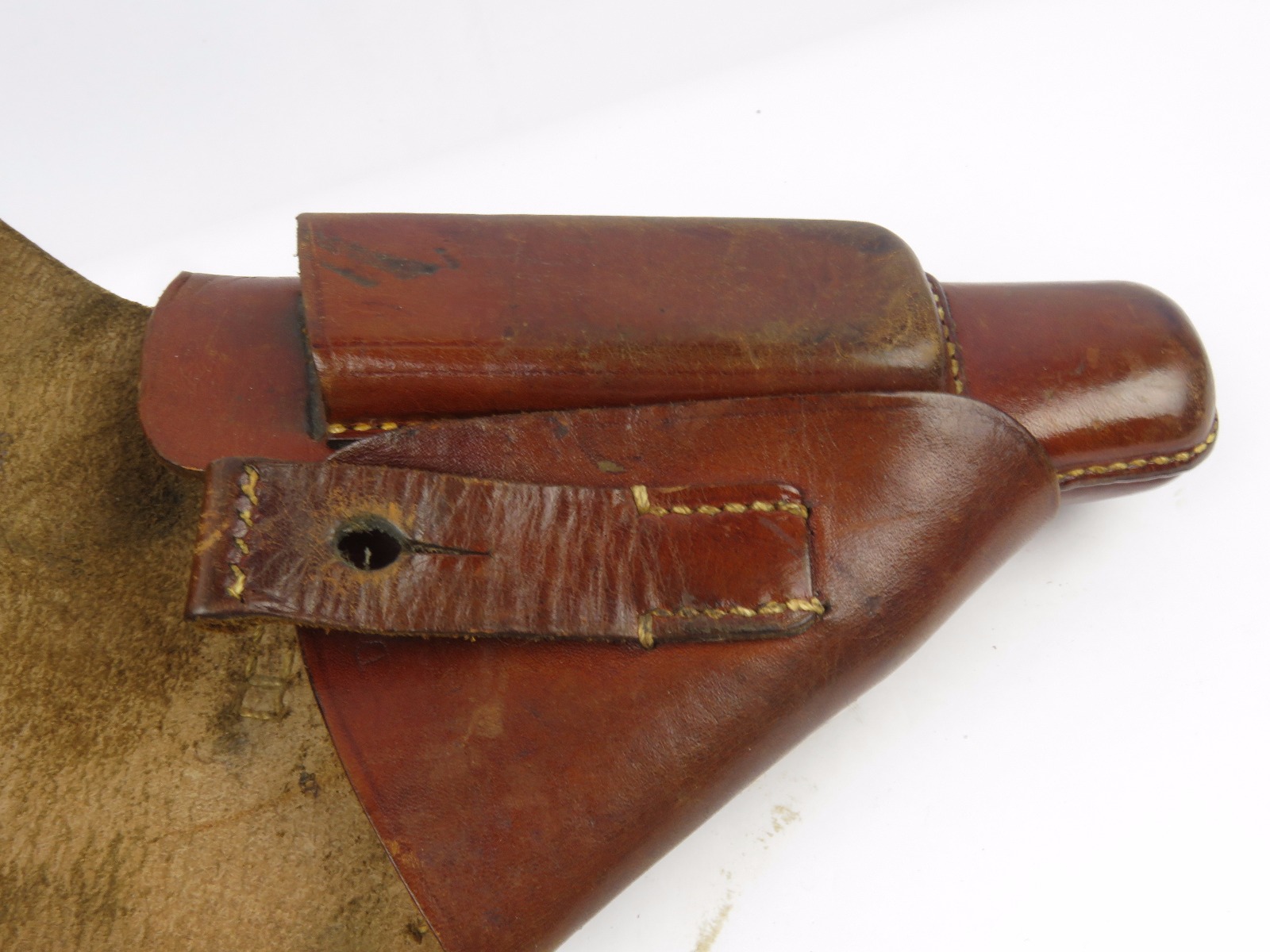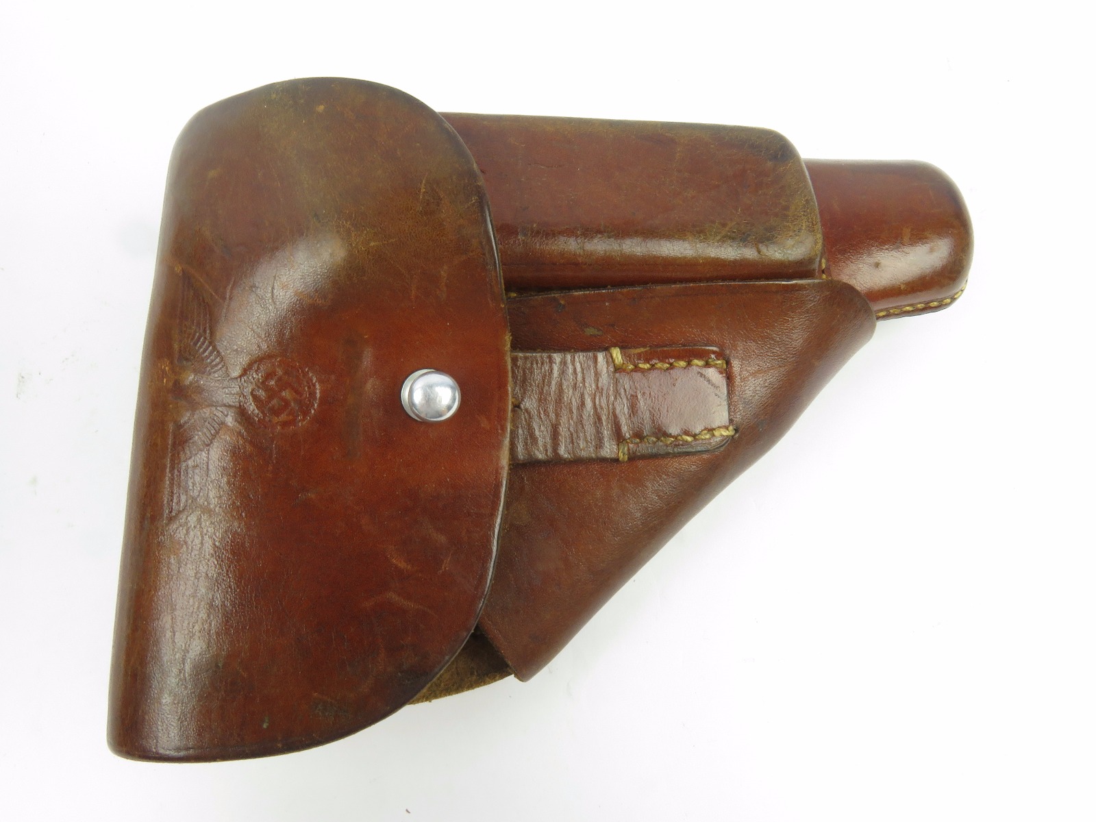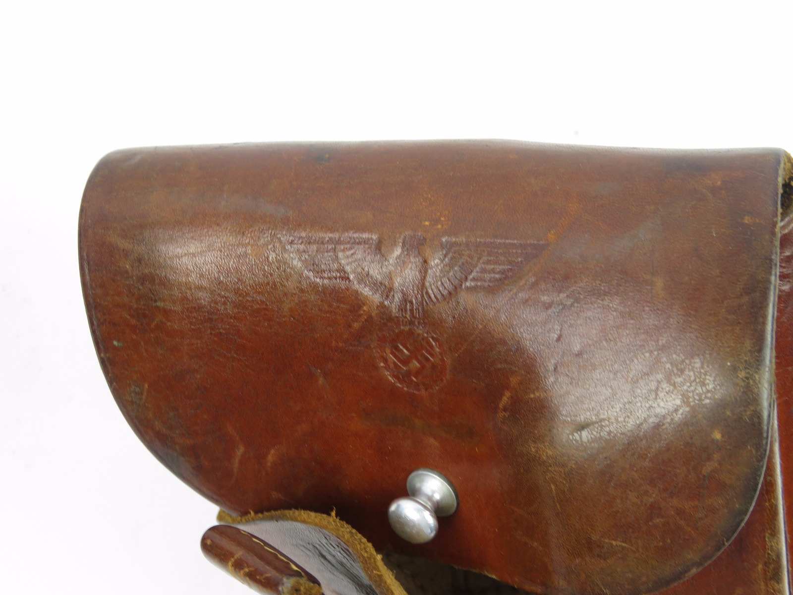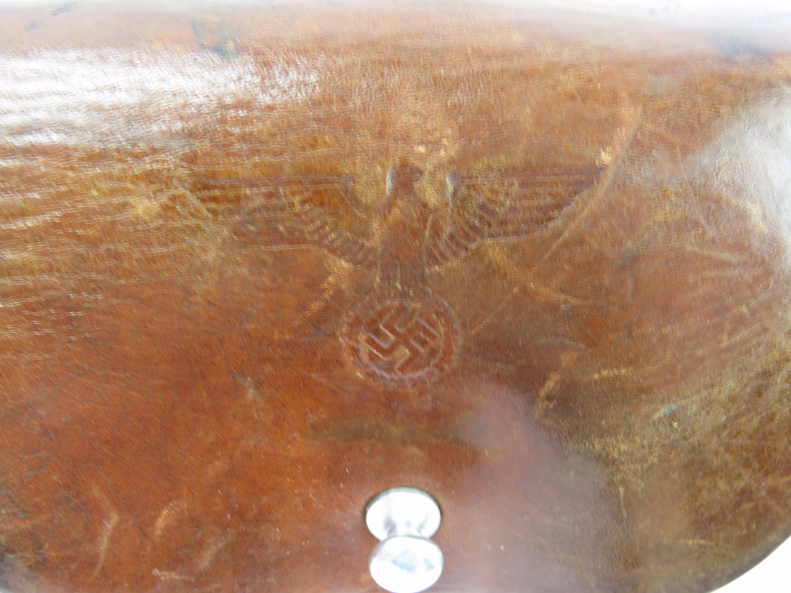 10/24/17 – This is an original WW2 nazi party leader holster complete with an original party leader belt and buckle! This rig is excellent overall, with the holster having a nice party leader stamp on the front leather. These scarce holsters have become harder to find in such nice condition. The leather is fairly firm and completely in tact outside of a few normal surface scuff and aging wear. The stitching is all original and excellent. The buckle and belt are both RZM stamped and excellent as well. The belt is minty leather – very clean and firm. The interior has a faint RZM ink stamp – and the end has another RZM stamp. Guaranteed all original and excellent!