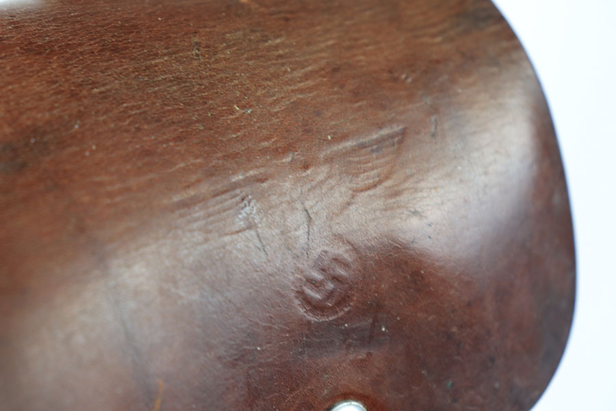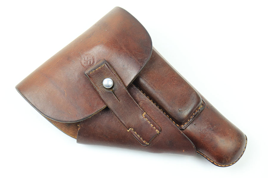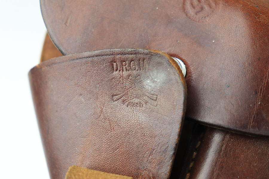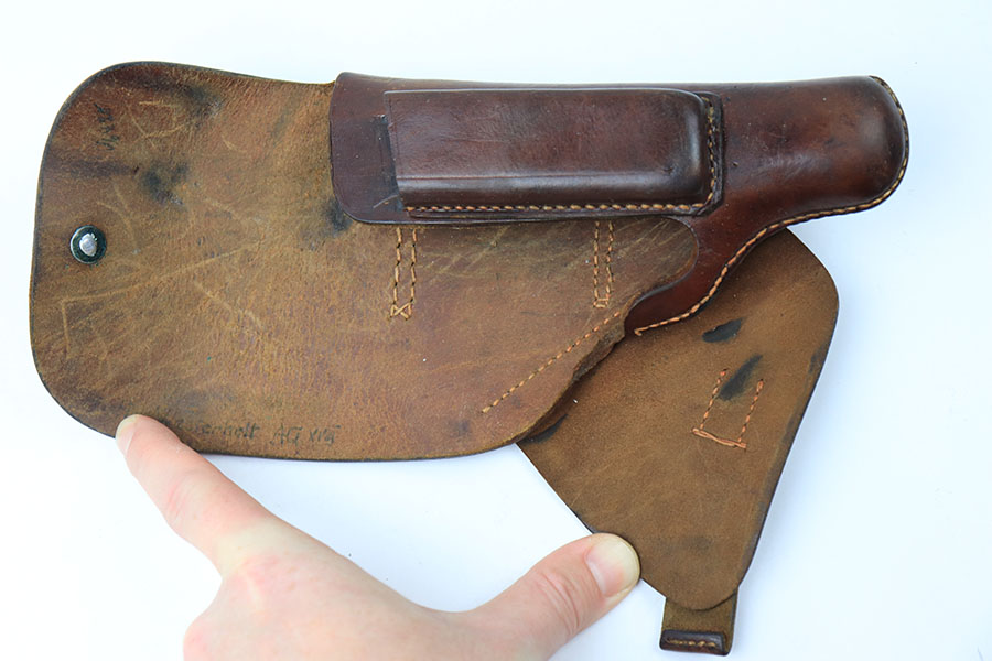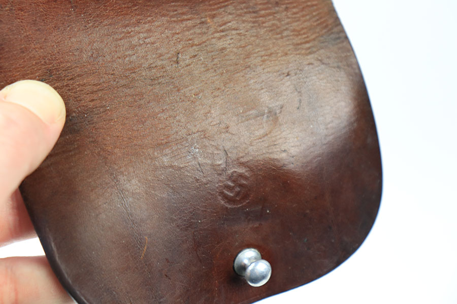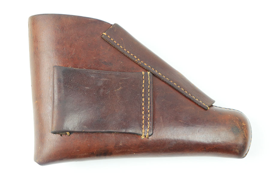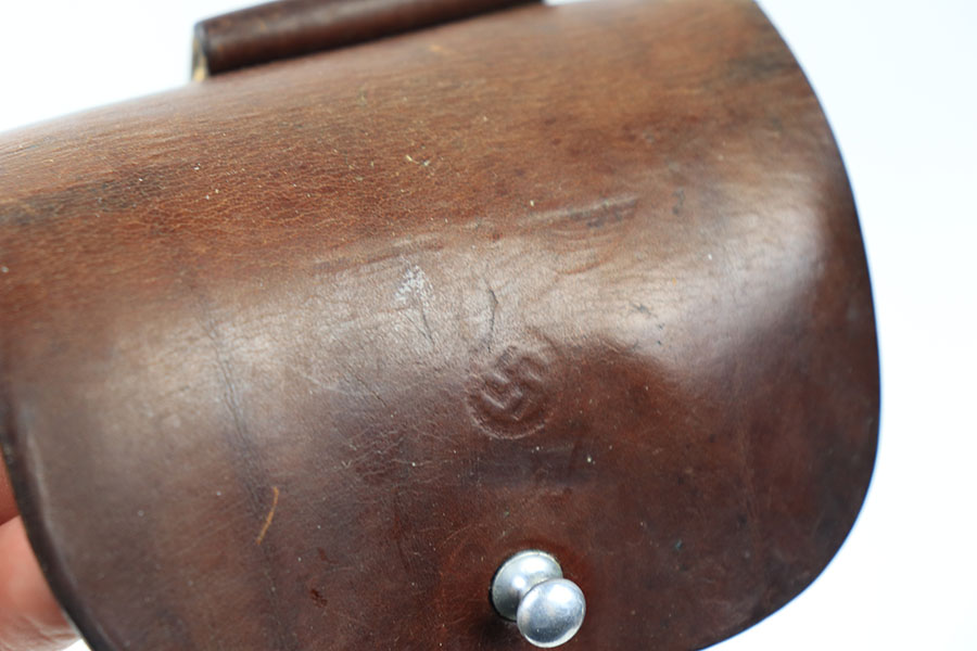 7/9/21 – This is an original, rare variation Party Leader Walther PPK Holster. The holster is in great condition overall with a party leader eagle stamped on the front leather. The eagle has raised out of the leather somewhat, so the eagle is faint but still visible. There is an AKAH maker stamp under the closure strap. The leather is fairly clean and strong with normal pliability. The stitching is excellent and all in tact.