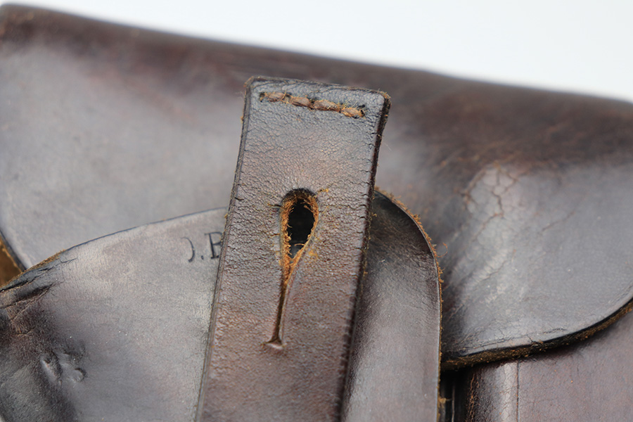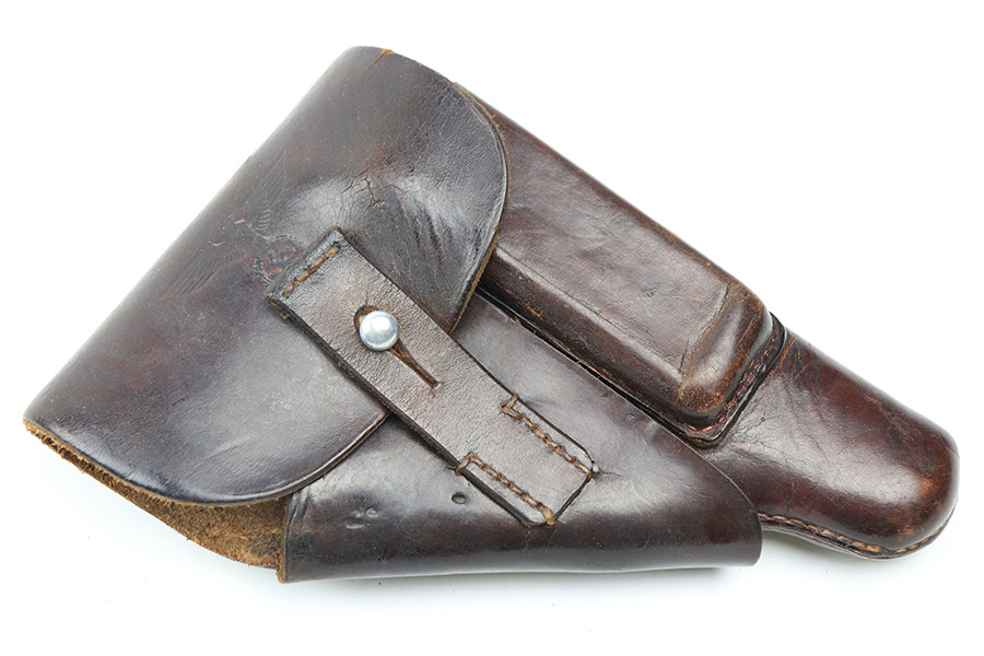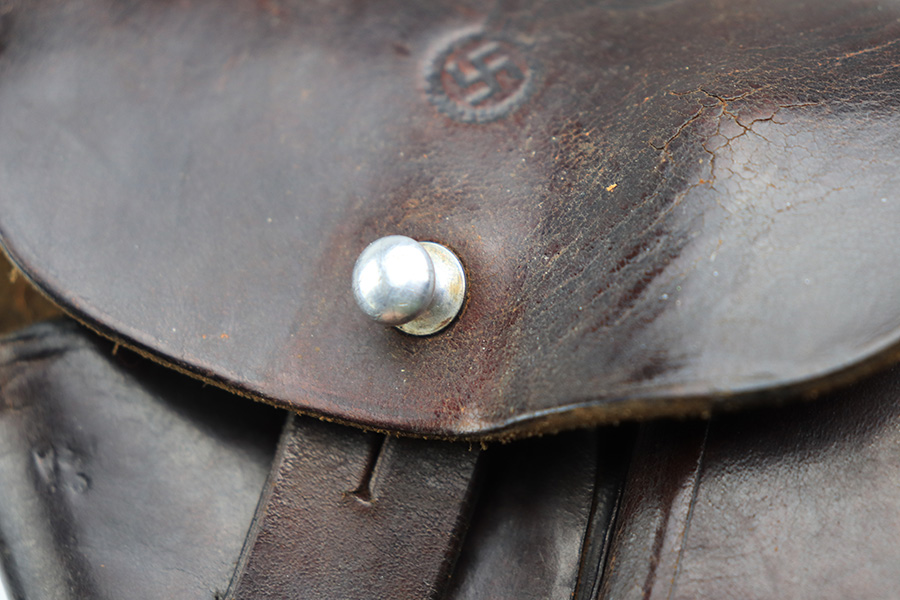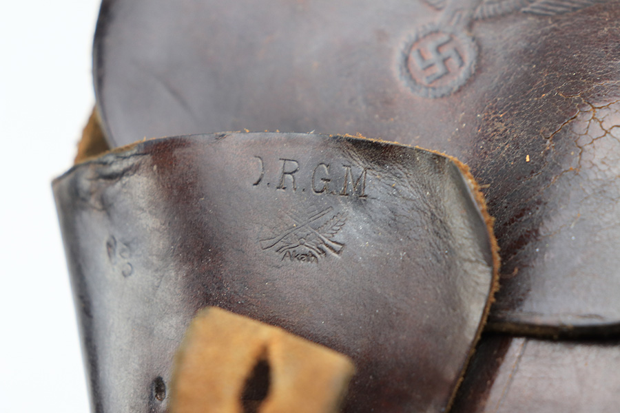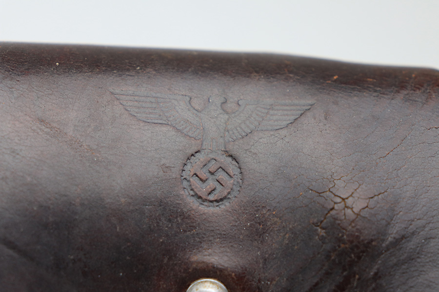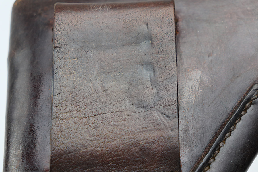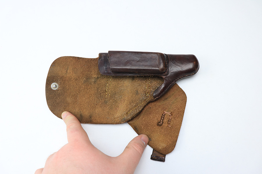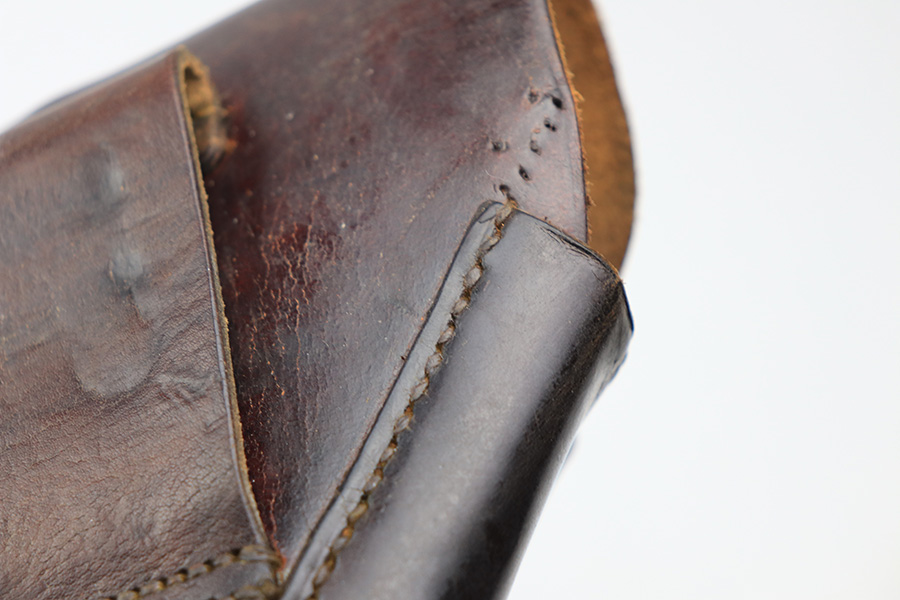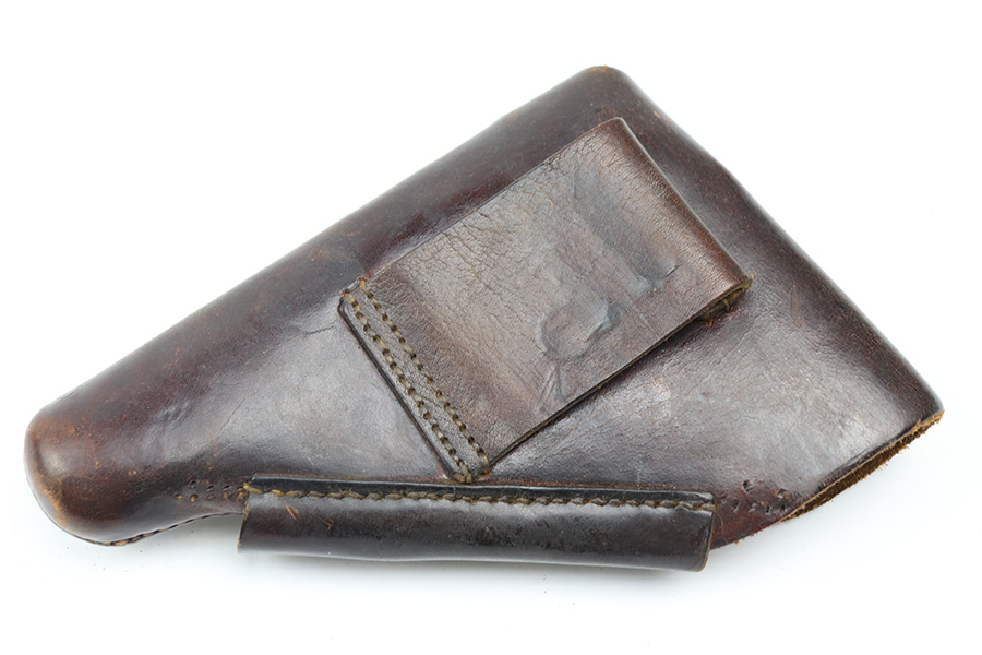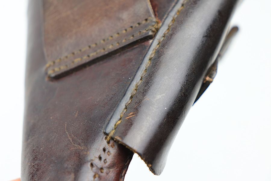 1/6/22 – This is an original AKAH Walther PPK Party Leader holster. The holster features a party leader eagle stamped on the front leather. The eagle is crisp and clearly visible. Under the closure strap is an AKAH DRGM maker stamp. There are no other markings. The interior leather is fairly clean and shows signs of aging and previous use. The stitching is all original and in tact. The biggest takeaway on this holster however is the extra stitching holes around the side flap stitching – this is an indicator that the side flap (and likely the belt loop) has been re-stitched. The price has been reduced accordingly.