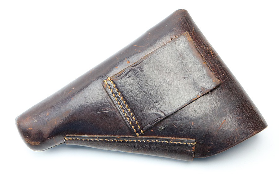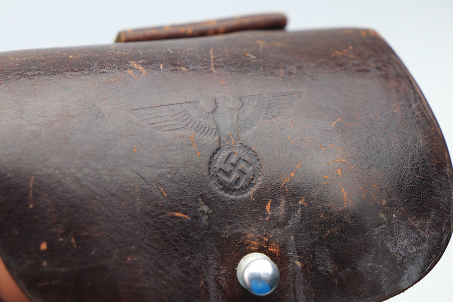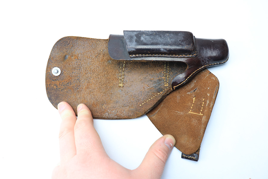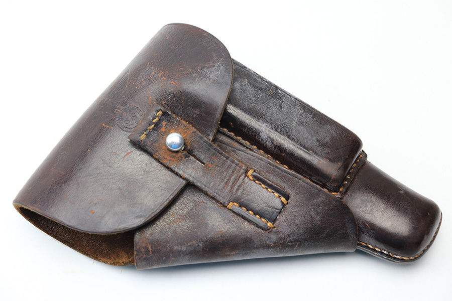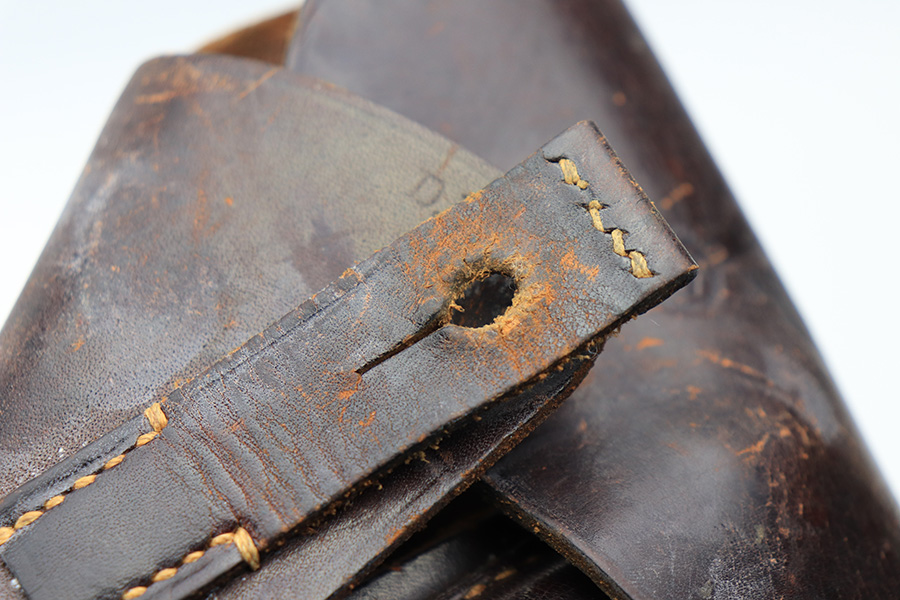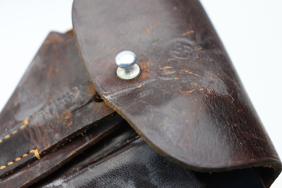 2/10/22 – This is a high quality collectible example of a Party Leader PPK holster. The holster is AKAH maker stamped under the closure strap and ink stamped on the interior leather. The ink stamp is faint but still visible. Most importantly, the front eagle stamp is crisp and detailed with a strong stamp. The leather is in good overall condition with no major damage or issues. The stitching is all original and intact.