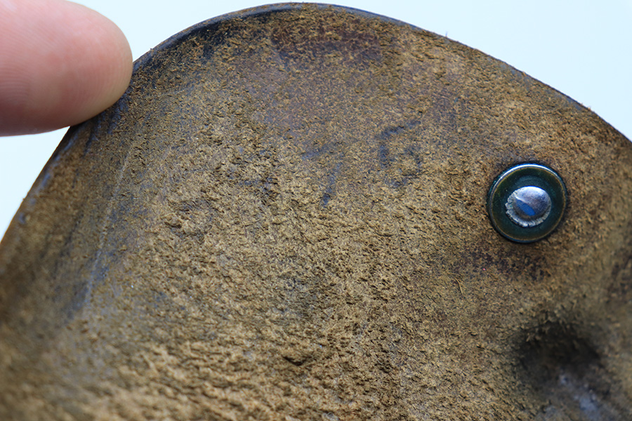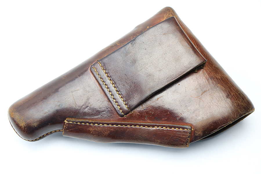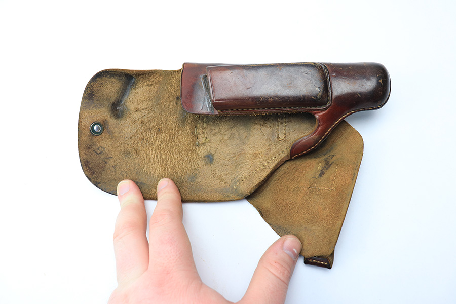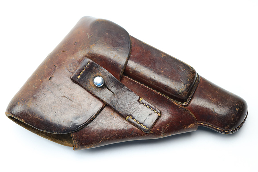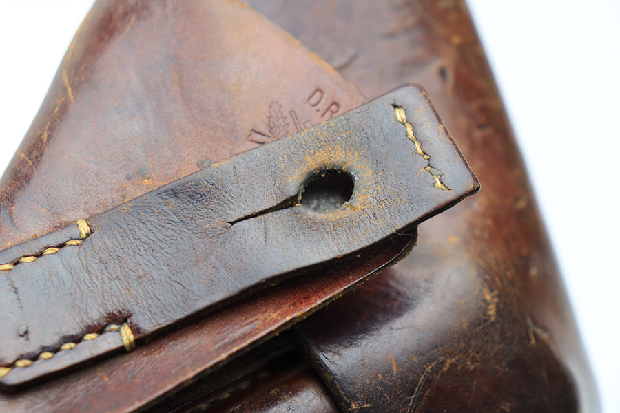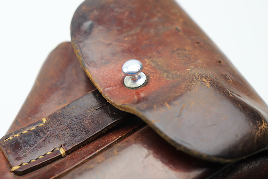 2/14/22 – This is an original WW2 production AKAH Walther PPK Party Leader holster. The holster is maker stamped by AKAH under the closure strap. Additionally, there’s a distinct party leader eagle logo stamped on the front leather. This logo is faded and fairly faint on the leather, but still visible. Around the area of this stamp are 5 small holes that could possibly have been from a previous embellishment. The leather is otherwise in good condition with typical signs of aging and previous use. Honest surface wear throughout but no major damage. The stitching is all in great shape.