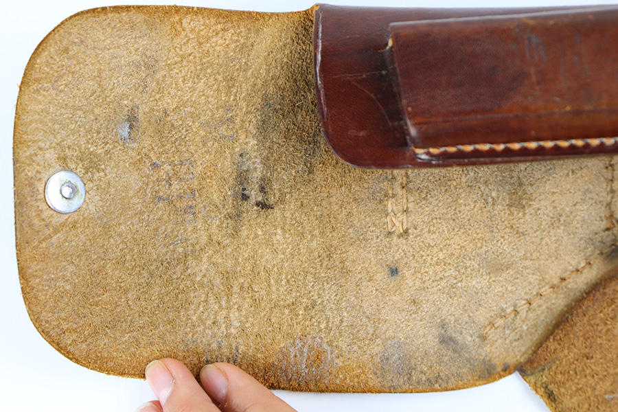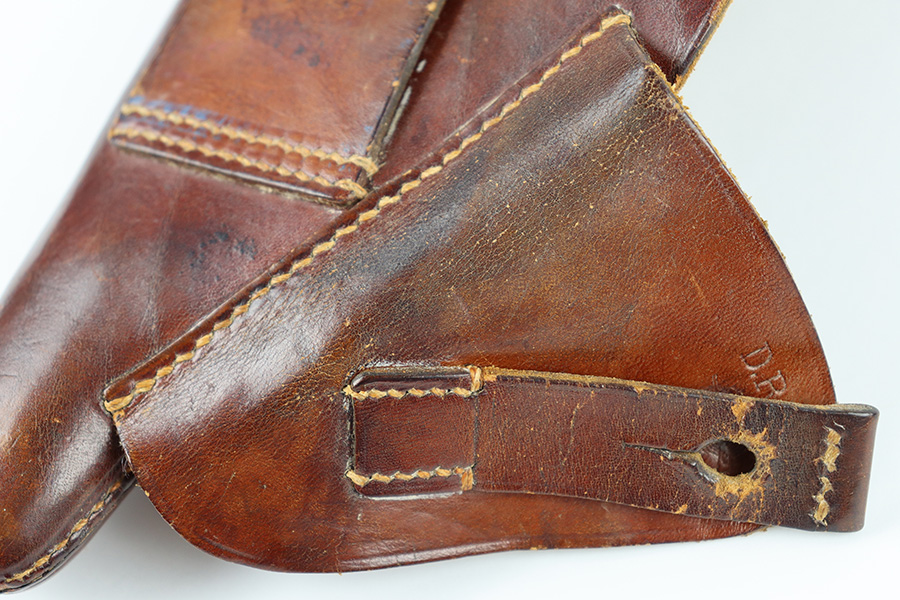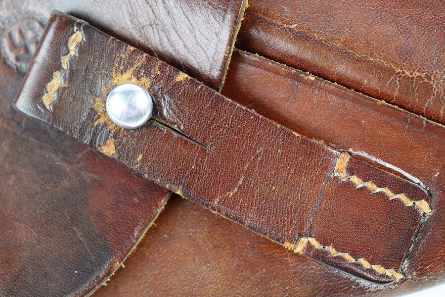 9/27/23 – This is an original, rare variation Party Leader Walther PPK holster. The holster is in great overall condition with a distinct Party Leader Eagle stamp on the front leather. The leather shows surface wrinkling and light surface cracking around this party leader eagle stamp, and the top rounded portion of leather. Further wrinkling and surface wear is found on the closure strap. The leather is soft with normal pliability and completely intact. The interior leather is clean with remnants of the Walther PPK ink stamp still visible. AKAH maker stamped under the closure strap. All original stitching intact and without issue.