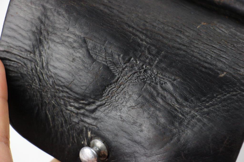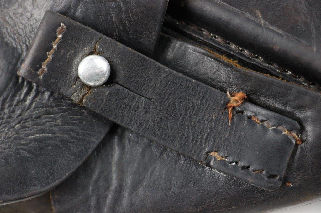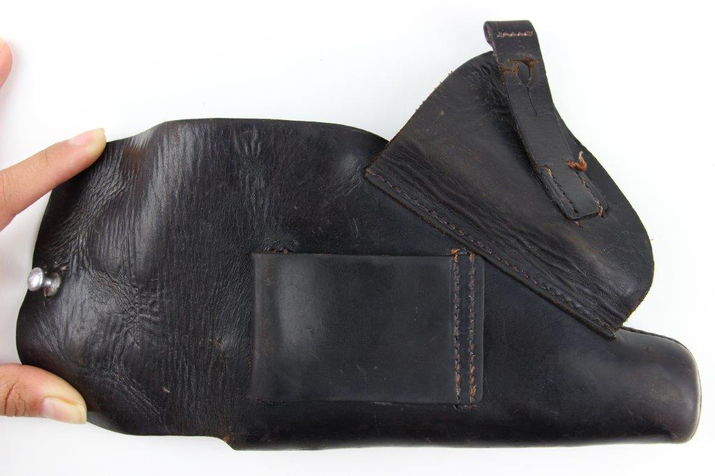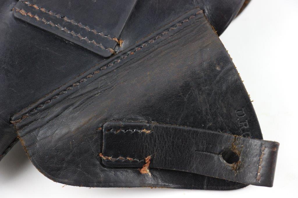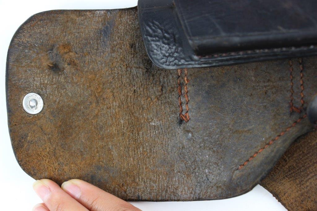 6/27/24 – This is a WW2 German AKAH Party Leader PPK Holster. This example has a somewhat controversial Party Leader Eagle stamp on the front leather. Our opinion is that this eagle was likely re-stamped or re-applied postwar. Despite this, the closure strap leather and stitching matches the condition and style to the rest of the holster, which reinforces the understanding that this is an original example. The price is still reduced based on the speculation over the eagle stamp. The holster has black leather and an aluminum closer stud, which indicates this as a later wartime example (1940’s). The stitching throughout is reddish colored and in great shape. A few loose threads on the base of the closure strap, but the strap is still secure. The leather has surface wrinkling and a few surface scuffs throughout the exterior. The interior and shape of the holster shows honest use wear. Normal pliability. AKAH DRGM stamped under the closure strap, as shown.
