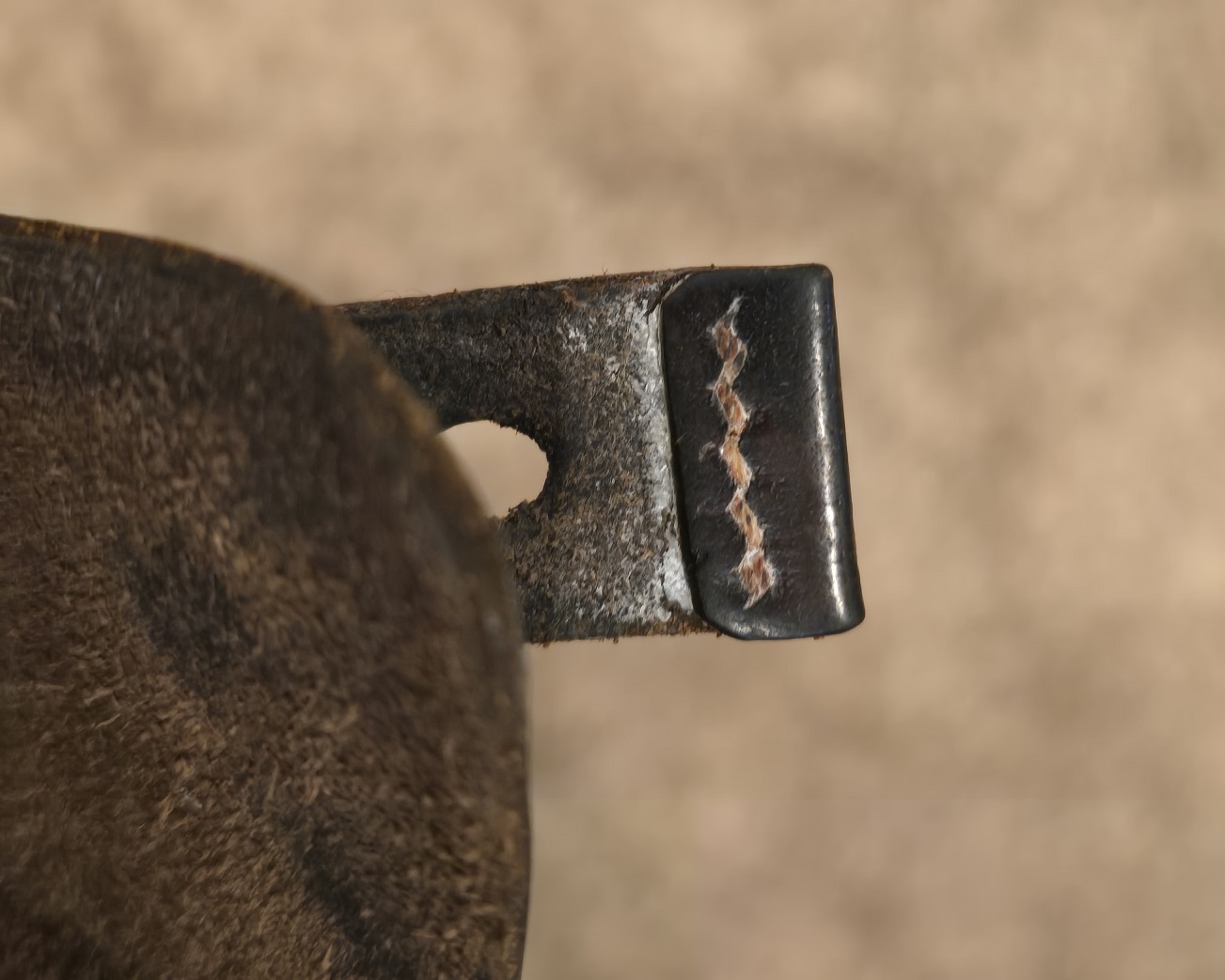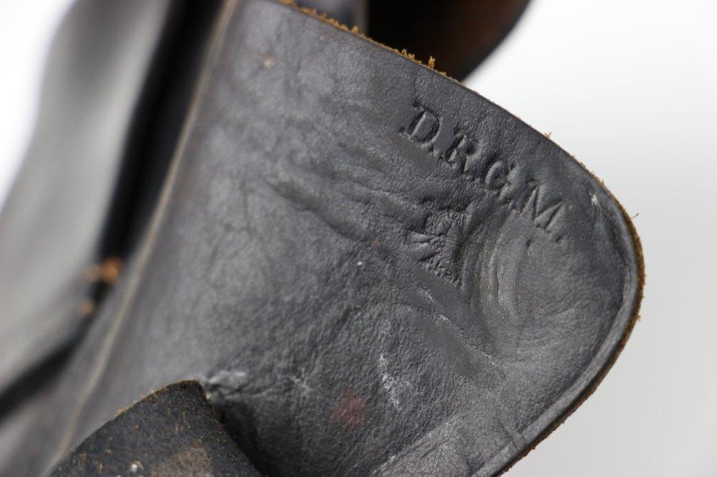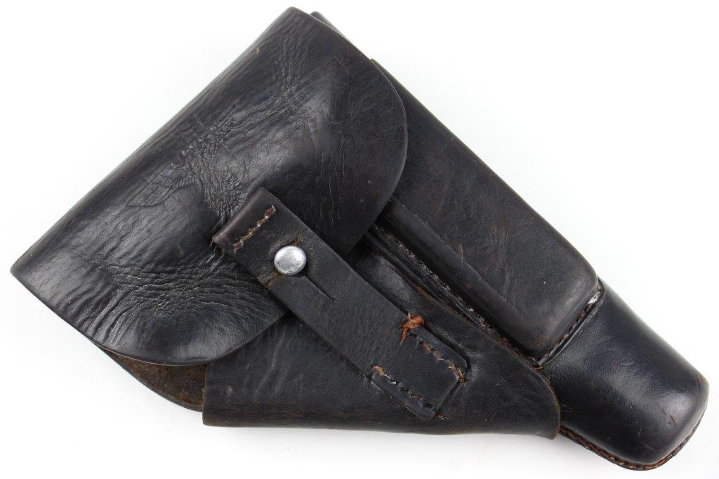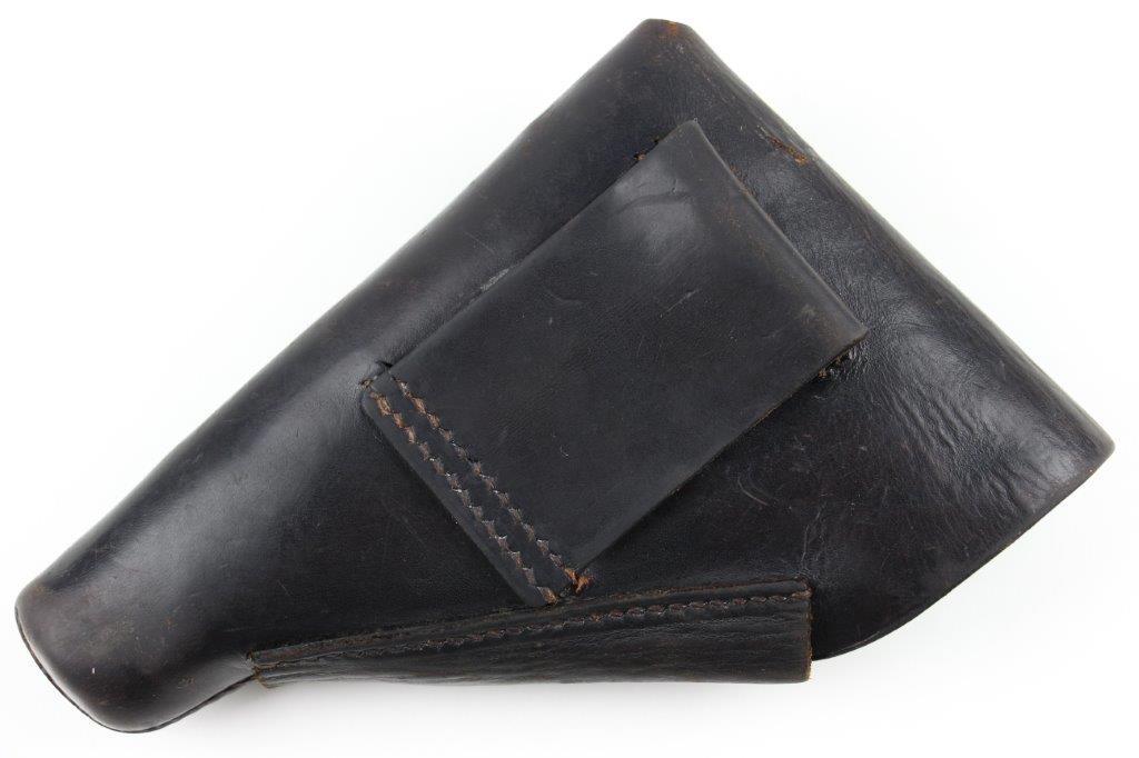 6/27/24 – This is a WW2 German AKAH Party Leader PPK Holster. This example has a somewhat controversial Party Leader Eagle stamp on the front leather. Our opinion is that this eagle was likely re-stamped or re-applied postwar. Despite this, the closure strap leather and stitching matches the condition and style to the rest of the holster, which reinforces the understanding that this is an original example. The price is still reduced based on the speculation over the eagle stamp. The holster has black leather and an aluminum closer stud, which indicates this as a later wartime example (1940’s). The stitching throughout is reddish colored and in great shape. A few loose threads on the base of the closure strap, but the strap is still secure. The leather has surface wrinkling and a few surface scuffs throughout the exterior. The interior and shape of the holster shows honest use wear. Normal pliability. AKAH DRGM stamped under the closure strap, as shown.