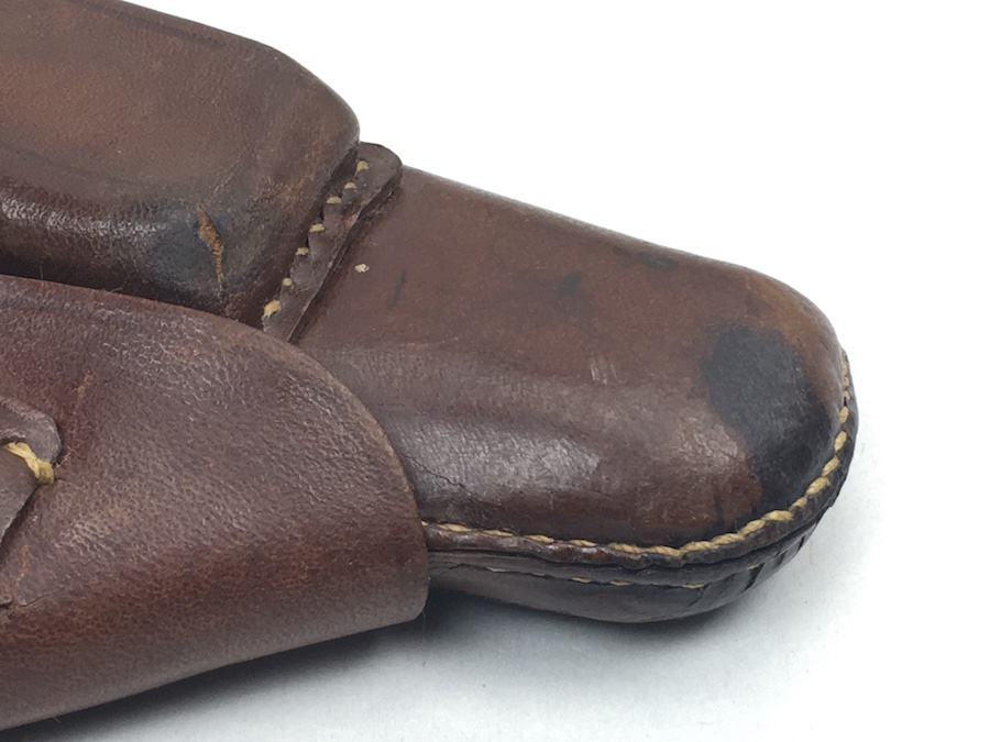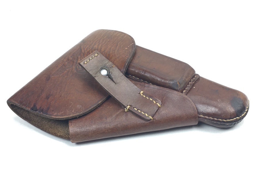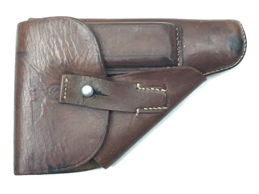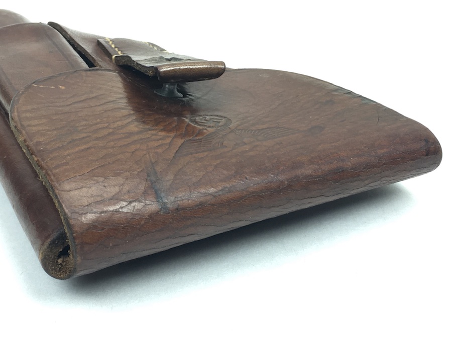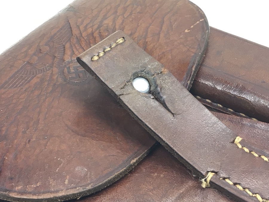 6/12/19 – This is an all original and authentic WW2 nazi party leader holster. The holster has a distinct party leader eagle stamped on the front leather. There’s also an AKAH maker stamp under the closure strap. The leather has normal wear and pliability throughout – all is honest wear showing signs of use and age (this one didn’t sit in some officer’s drawer throughout the war). The stitching is all original and in tact. Interior is clean with a faint ink stamp “WALTHER PPK” under the closure flap. Small char mark on the toe is only on the surface.