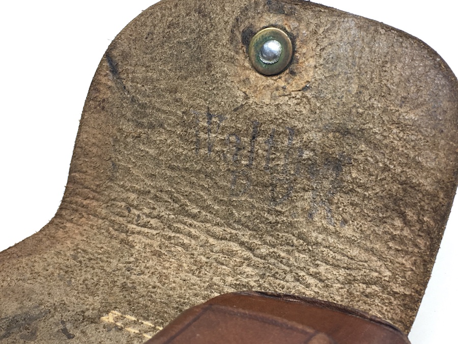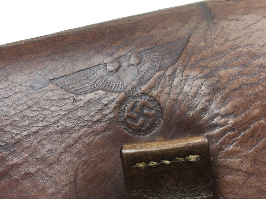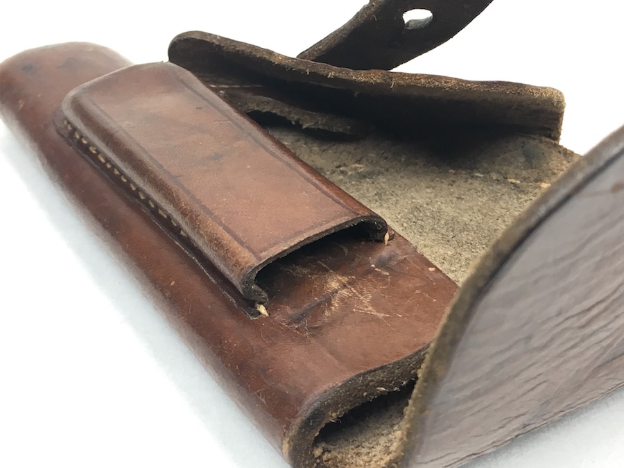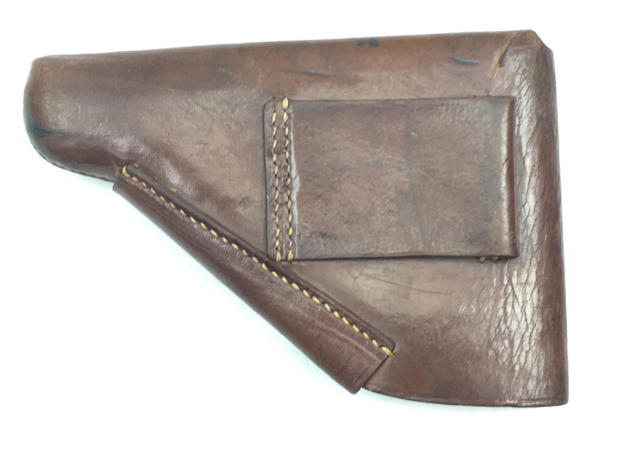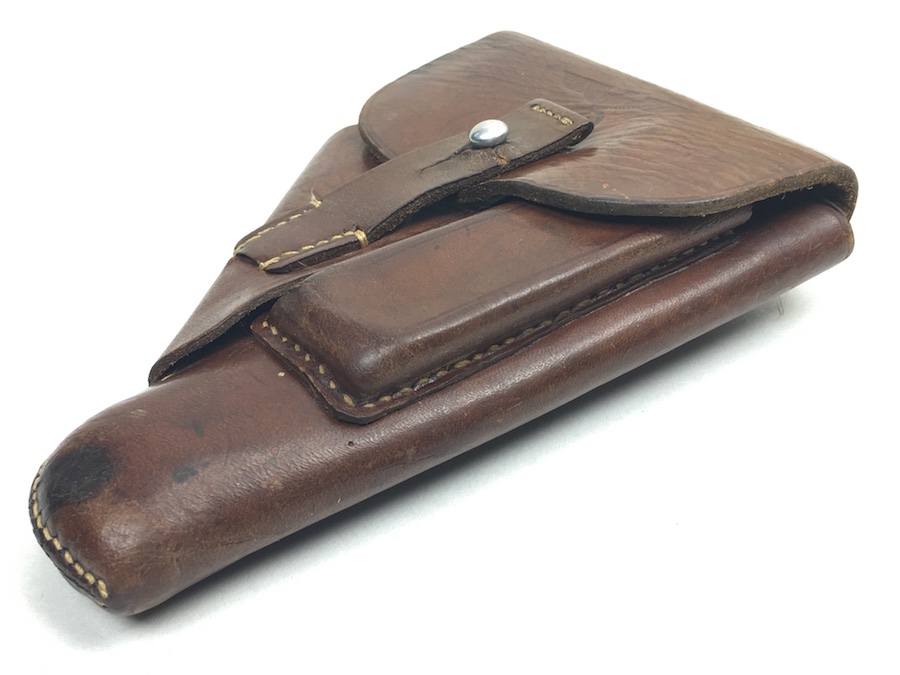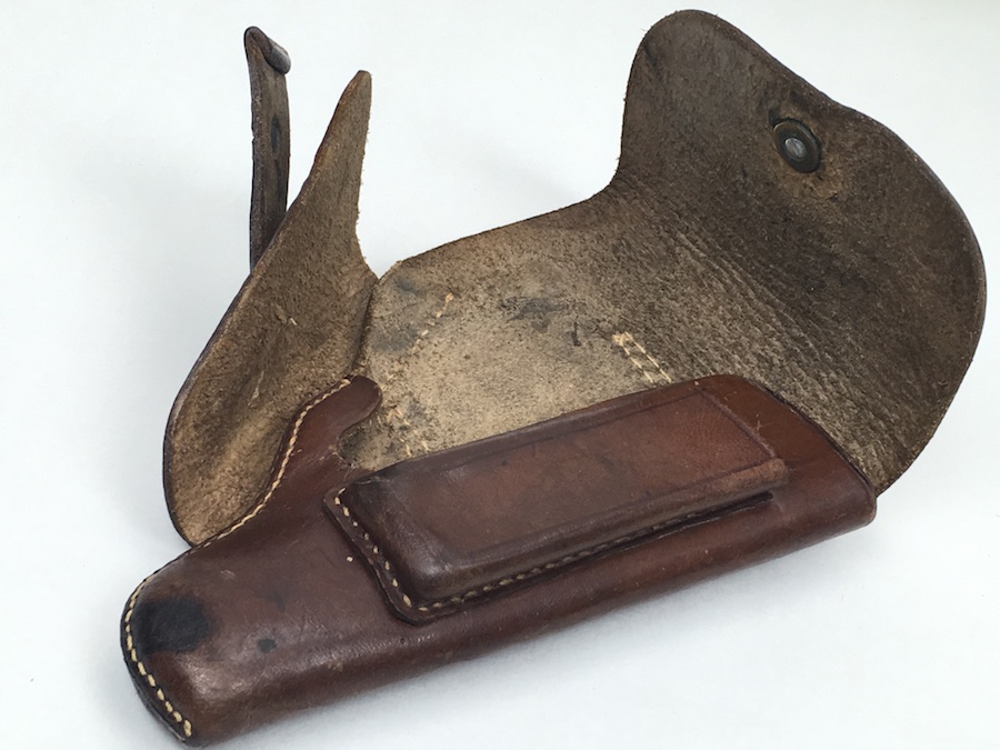 6/12/19 – This is an all original and authentic WW2 nazi party leader holster. The holster has a distinct party leader eagle stamped on the front leather. There’s also an AKAH maker stamp under the closure strap. The leather has normal wear and pliability throughout – all is honest wear showing signs of use and age (this one didn’t sit in some officer’s drawer throughout the war). The stitching is all original and in tact. Interior is clean with a faint ink stamp “WALTHER PPK” under the closure flap. Small char mark on the toe is only on the surface.