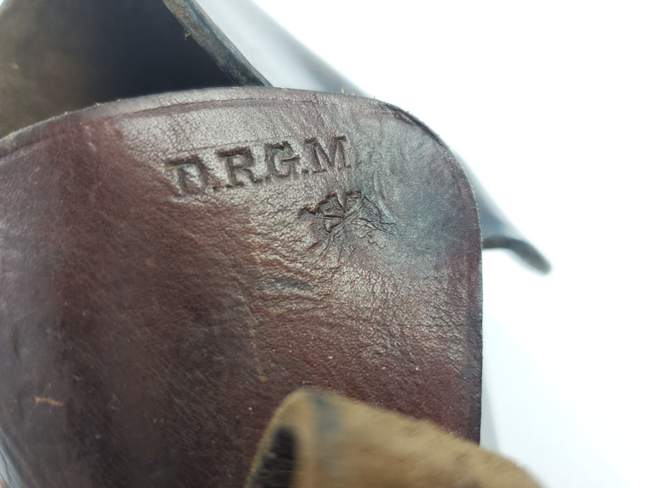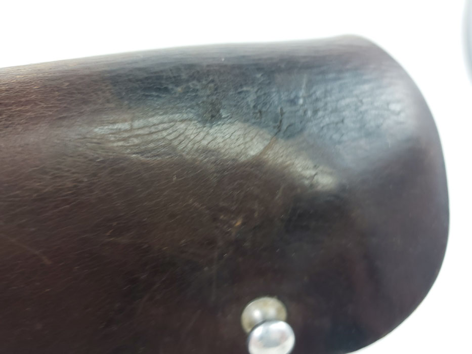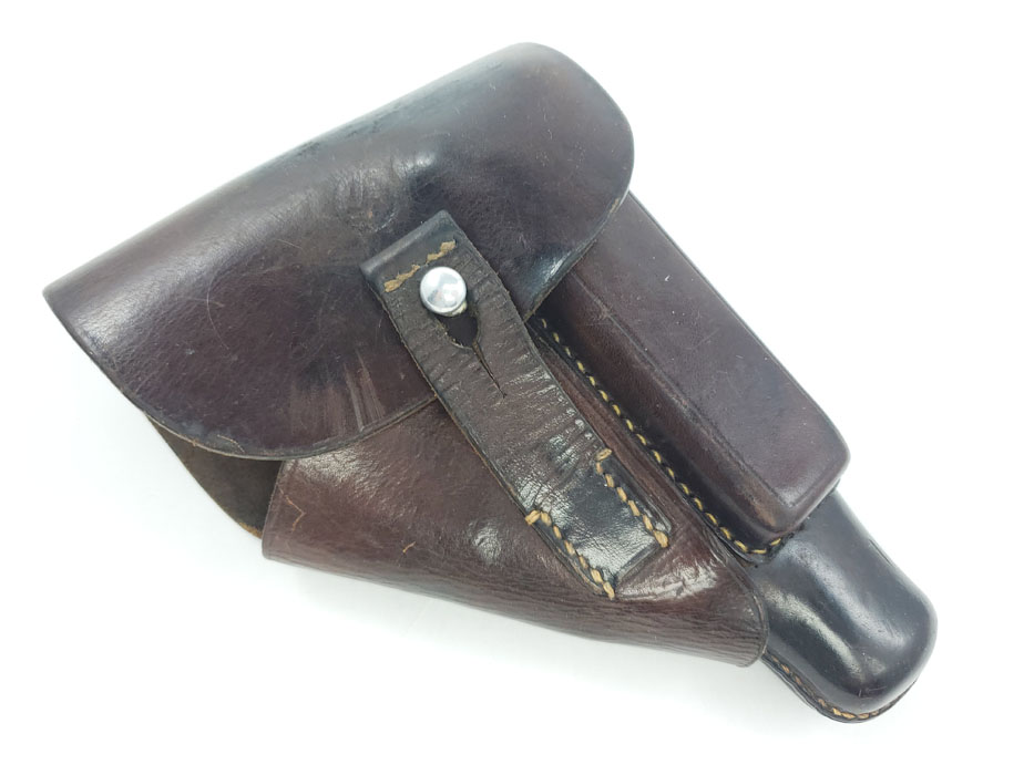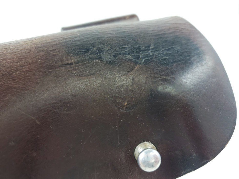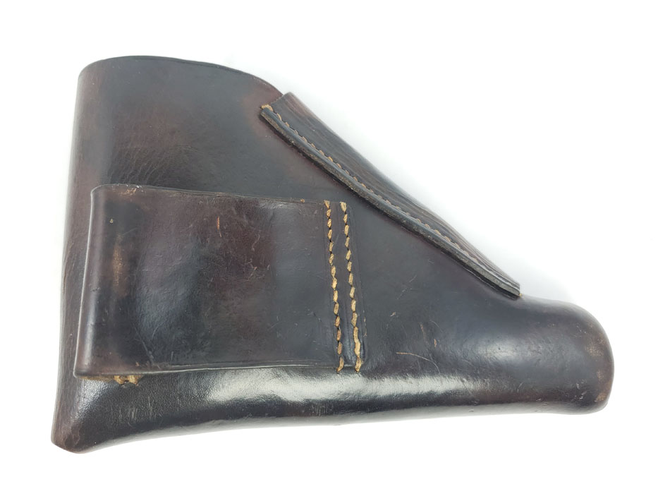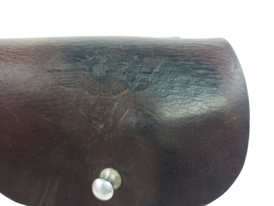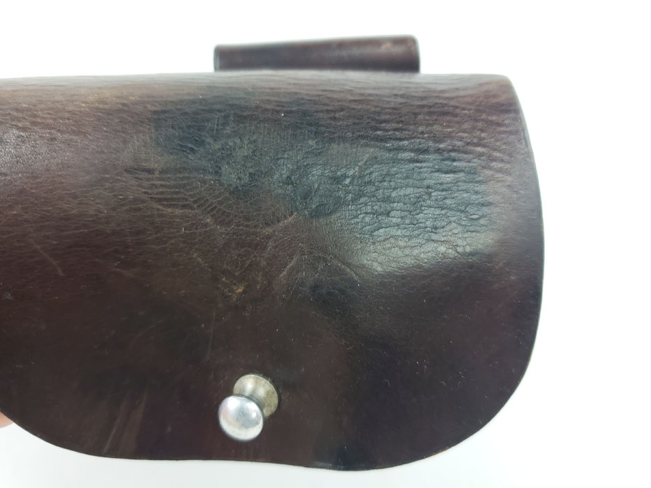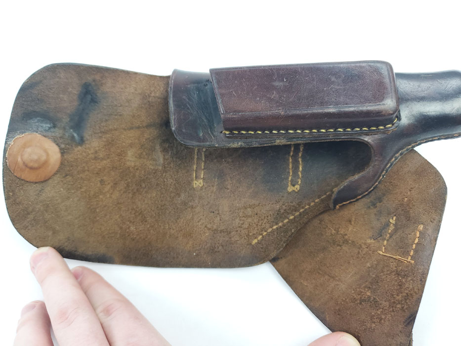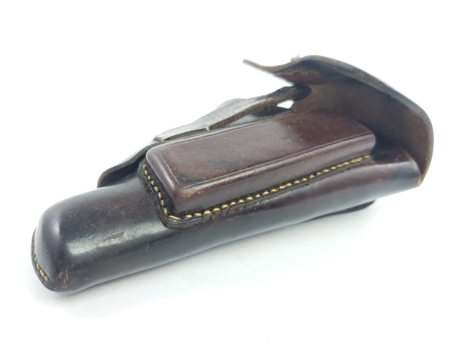 5/6/20 – This is an original party leader Walther PPK holster from WW2. The holster is AKAH D.R.G.M. stamped under the closure strap, and has a party leader eagle logo on the front leather. The party leader eagle is faint, but definitely original and still visibly imprinted into the leather. There is some light surface wrinkling around this area and the bend in the leather. The leather is slightly darkened in an area around the head and partial wing of the eagle. This could be black ink as there are other signs (near the toe, and the back of the holster) that this was once dyed black, and almost all of the black dye has worn off. The interior leather is fairly clean with signs of use, holding a pistol. Stitching is all original and in tact.