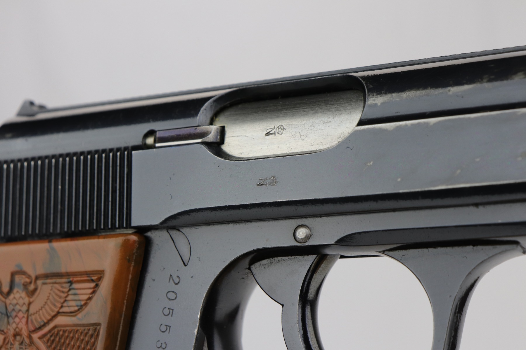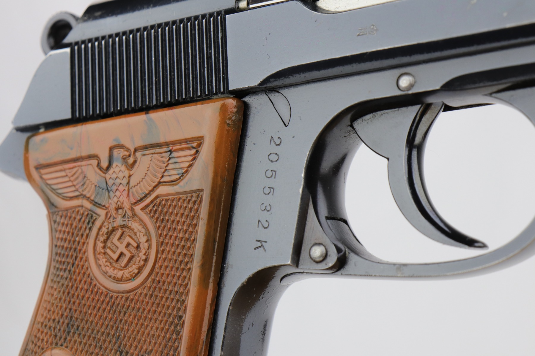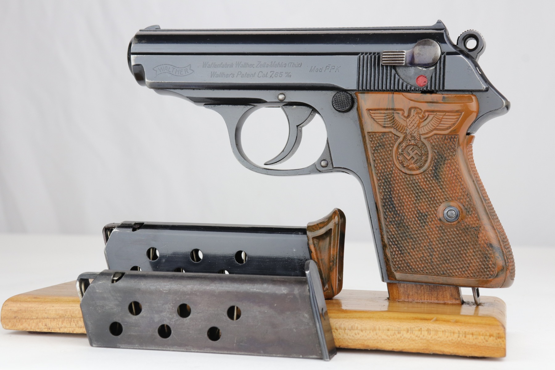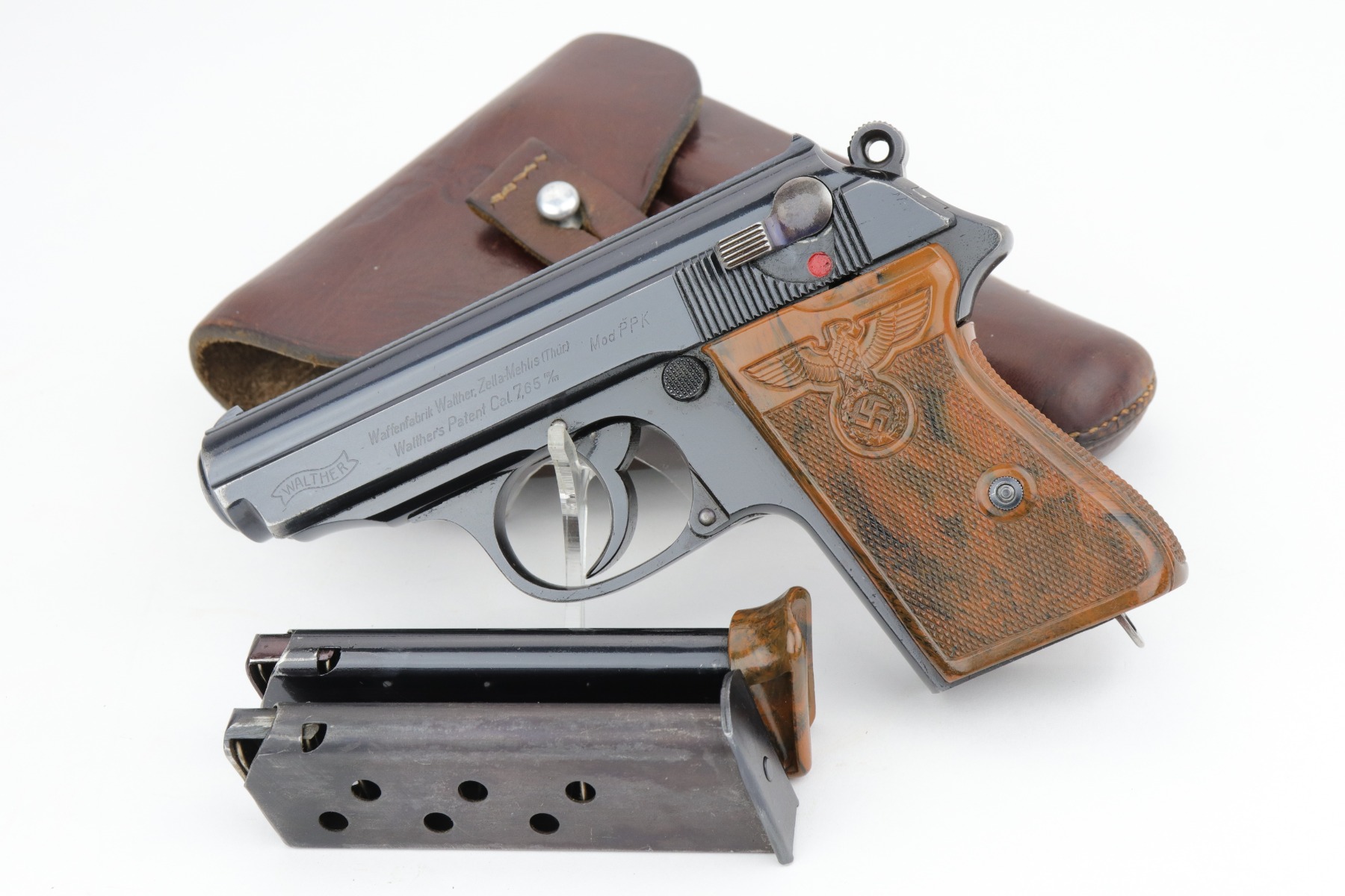 11/13/19 – This is an all original and guaranteed authentic Party Leader PPK from 1938. We have done some YouTube videos on these guns and they are without question one of the popular collectible weapons we sell. The most important part is the grip. These were offered to Party Leaders worthy of merit in 1938 and 1939. They were offered with the Party Leader holster as well. This holster is a coffee brown color which is a little rarer than the tan PL holster. The grip is in excellent condition except for two extremely minor stress hairline fracture on each side of the grip. The finish on the gun is original and excellent, around 97%. There is minor muzzle wear and wear on the right side of the slide. It comes with the proper finger extension magazine as well as a spare magazine. Excellent bore. We can provide a certificate of authenticity upon request. Also upon request, we could break the rig up: $9,850 for the gun and $3,000 for the holster.