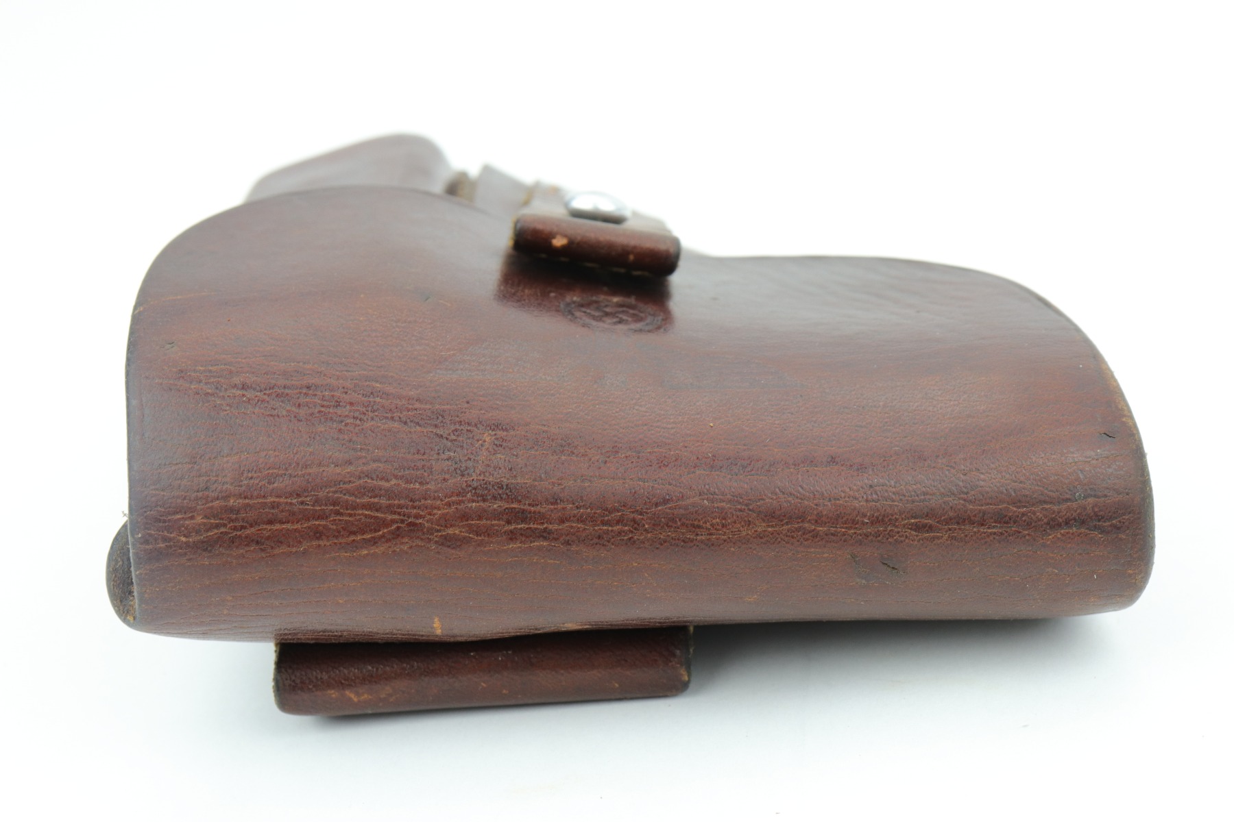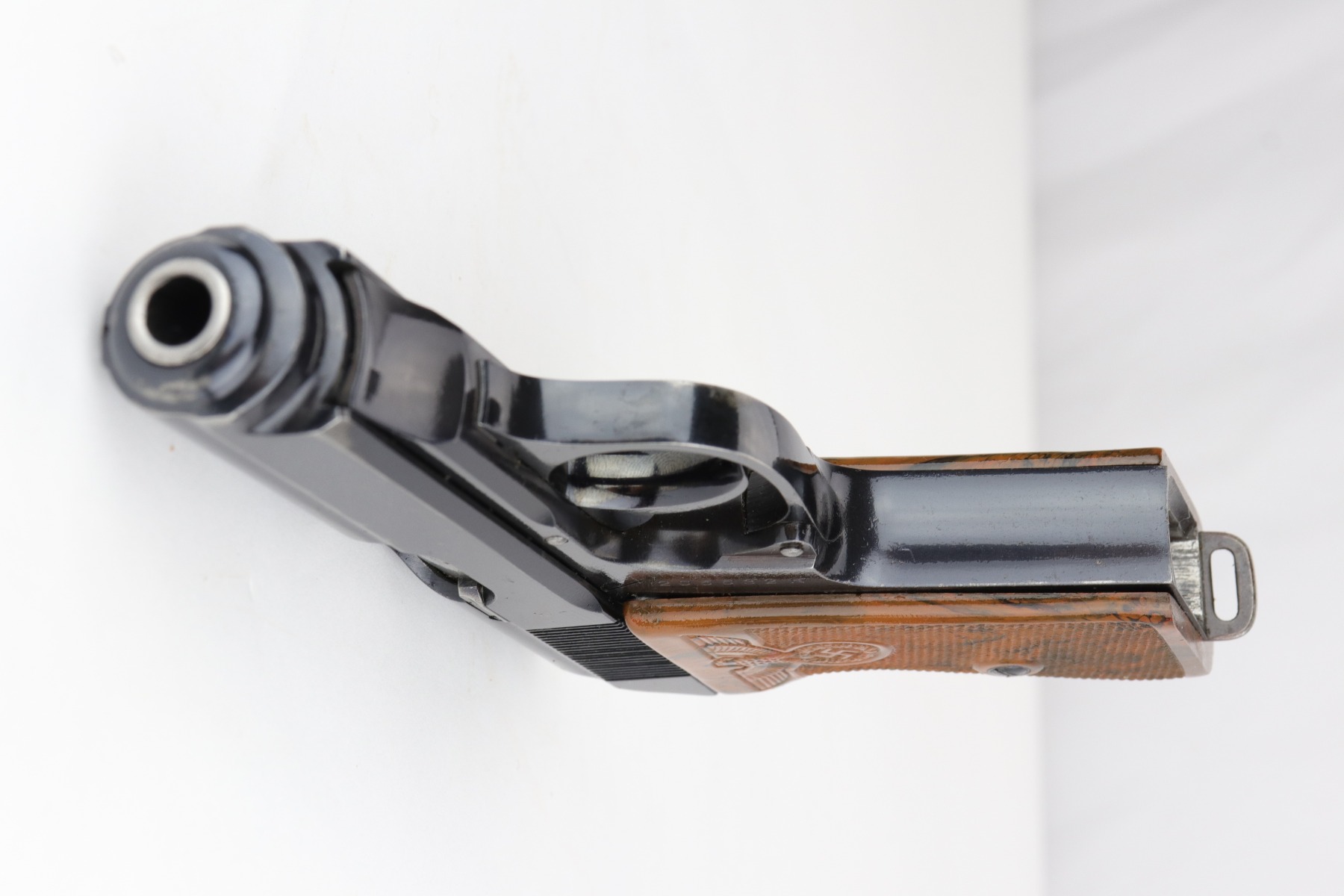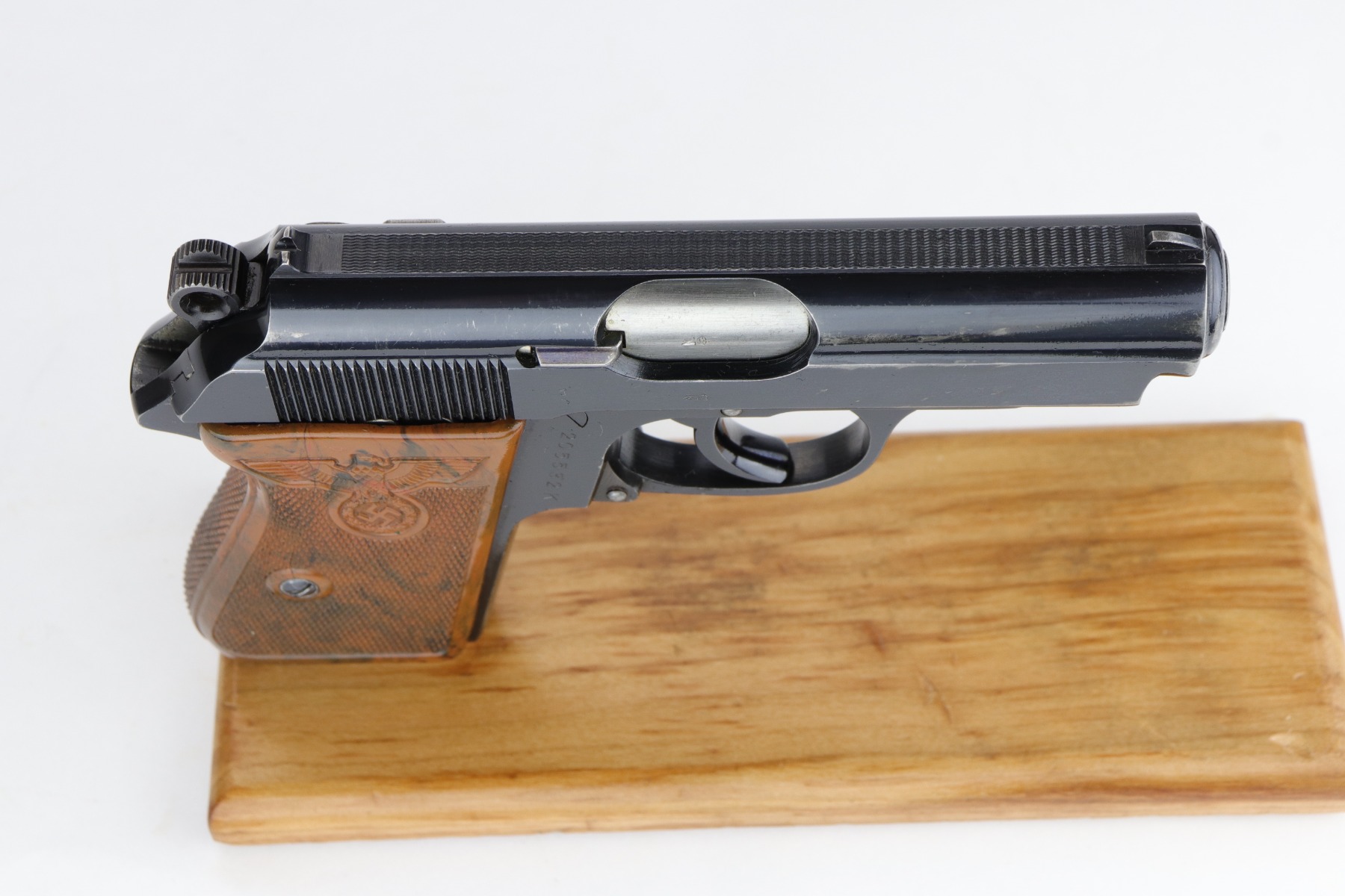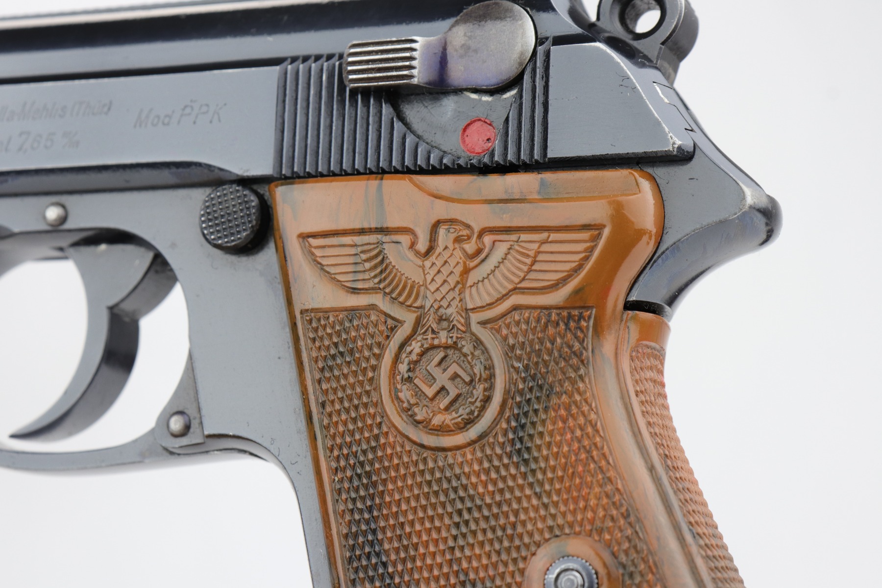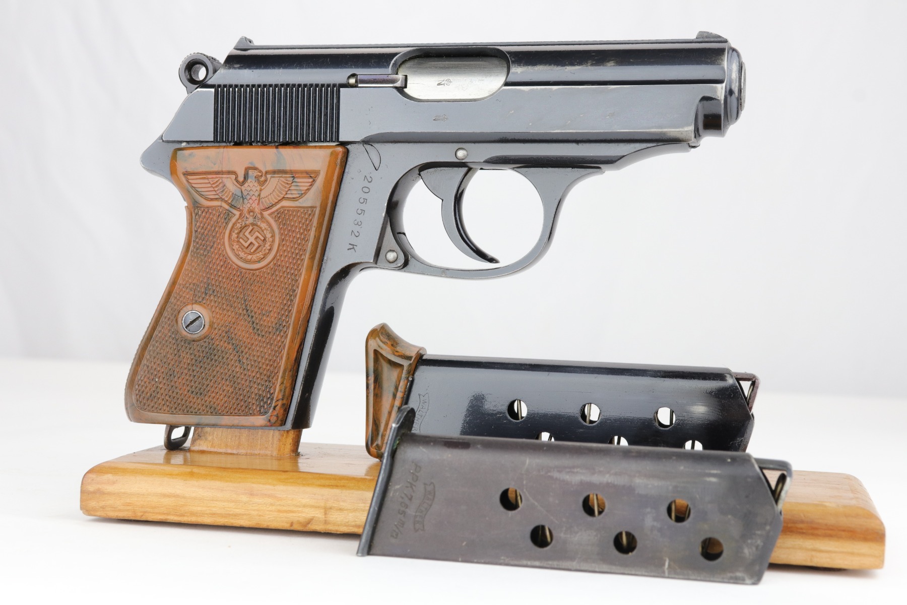 11/13/19 – This is an all original and guaranteed authentic Party Leader PPK from 1938. We have done some YouTube videos on these guns and they are without question one of the popular collectible weapons we sell. The most important part is the grip. These were offered to Party Leaders worthy of merit in 1938 and 1939. They were offered with the Party Leader holster as well. This holster is a coffee brown color which is a little rarer than the tan PL holster. The grip is in excellent condition except for two extremely minor stress hairline fracture on each side of the grip. The finish on the gun is original and excellent, around 97%. There is minor muzzle wear and wear on the right side of the slide. It comes with the proper finger extension magazine as well as a spare magazine. Excellent bore. We can provide a certificate of authenticity upon request. Also upon request, we could break the rig up: $9,850 for the gun and $3,000 for the holster.