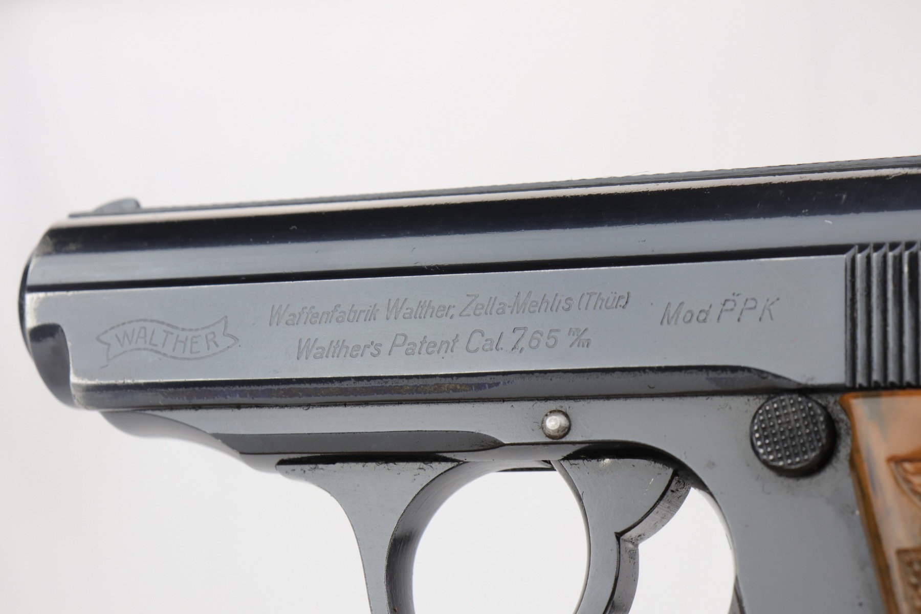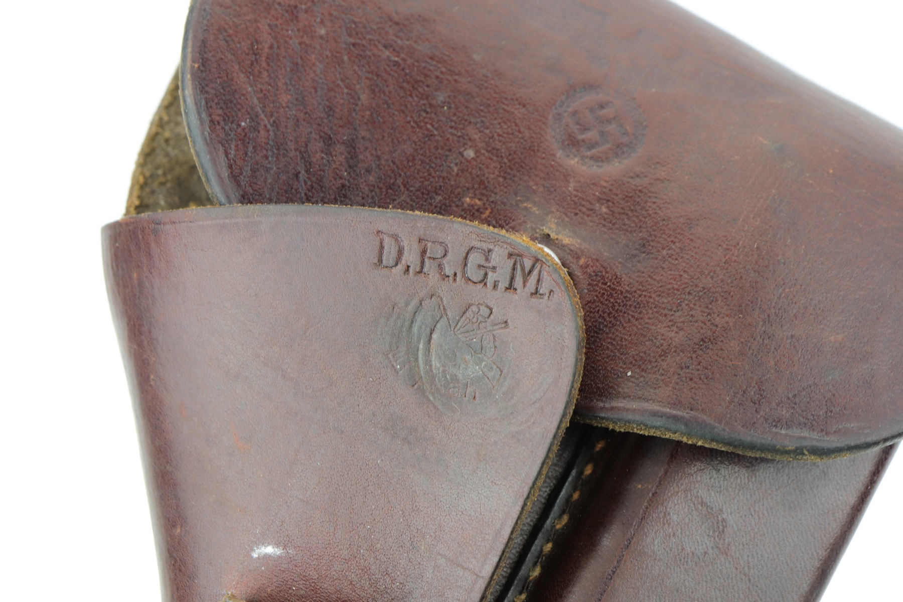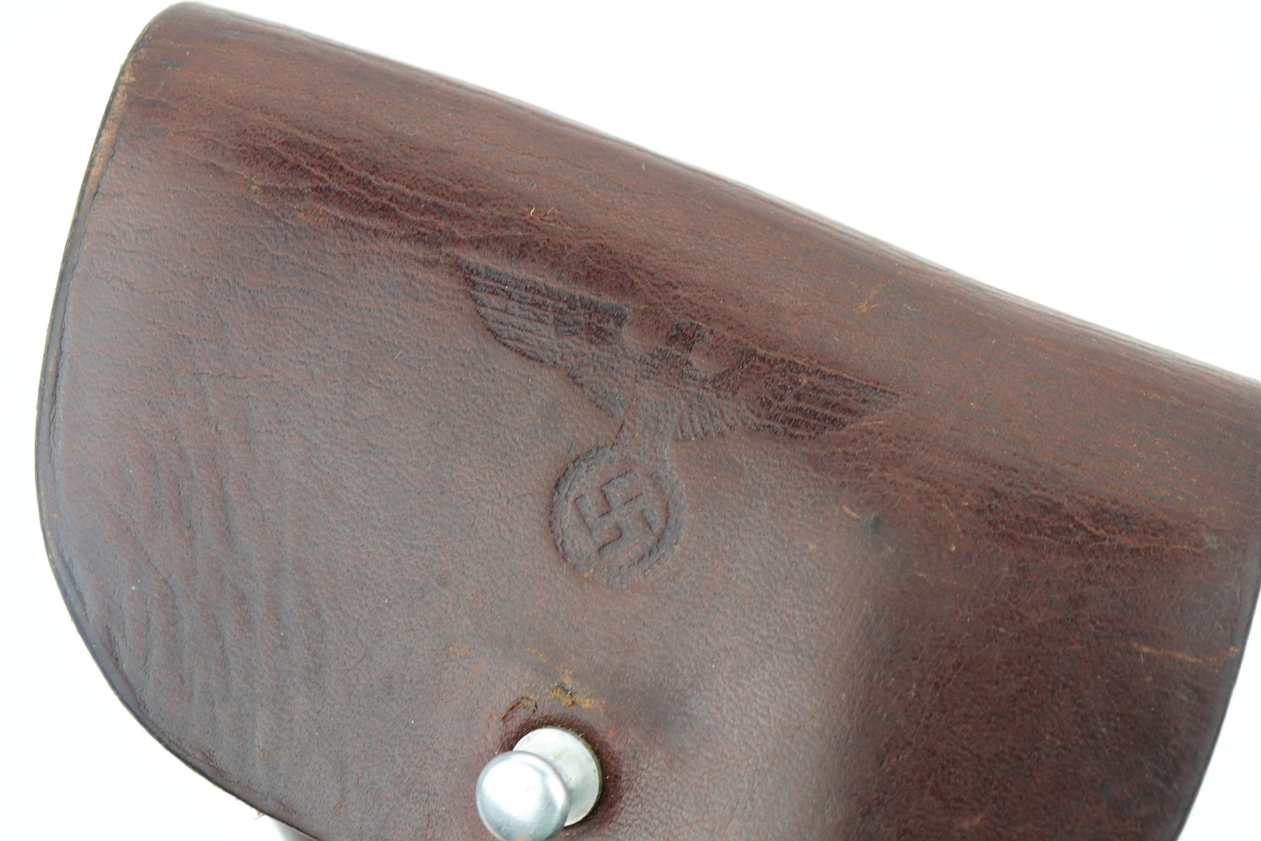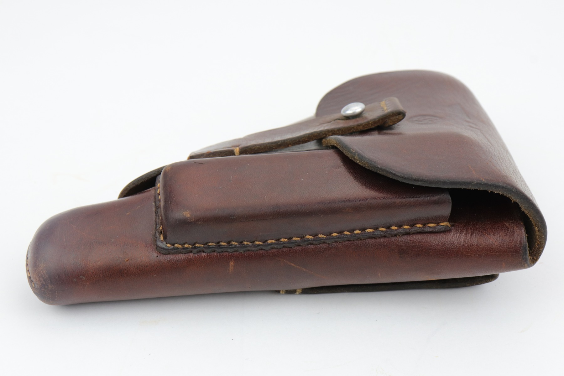 11/13/19 – This is an all original and guaranteed authentic Party Leader PPK from 1938. We have done some YouTube videos on these guns and they are without question one of the popular collectible weapons we sell. The most important part is the grip. These were offered to Party Leaders worthy of merit in 1938 and 1939. They were offered with the Party Leader holster as well. This holster is a coffee brown color which is a little rarer than the tan PL holster. The grip is in excellent condition except for two extremely minor stress hairline fracture on each side of the grip. The finish on the gun is original and excellent, around 97%. There is minor muzzle wear and wear on the right side of the slide. It comes with the proper finger extension magazine as well as a spare magazine. Excellent bore. We can provide a certificate of authenticity upon request. Also upon request, we could break the rig up: $9,850 for the gun and $3,000 for the holster.
