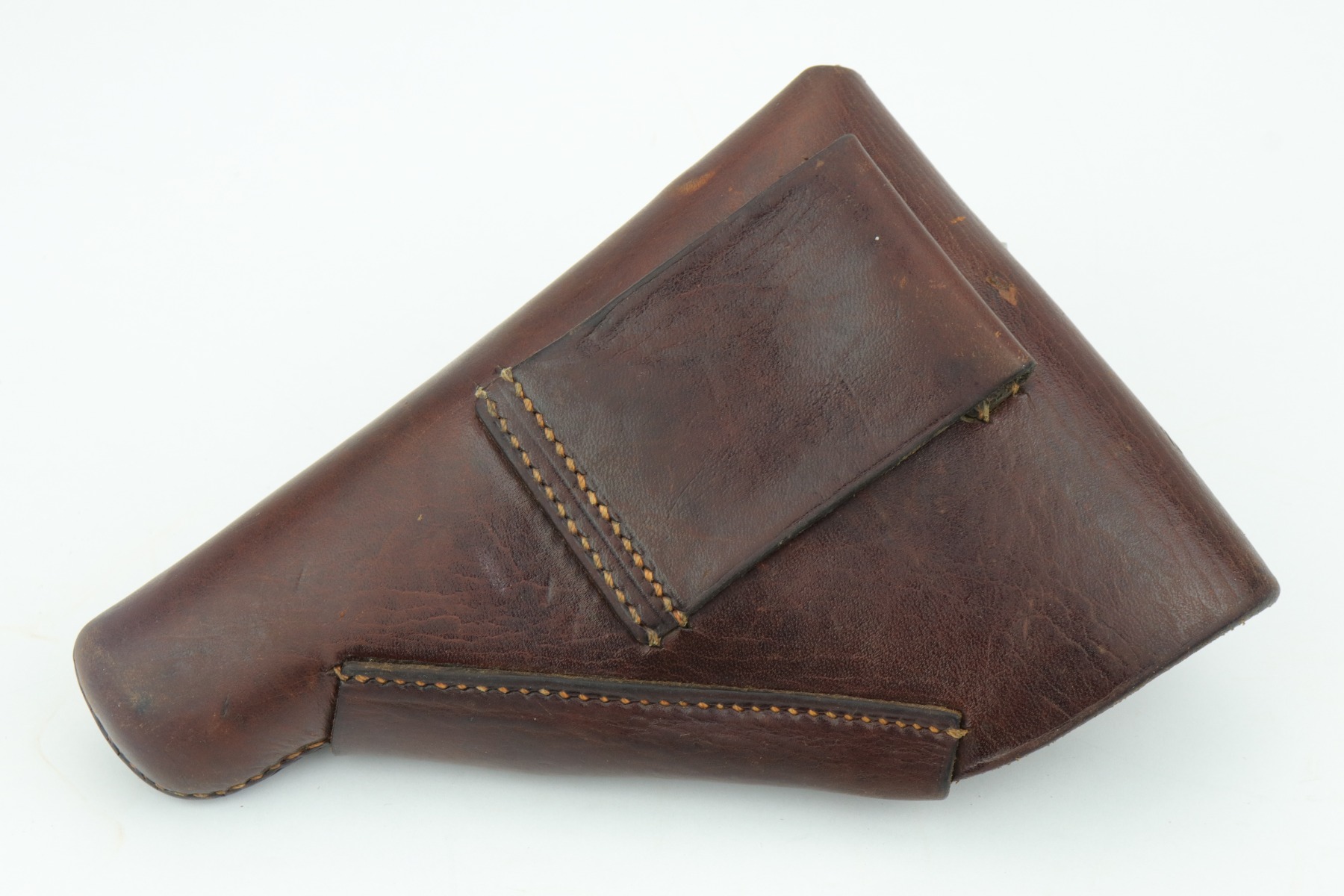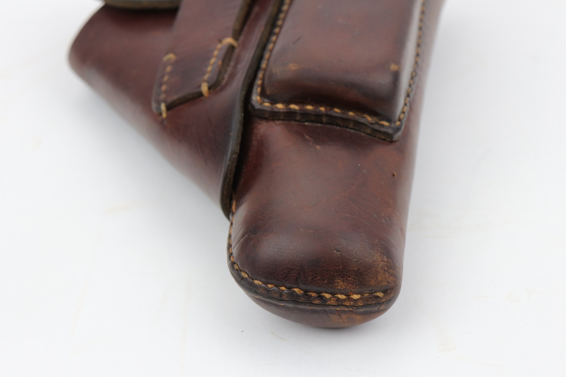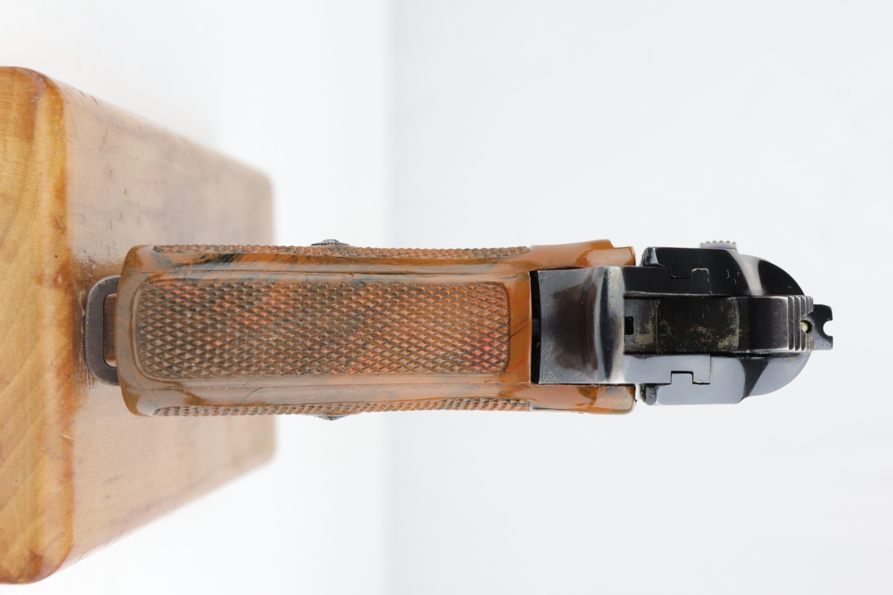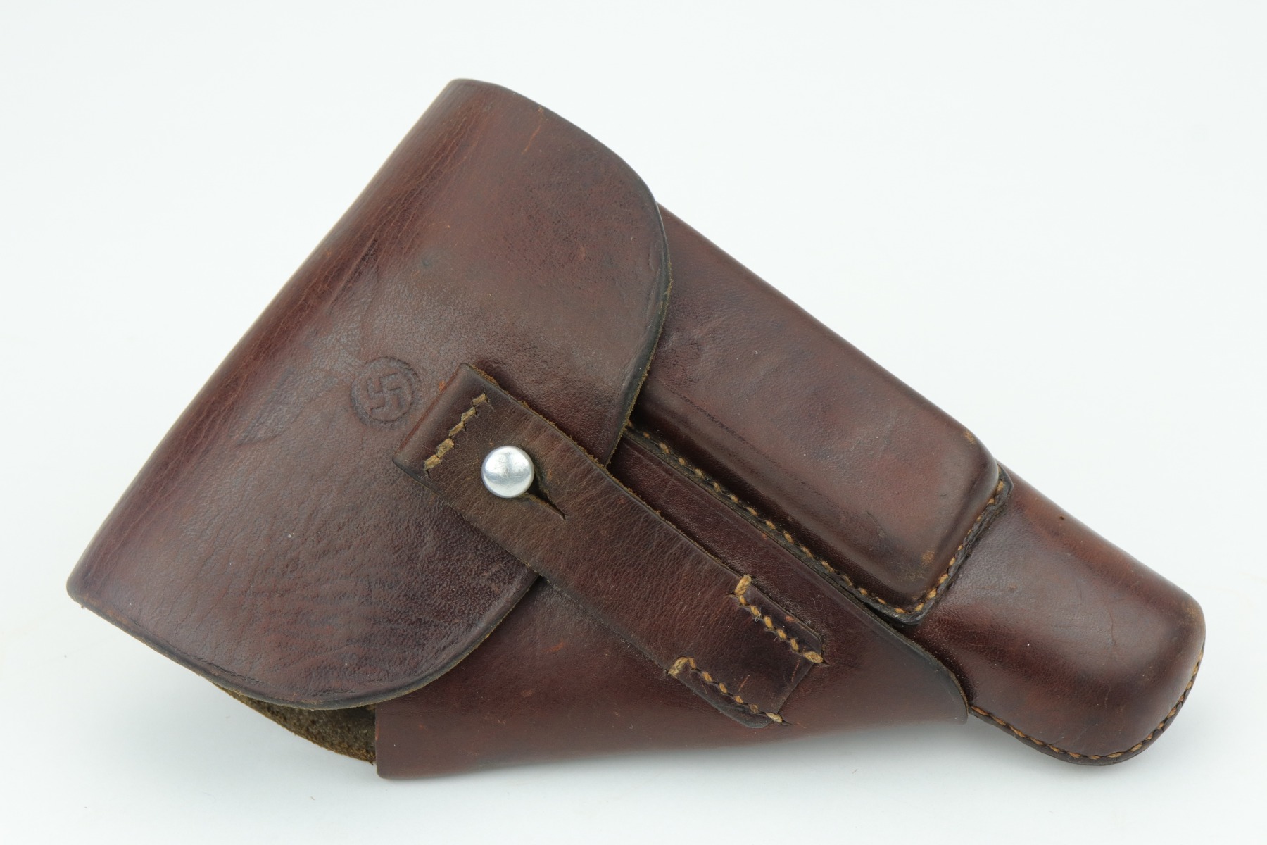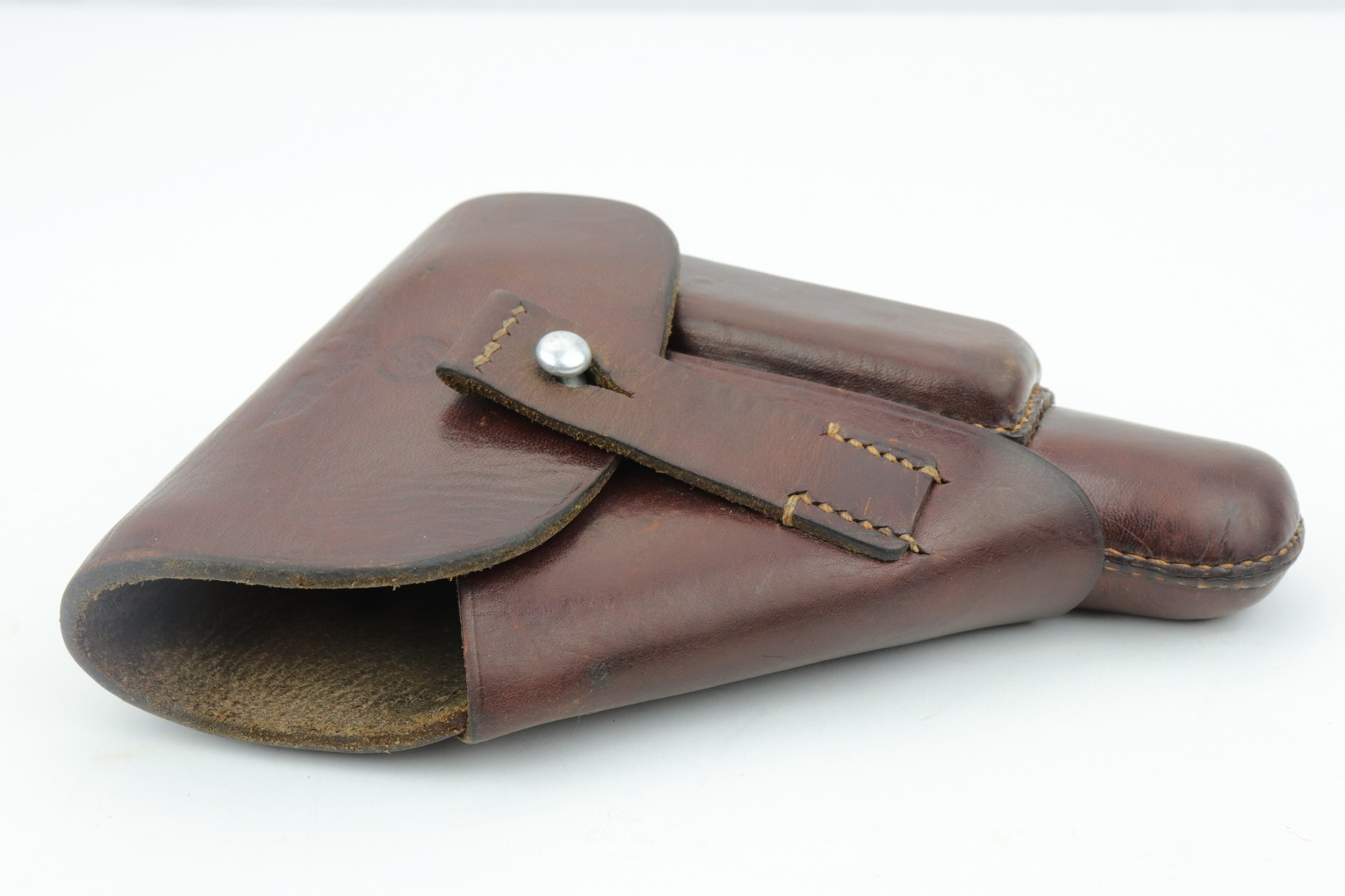 11/13/19 – This is an all original and guaranteed authentic Party Leader PPK from 1938. We have done some YouTube videos on these guns and they are without question one of the popular collectible weapons we sell. The most important part is the grip. These were offered to Party Leaders worthy of merit in 1938 and 1939. They were offered with the Party Leader holster as well. This holster is a coffee brown color which is a little rarer than the tan PL holster. The grip is in excellent condition except for two extremely minor stress hairline fracture on each side of the grip. The finish on the gun is original and excellent, around 97%. There is minor muzzle wear and wear on the right side of the slide. It comes with the proper finger extension magazine as well as a spare magazine. Excellent bore. We can provide a certificate of authenticity upon request. Also upon request, we could break the rig up: $9,850 for the gun and $3,000 for the holster.