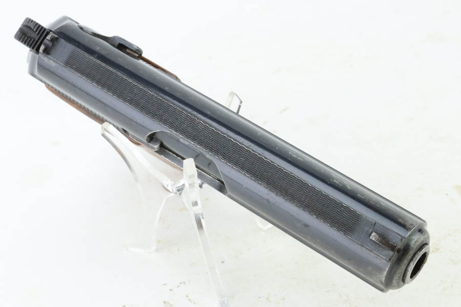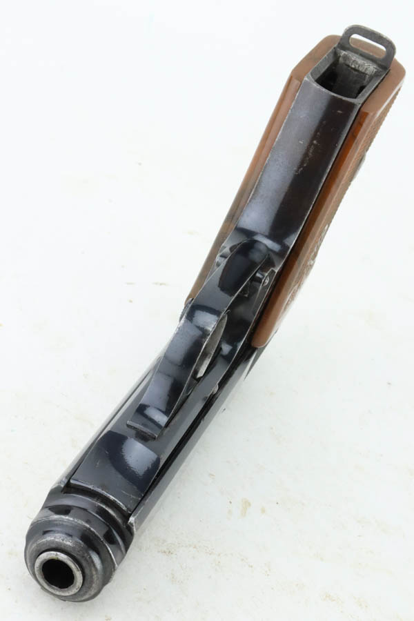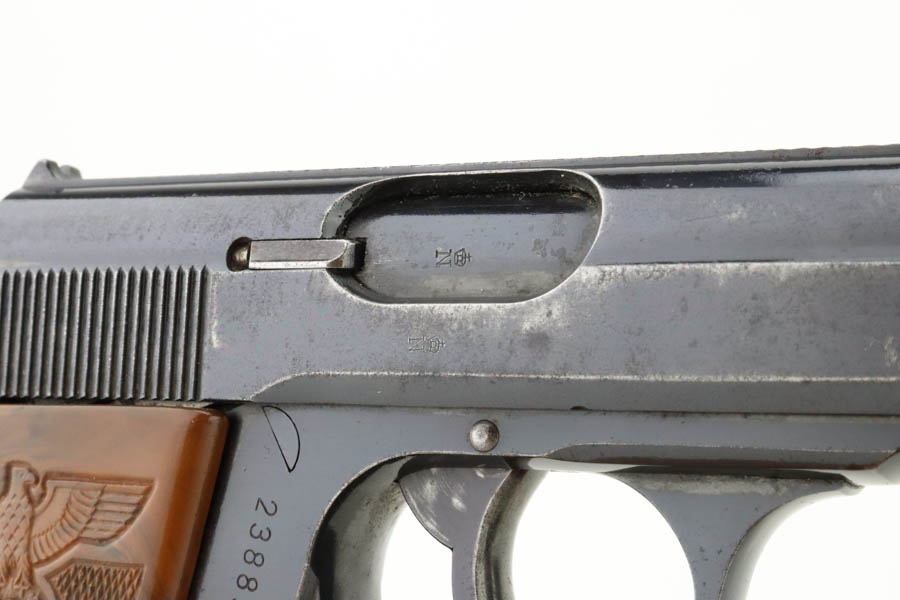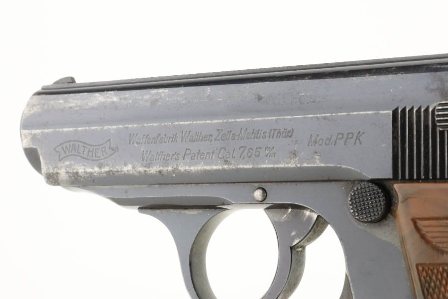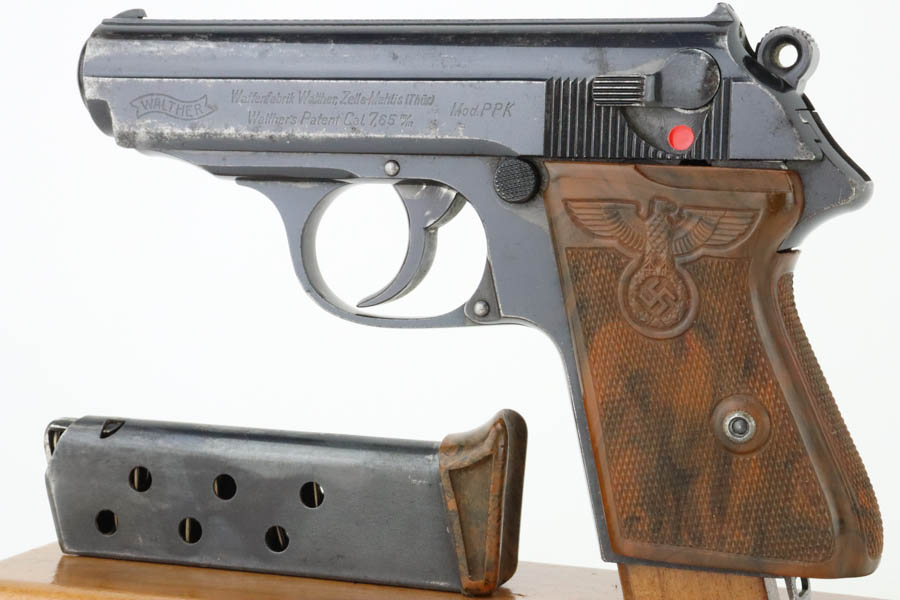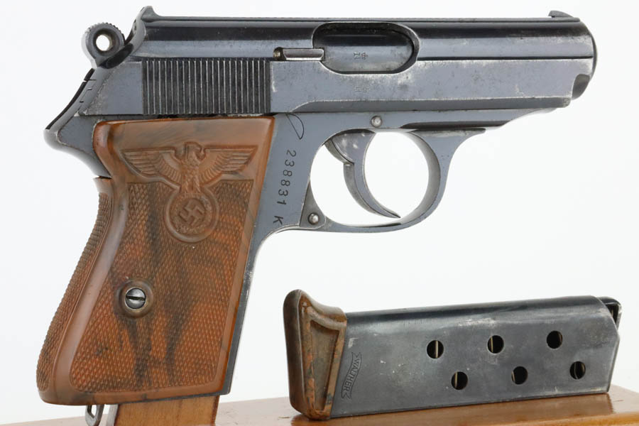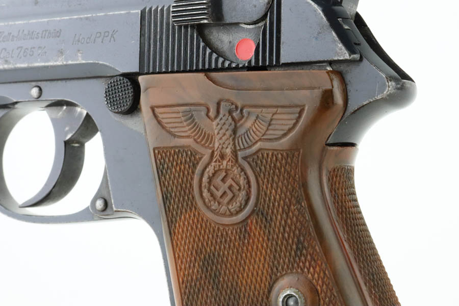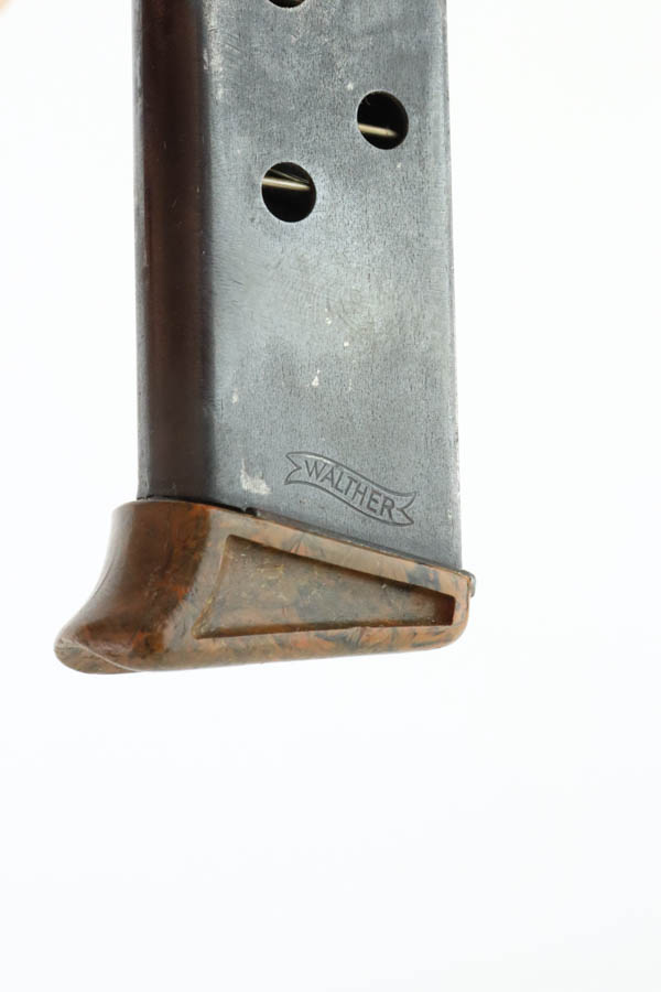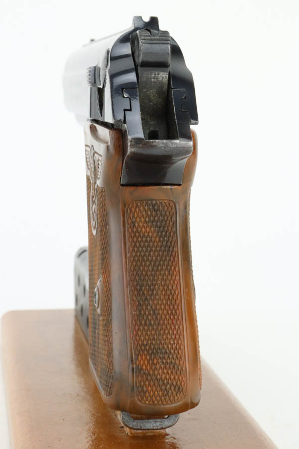7/11/24 – This is a nice example of a Walther PPK sold in the commercial market in 1939. All matching and “Crown N” proofed. It is fitted with a quality reproduction Nazi Party Leader grip. Comes with a period-correct finger extension magazine. The gun’s original high polish finish rates about 93% with general high edge and muzzle wear. Light pin-pricking along both sides of the slide and on the front strap. Mint bore.