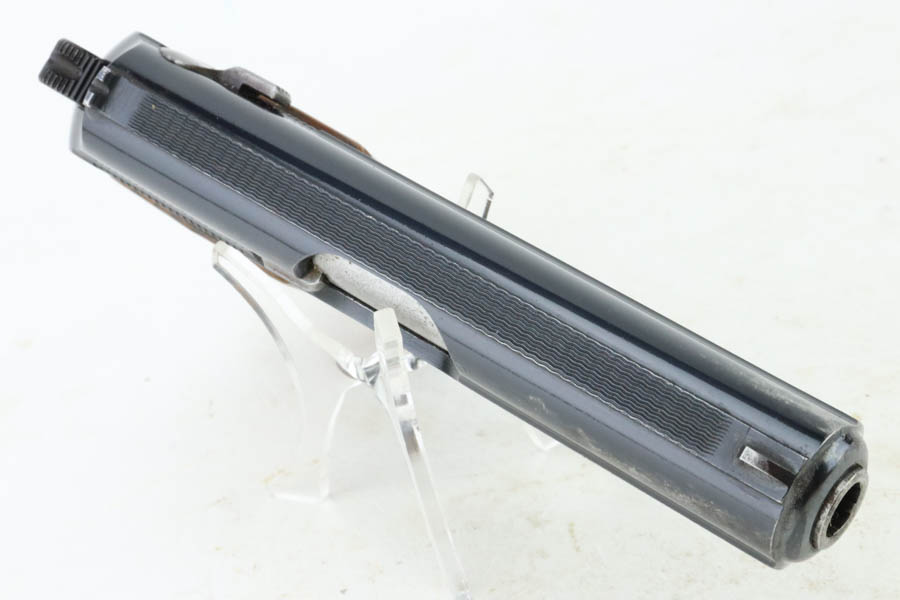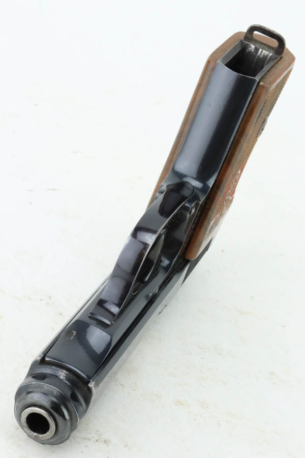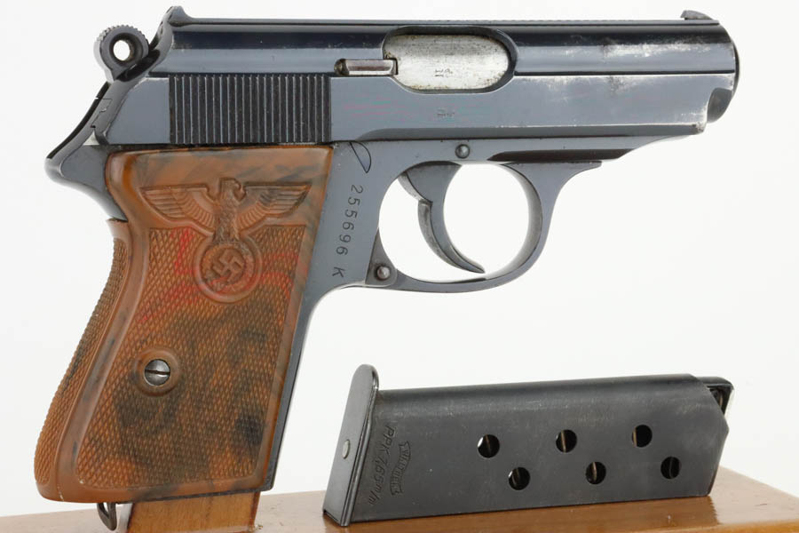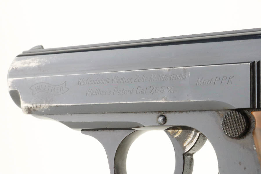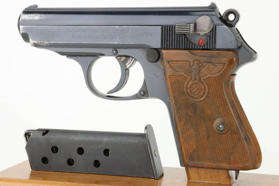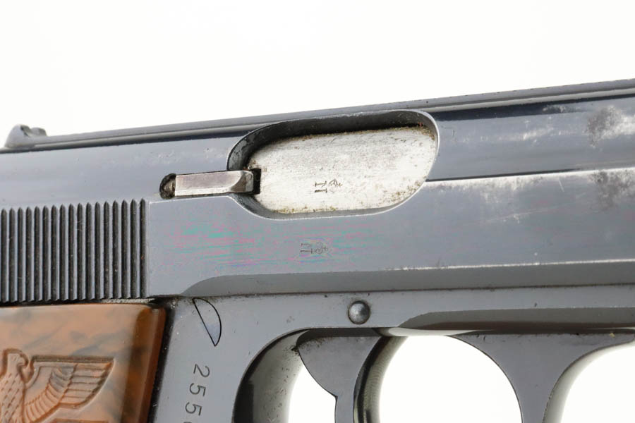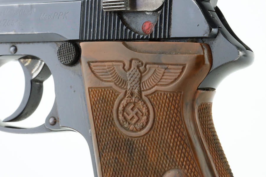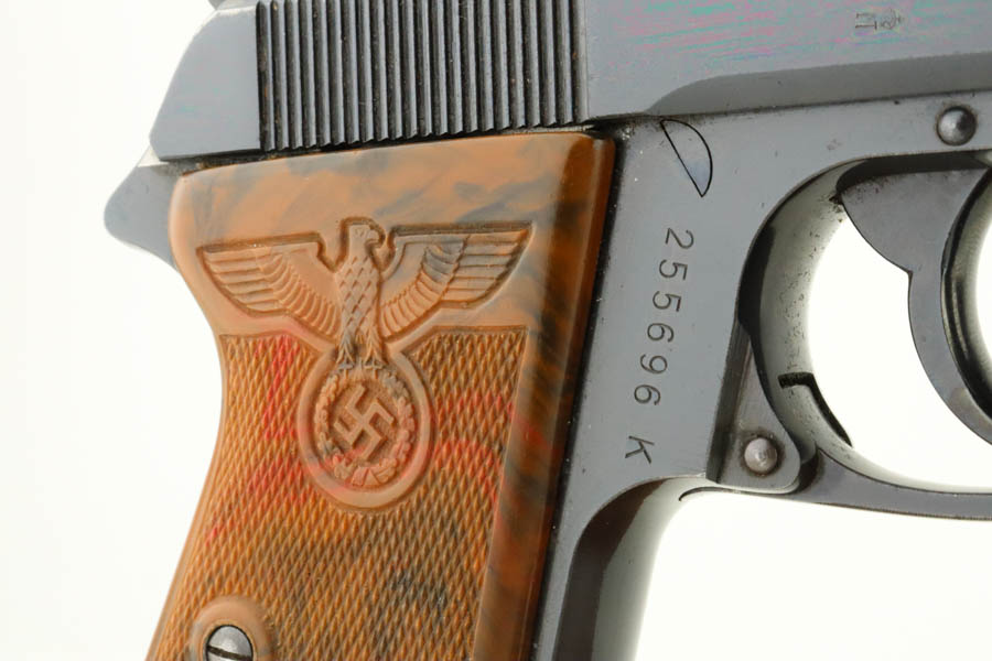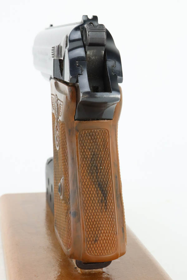 7/15/24 – This is a nice example of a Walther PPK sold in the commercial market in about 1939. All matching and “Crown N” proofed. It is fitted with a quality reproduction Nazi Party Leader grip. Comes with a wartime magazine. The gun’s original high polish finish rates about 93% with muzzle wear and some spotty wear along the right side of the slide. Mint bore.
