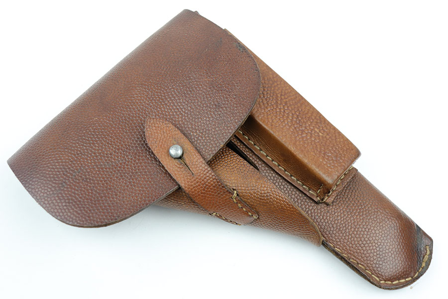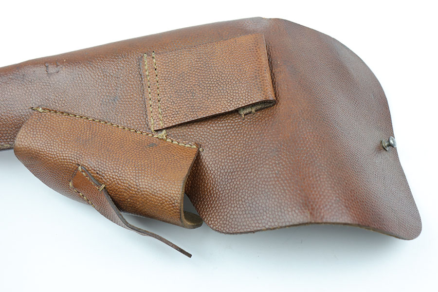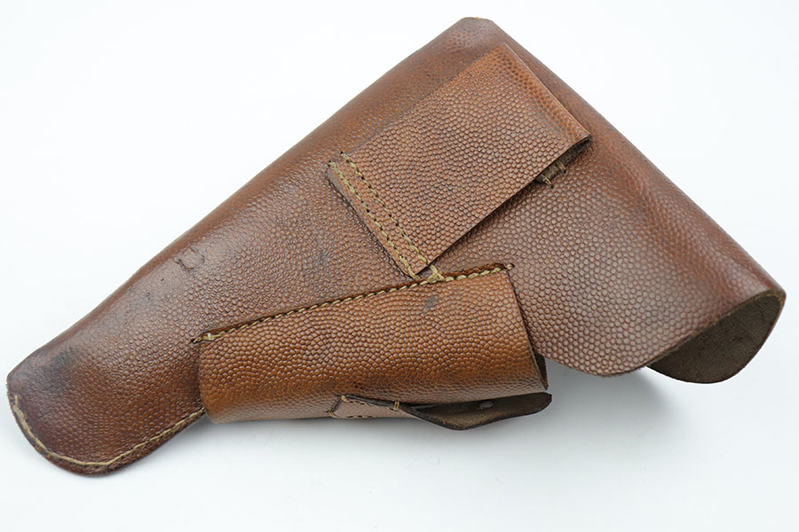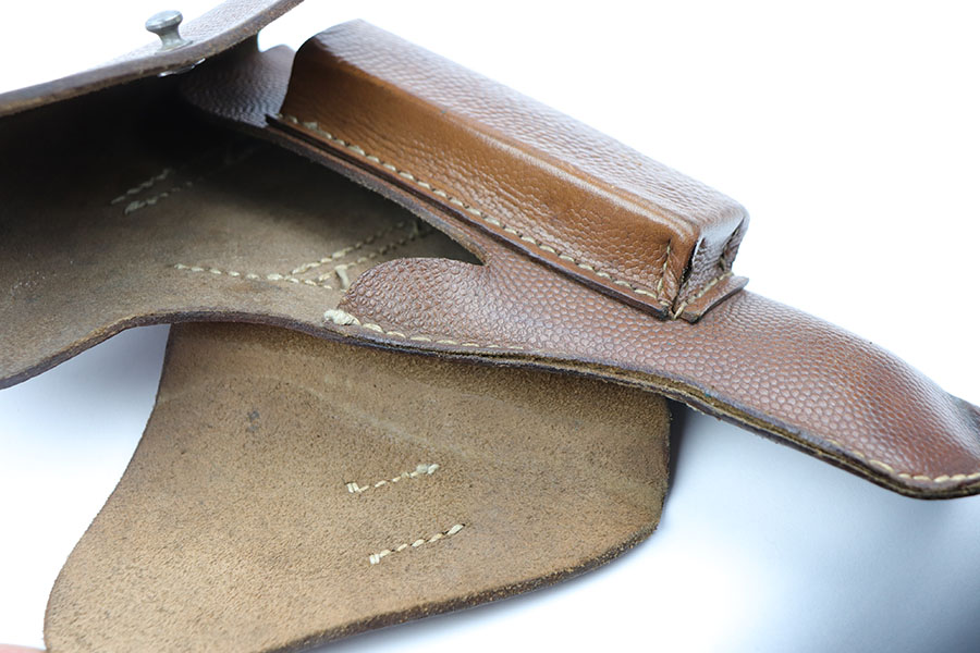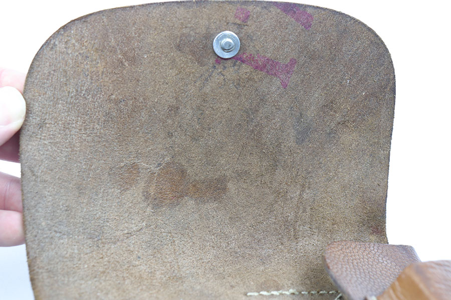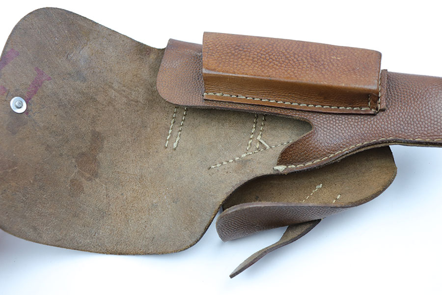 11/2/19 – This is an original 1944 production Hi Power holster. The back of the holster is maker stamped and dated, although it’s very faint. We tried to get a clear photo, but it’s “jkh” with a “4” underneath. The holster has excellent leather and stitching, as well as a clean interior. Only shows minor signs of use. Great late war example.