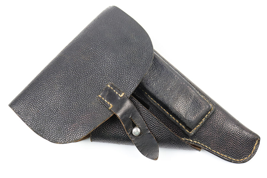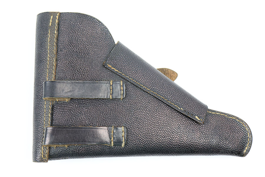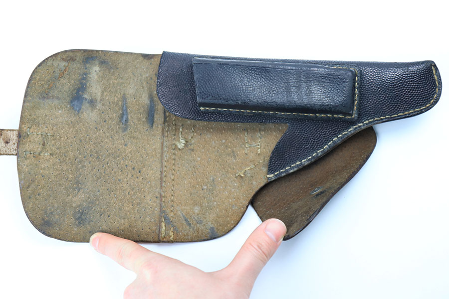 4/29/21 – This is an unusual, late WW2 production P.38 holster. The holster is unusual for many reasons. First, the leather is a pebble grain on the exterior, but appears pigskin on the interior. Second, there are no maker markings or stamps. Third, we’re not sure if this is for a commercial P.38 or an end-of-war military P.38. The leather and stitching are in excellent condition but show some mild signs of aging. There are a few missing stitches on the side flap, but this is minor. See photos.