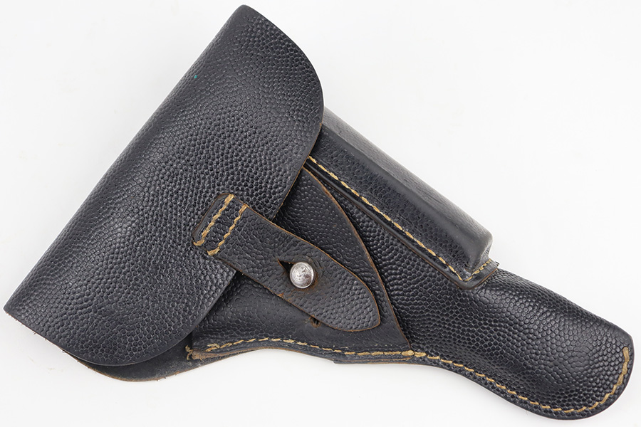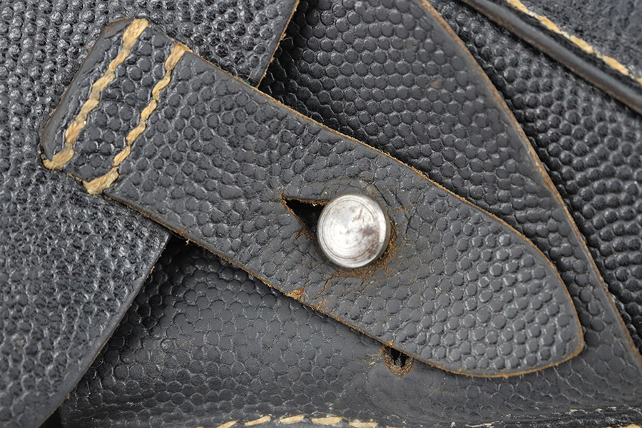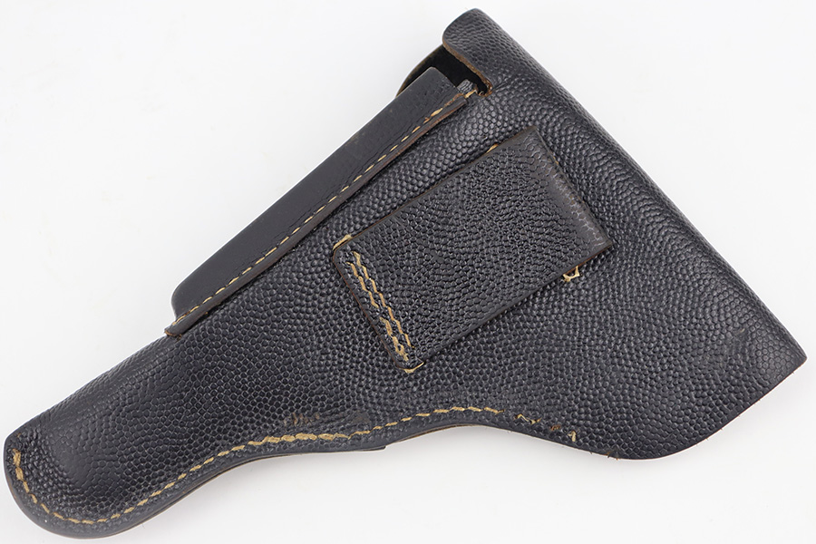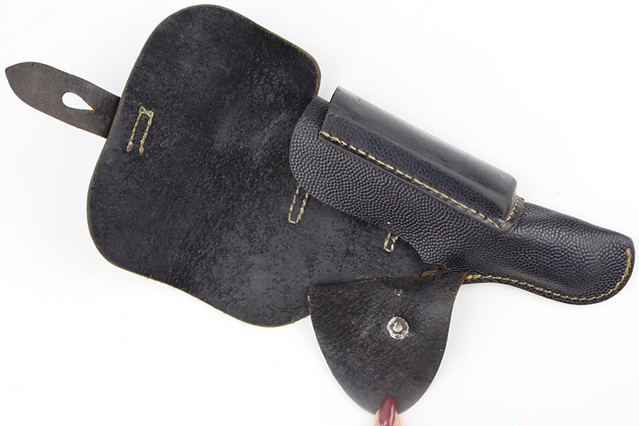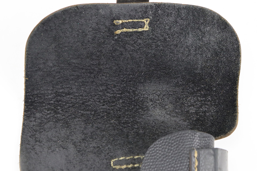 11/30/23 – This is an original late WW2 production FN Browning M1922 holster. The holster has very nice black pebble grain style leather. The interior leather is maker and date stamped “bdr 44” with a waffen military proof stamp as well. There’s some use wear and normal pliability throughout the leather. The side flap has one small hole near the closure stud, but this is a very minor flaw. Excellent, all original stitching intact.