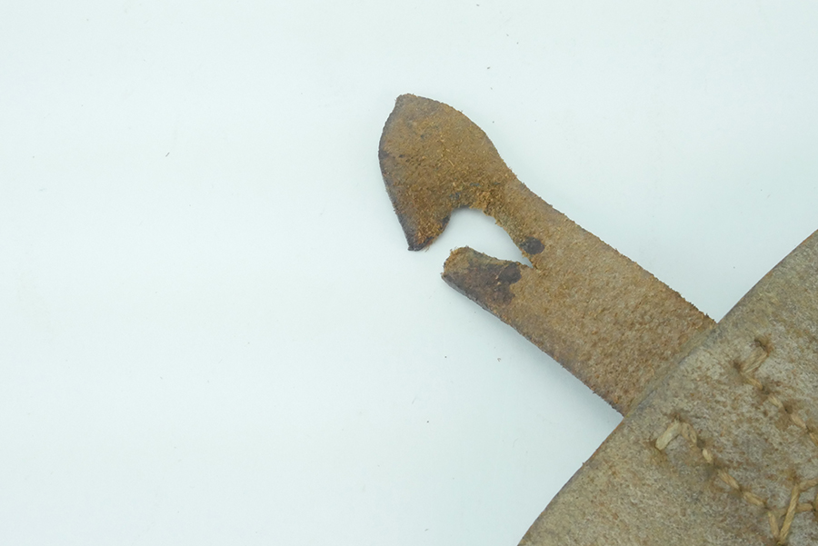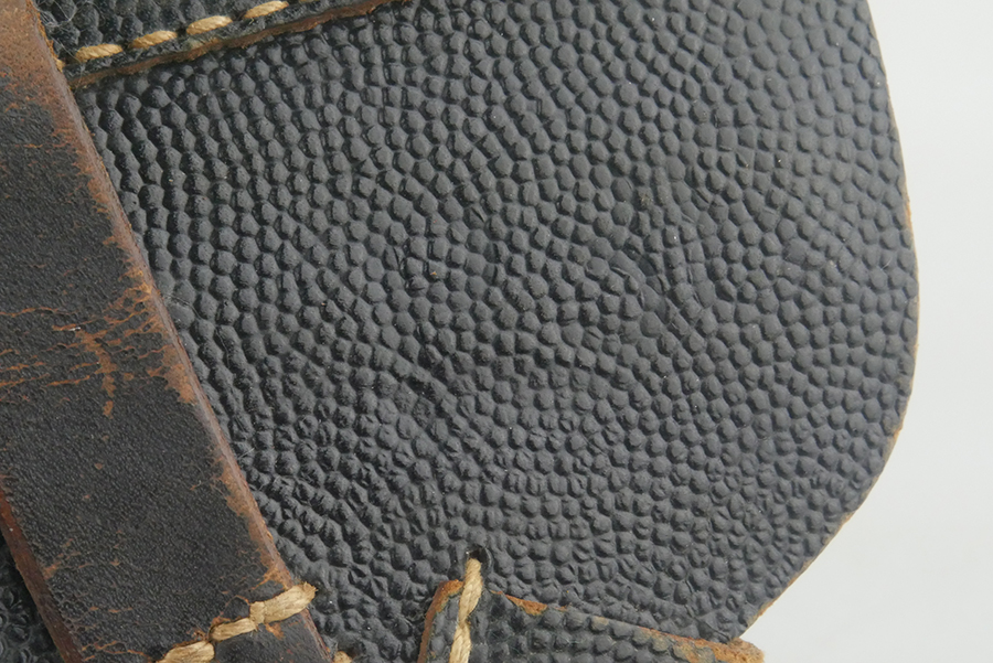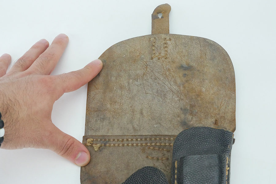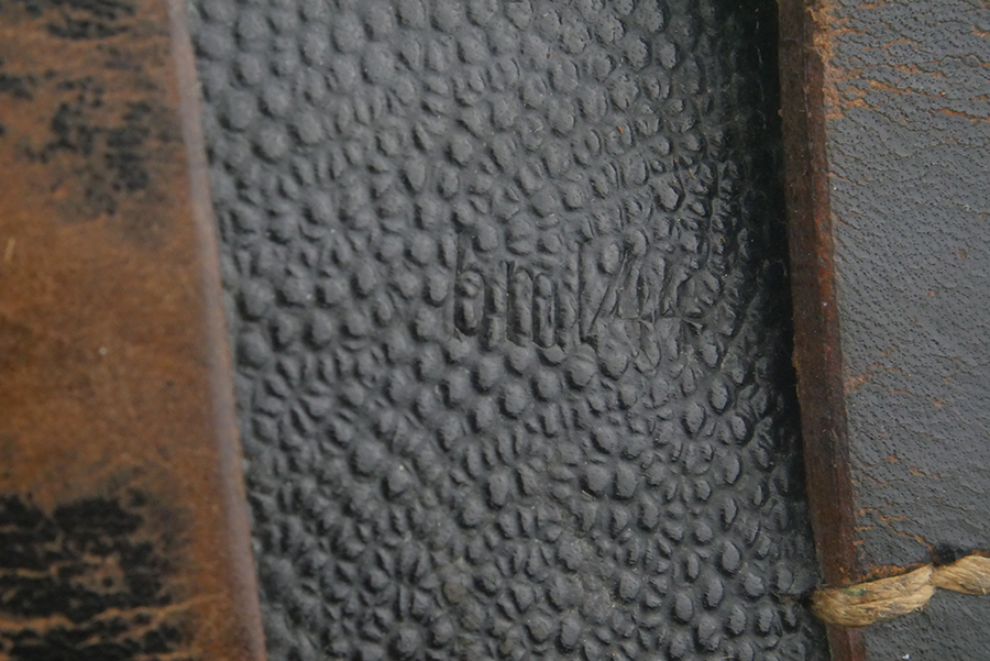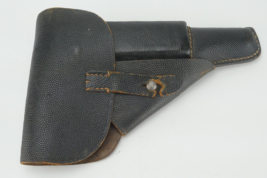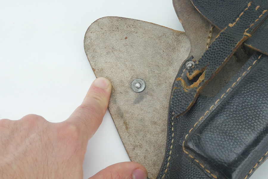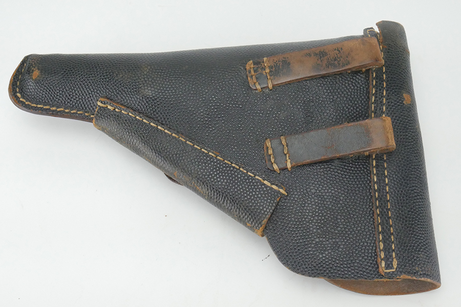 9/10/24 – This is an original WW2 production pebble grain leather P.38 holster. The holster is in overall good condition. The interior leather is fairly clean but there are a few light scuff marks. The backside of the holster has a “bml” maker code and 44 date stamp along with a waffen eagle military proof stamp and the “P.38”. These stamps are very hard to see due to the pebble grain leather. The straps on the back of the holster do show wear that is consistent with the holster being worn, additionally, the toe and flap also have spots of wear. The closer strap on this holster is present, however, the strap leather is torn. There is a minor tear in the flap of the holster as well as the stitching along the flap. The leather on the holster remains pliable and maintains the majority of it’s original finish.