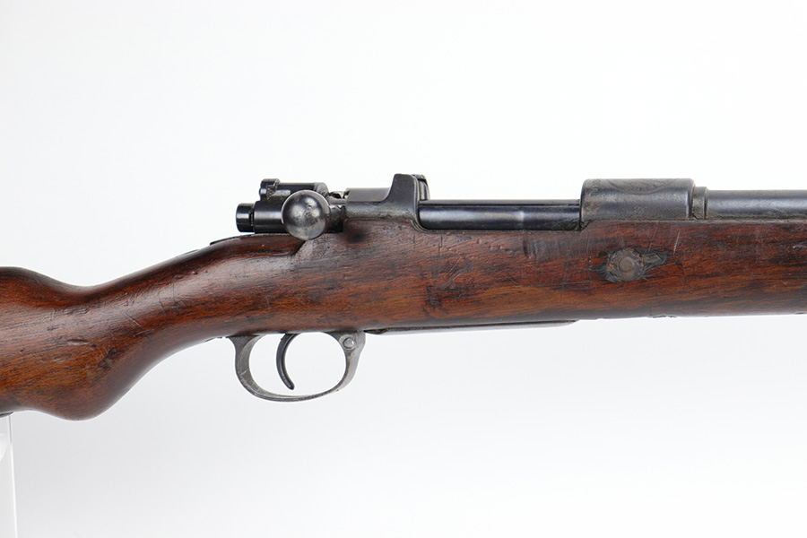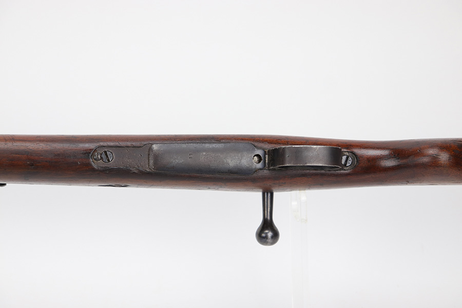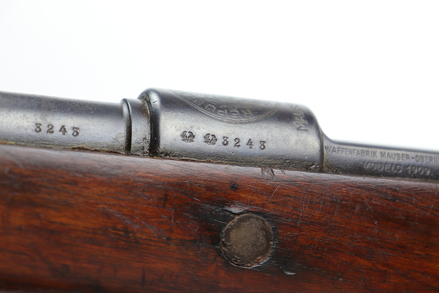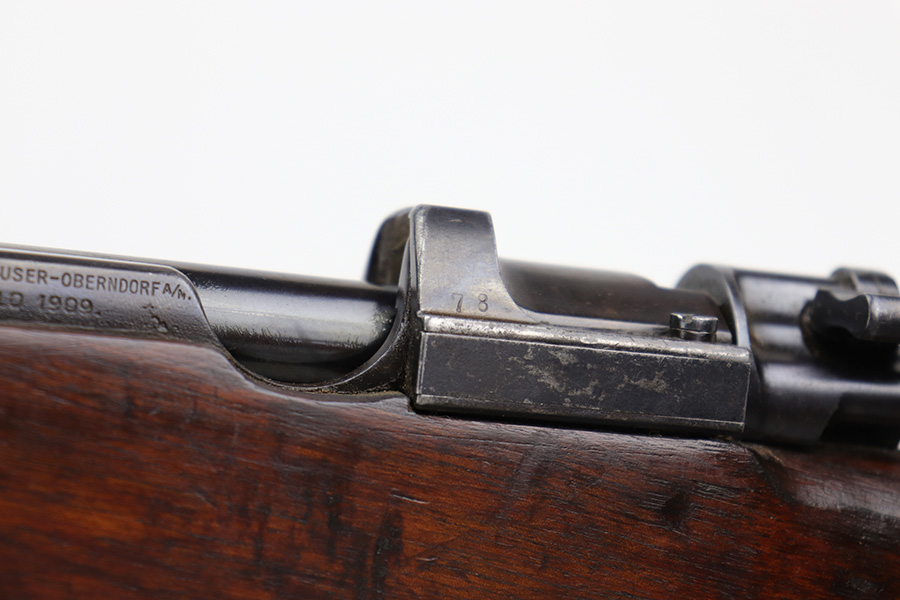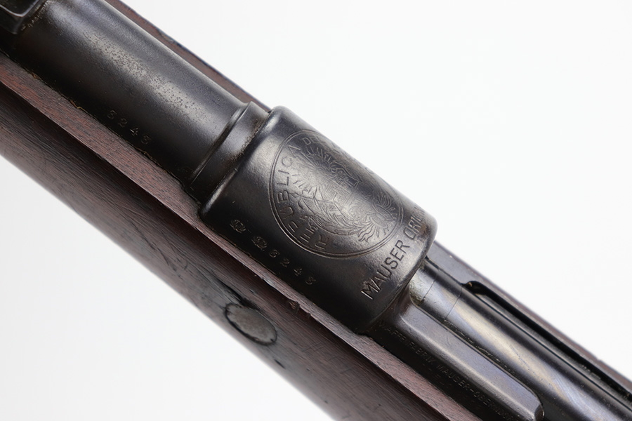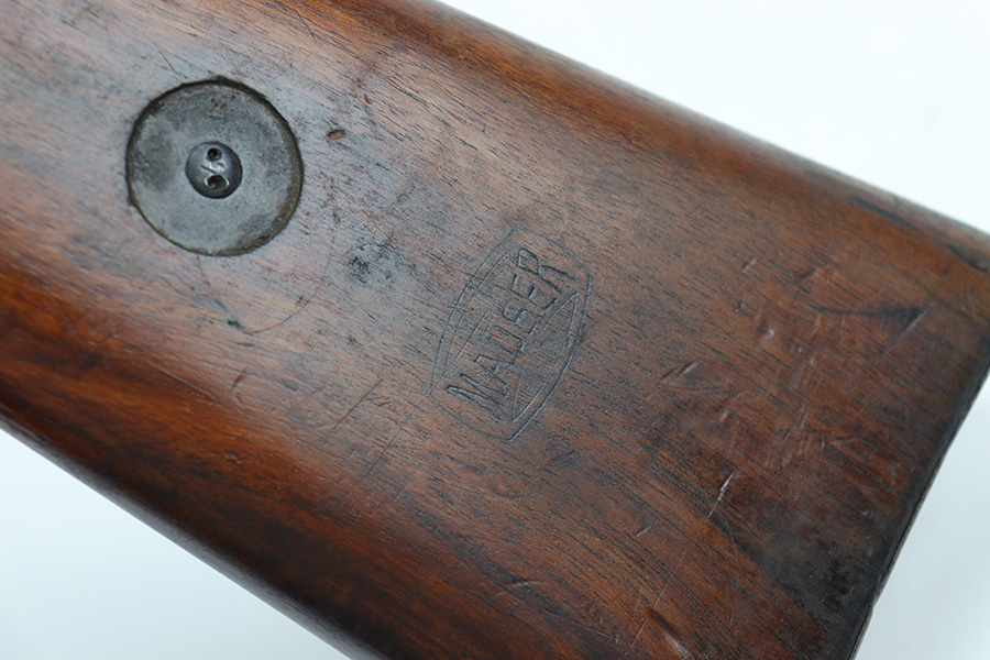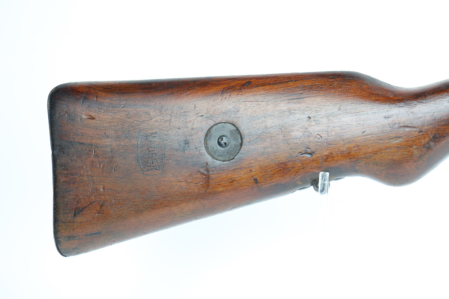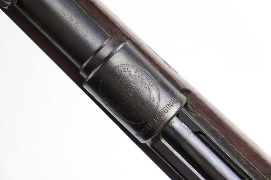 8/4/23 – This is a nice example of a Peruvian-contract Mauser Model 1909 rifle, manufactured between 1910-1914. The gun is mismatched but has the proper Peruvian crest on the receiver. No import marks. The entire gun has been refinished. There is very little actual bluing loss, but there are areas of pin-pricking under the finish throughout and some small dings on the floor plate / trigger group. Minor dings and scratches on the stock throughout. Mauser banner logo on the right side of the butt stock. The bore has good rifling with just minor pin-pricking throughout.