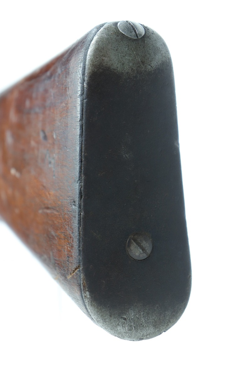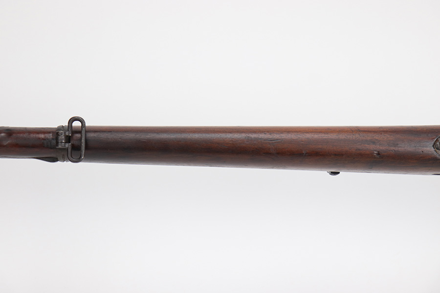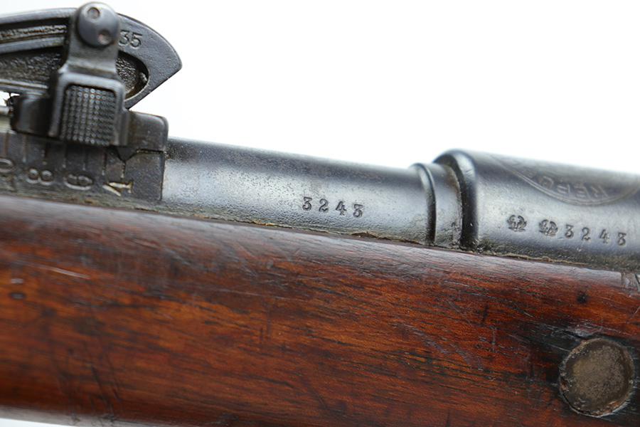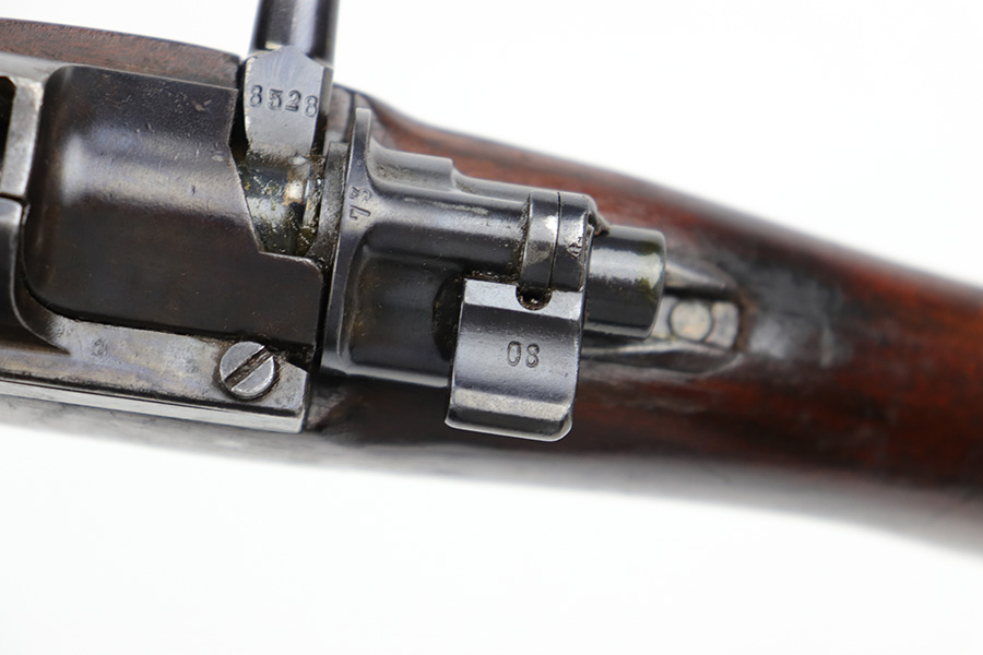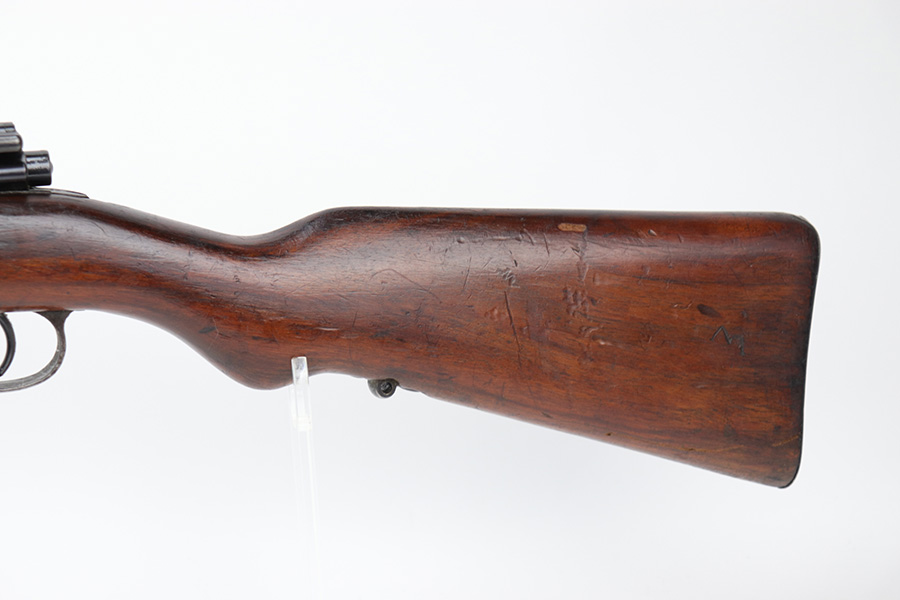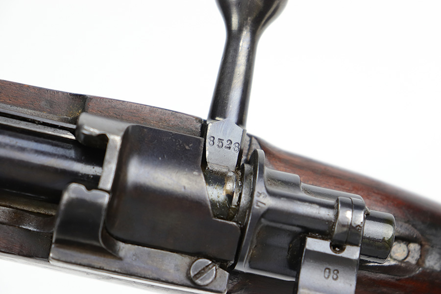 8/4/23 – This is a nice example of a Peruvian-contract Mauser Model 1909 rifle, manufactured between 1910-1914. The gun is mismatched but has the proper Peruvian crest on the receiver. No import marks. The entire gun has been refinished. There is very little actual bluing loss, but there are areas of pin-pricking under the finish throughout and some small dings on the floor plate / trigger group. Minor dings and scratches on the stock throughout. Mauser banner logo on the right side of the butt stock. The bore has good rifling with just minor pin-pricking throughout.