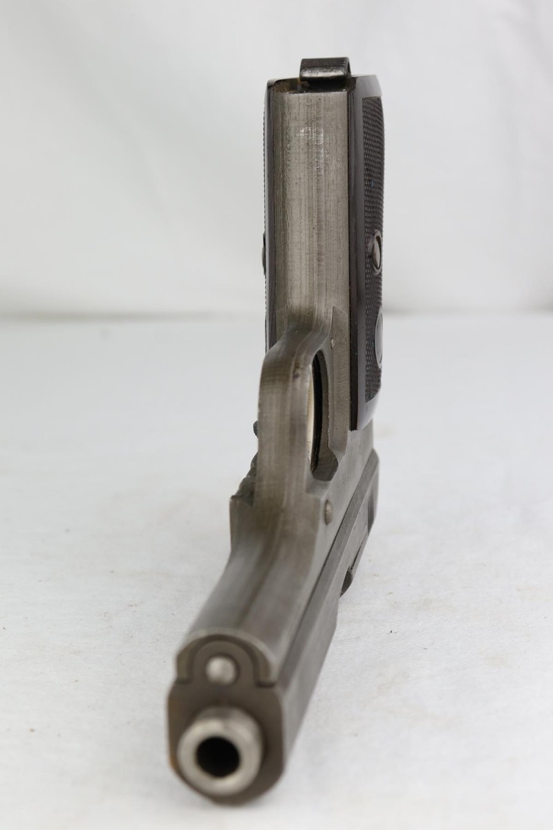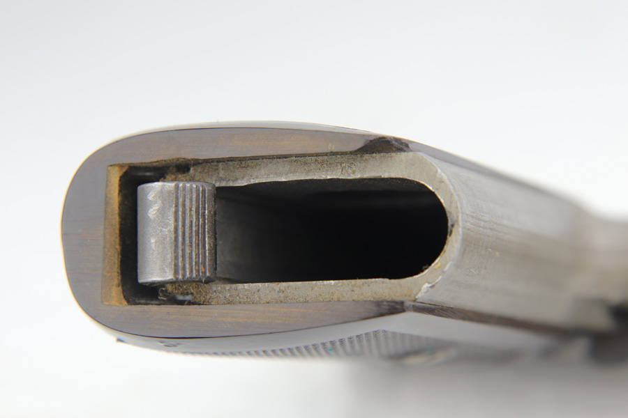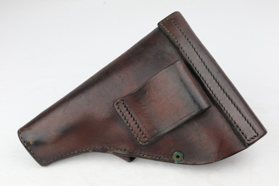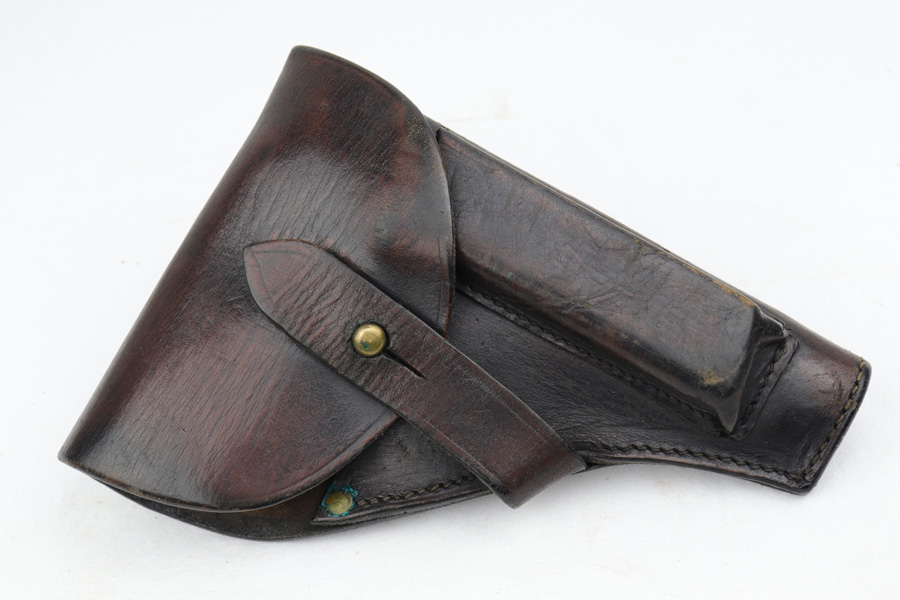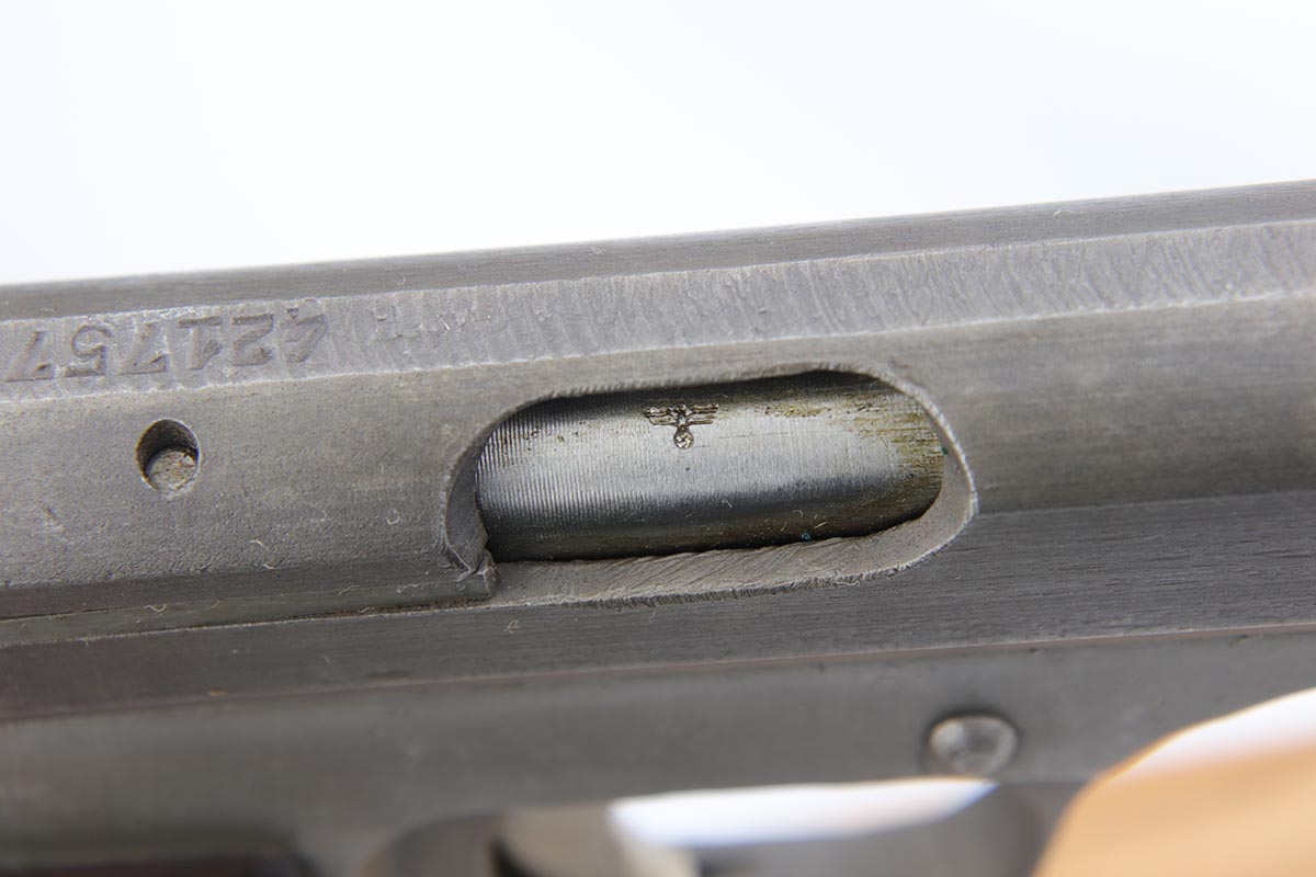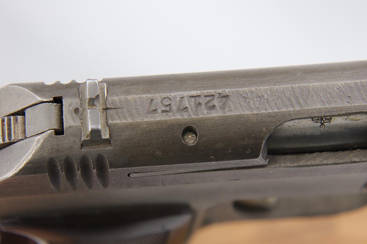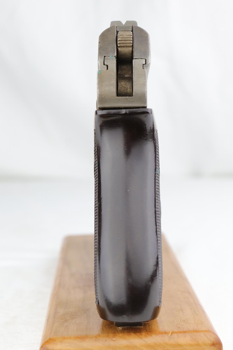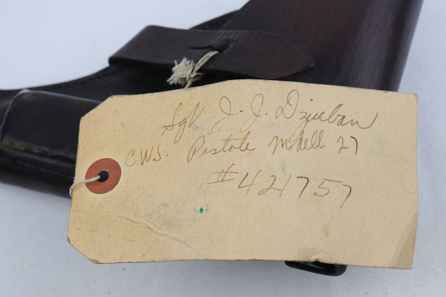 1/18/19 – This is an excellent example of a late-war Nazi CZ 27 rig with phosphate finish and the original GI tag on the holster. The gun is all matching and original with ~95% phosphate finish remaining, showing minor edge thinning from the holster. Excellent grip with no chips or cracks. Terrific bore. The holster is in fantastic condition but unmarked. The GI tag is serialized and matching to the gun. This rig comes to us from the nephew of the vet and accompanies the P.38 rig that was listed today.