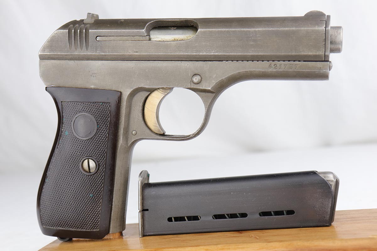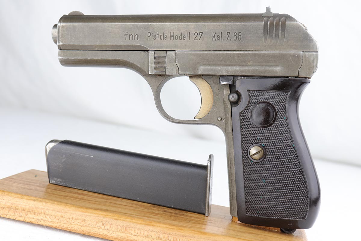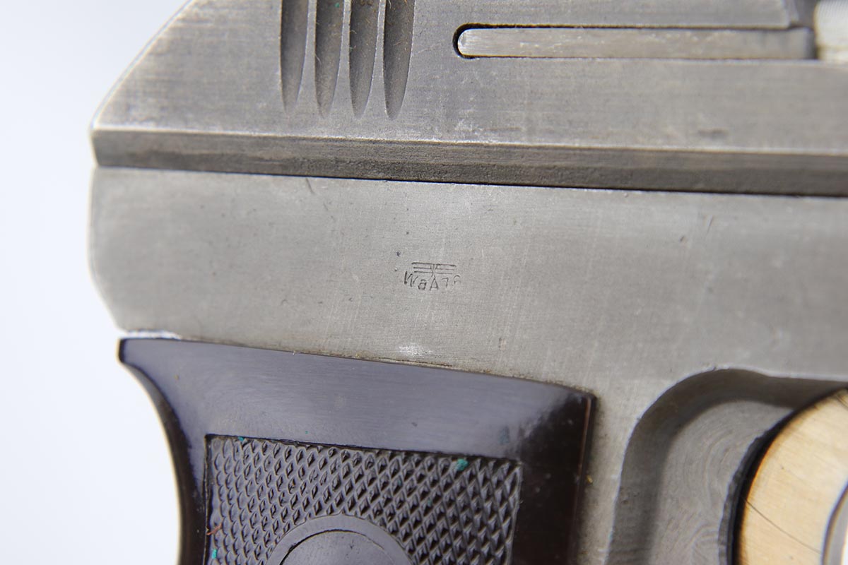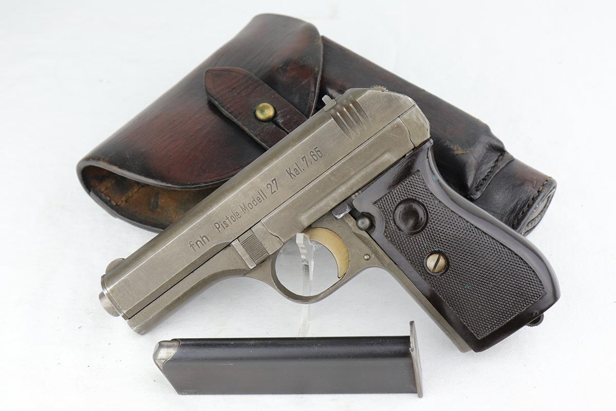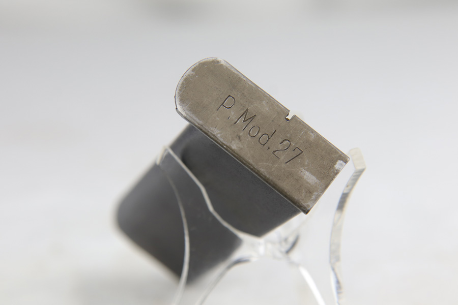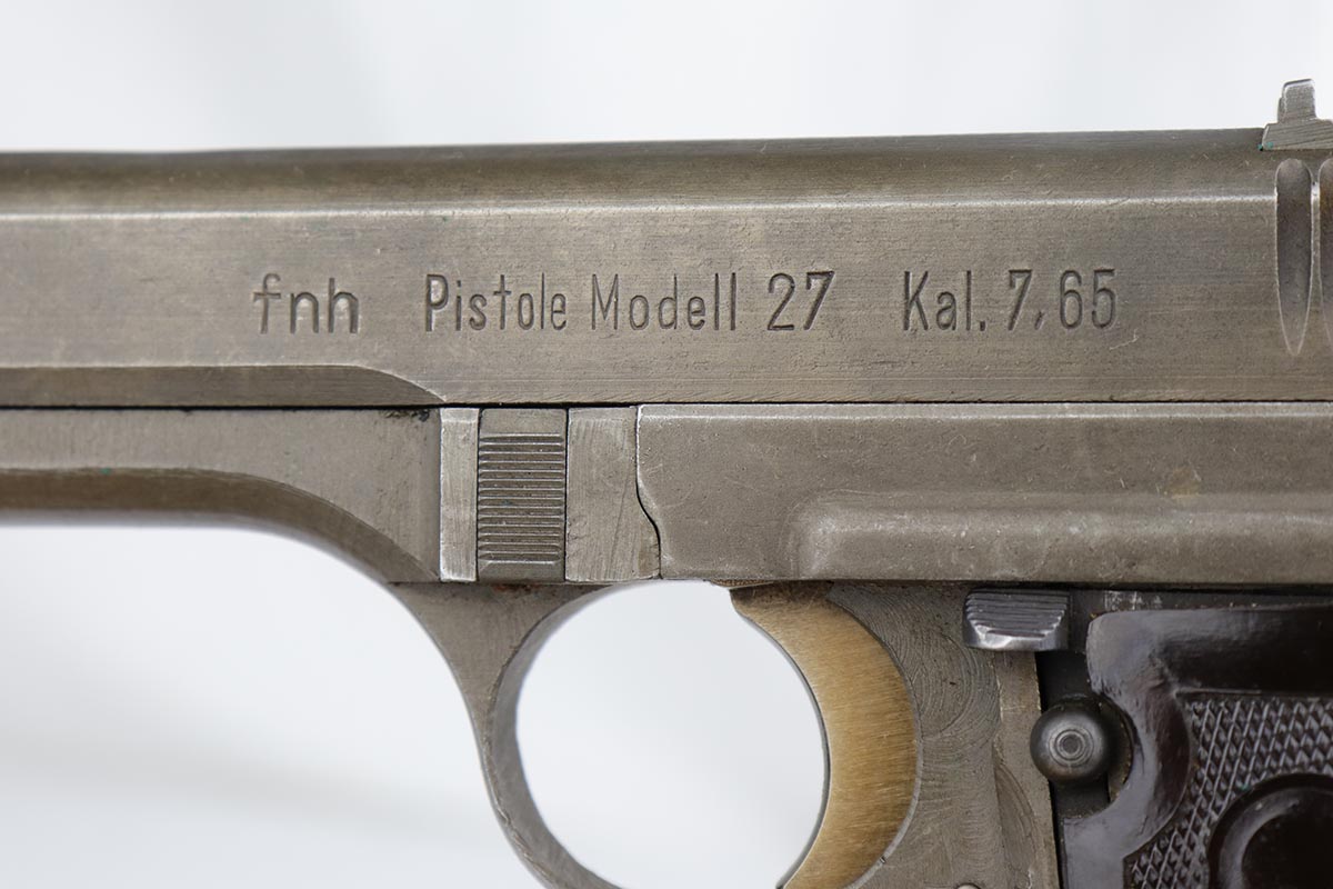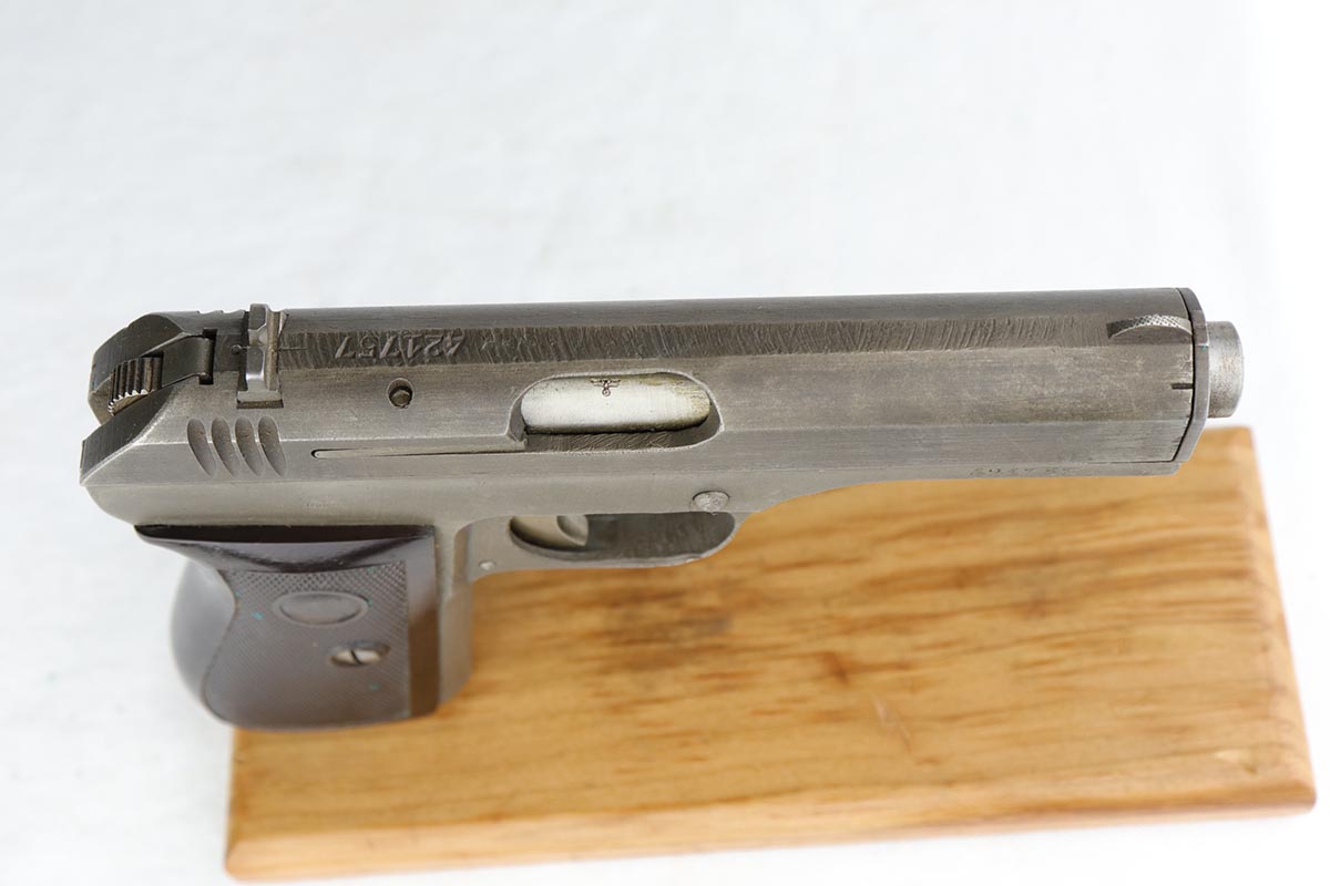 1/18/19 – This is an excellent example of a late-war Nazi CZ 27 rig with phosphate finish and the original GI tag on the holster. The gun is all matching and original with ~95% phosphate finish remaining, showing minor edge thinning from the holster. Excellent grip with no chips or cracks. Terrific bore. The holster is in fantastic condition but unmarked. The GI tag is serialized and matching to the gun. This rig comes to us from the nephew of the vet and accompanies the P.38 rig that was listed today.