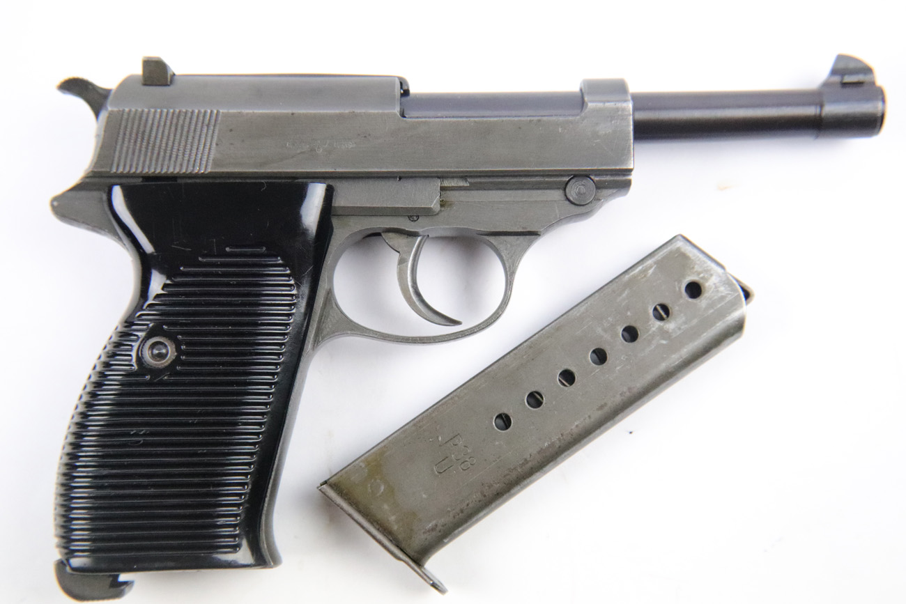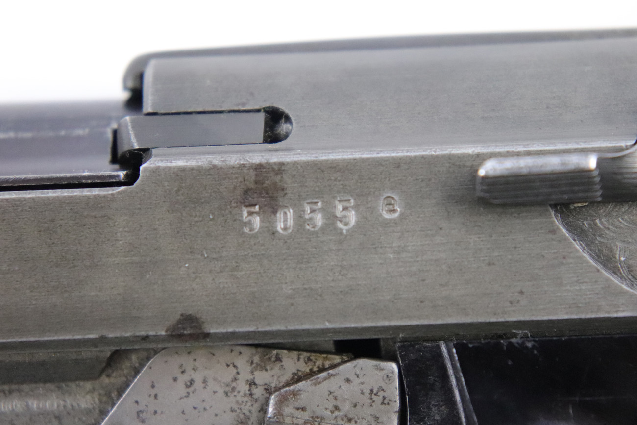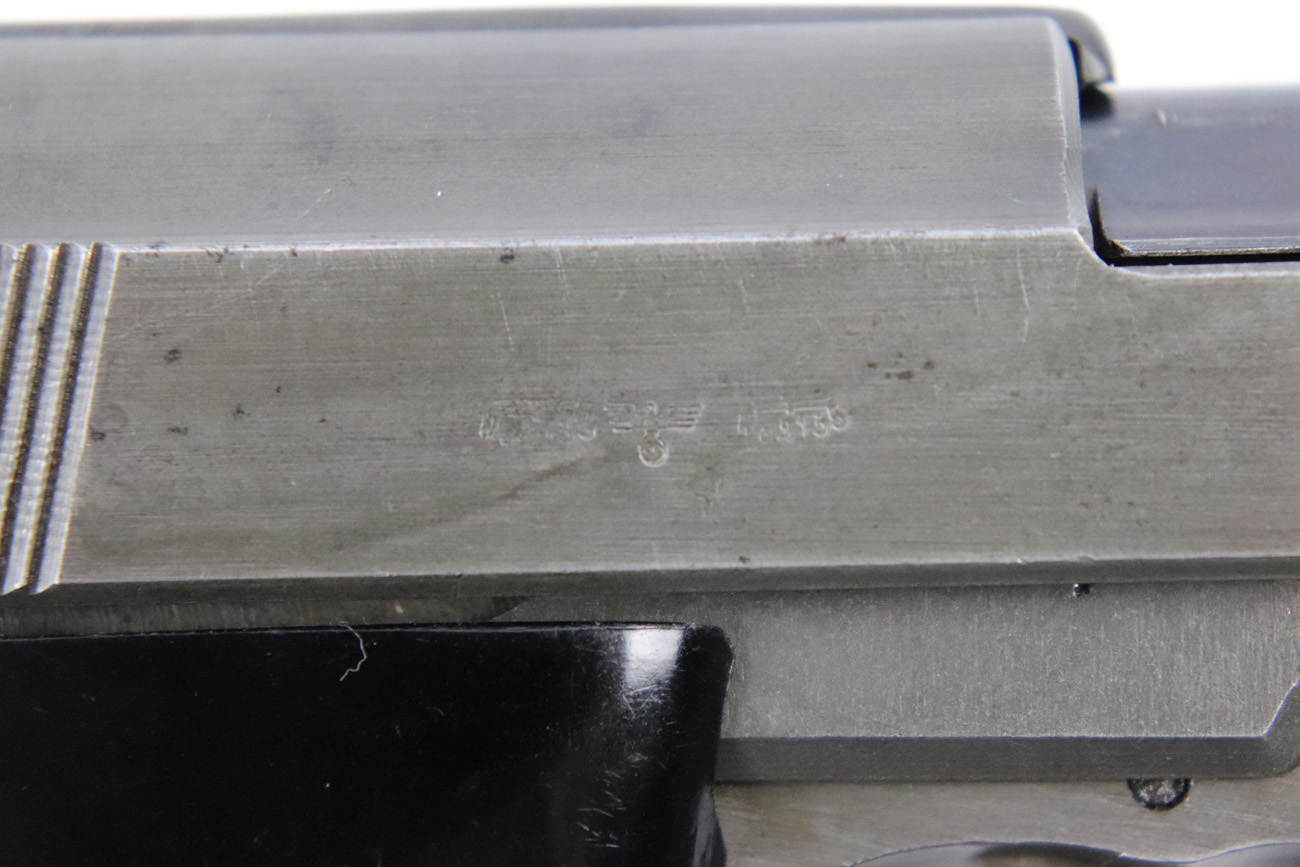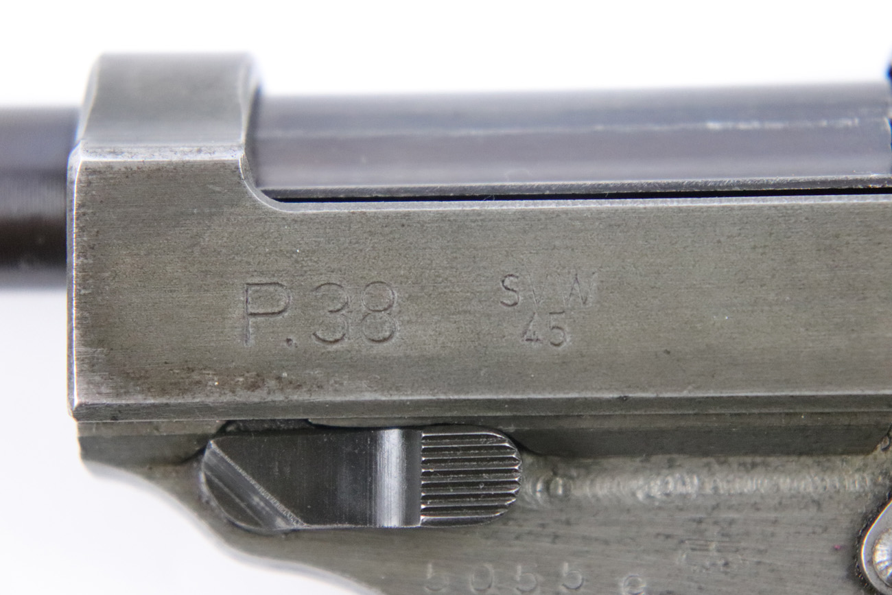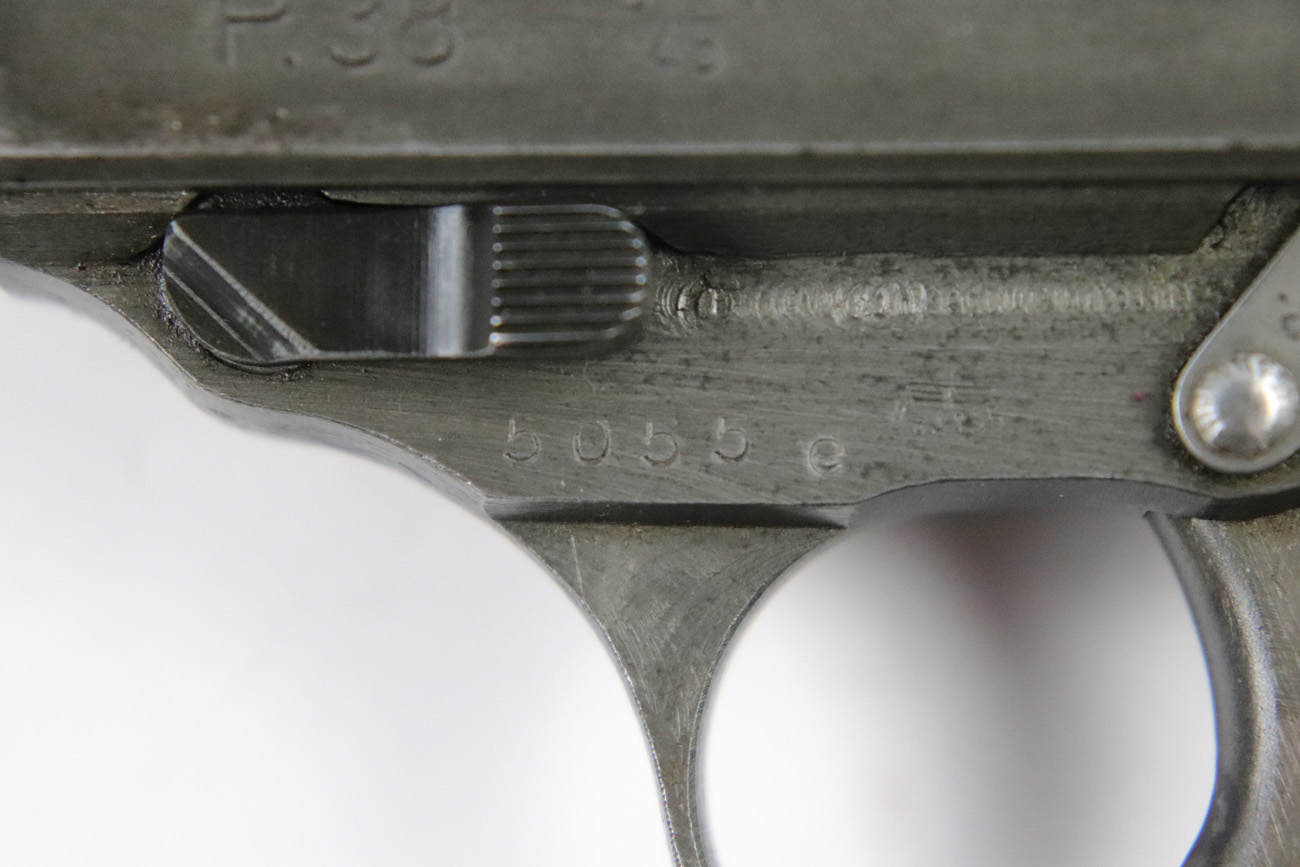 5/10/18 – This is a Mauser made P,38 from 1945.   These are fairly rare as they only made guns from January to April when the factory was taken over by Allied troops.  It comes in the thin phosphate finish which gives these guns a rough but unique look, and make them highly sought after by collectors.   All parts are matching and phosphate finish with the exception of the blued finish barrel, take down lever and perhaps the hammer (not sure).   Even the magazine is phosphate, making it a very rare magazine.  It is Spreewerke, jvd marked, and right side large U marked, only done in 1945.    The bore is mirror with some light edge wear on the rifling. Overall a 9 out of 10.   Also comes with the correct Mauser black plastic grips.  Mechanically it works well. de-cocker functions properly.   All original and authentic late war gun !