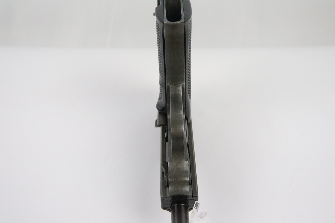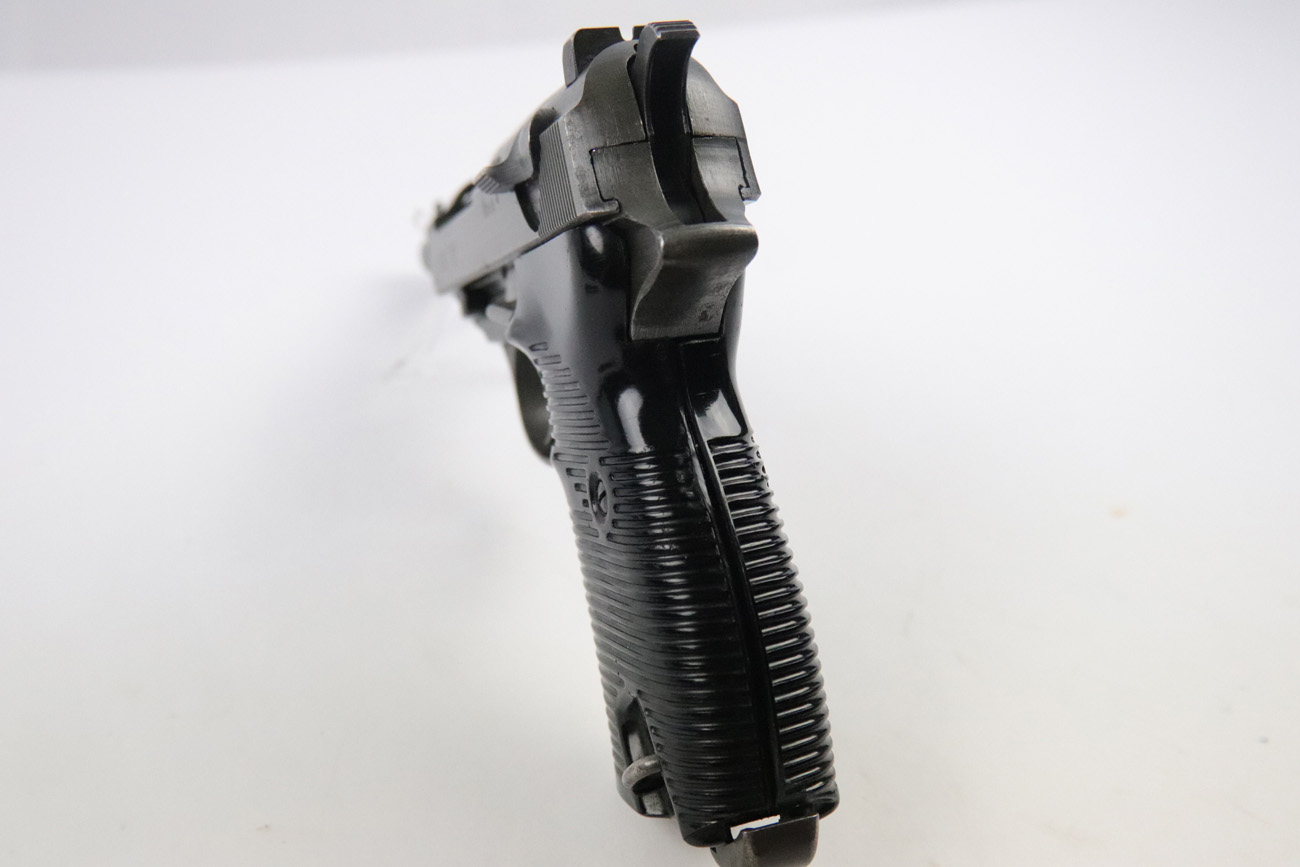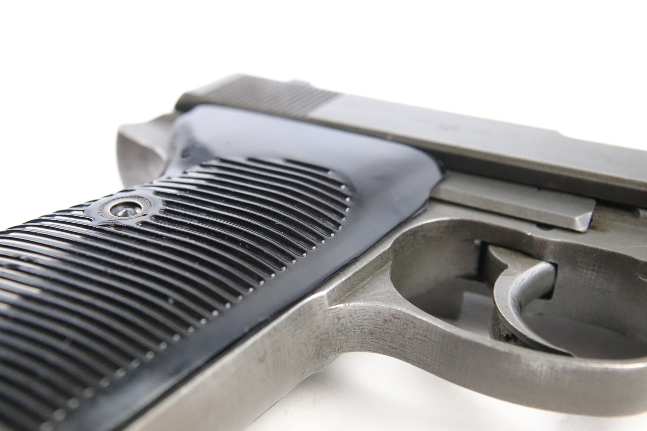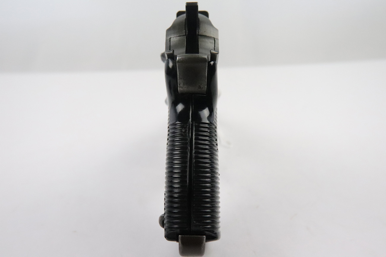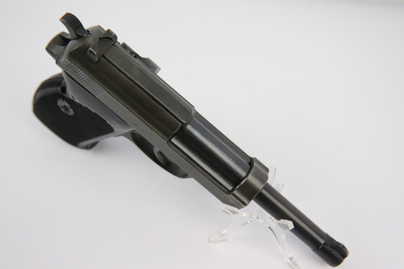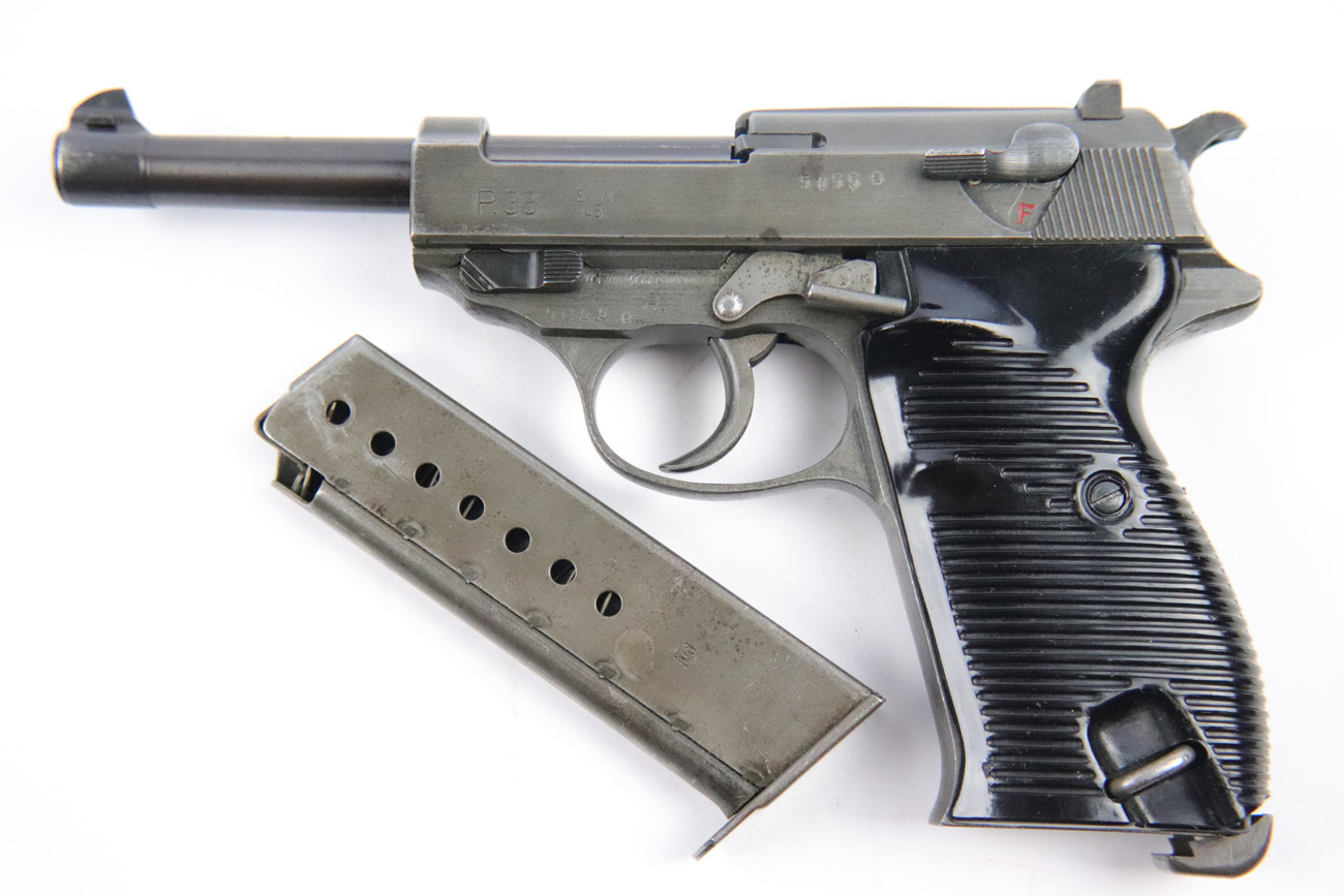 5/10/18 – This is a Mauser made P,38 from 1945.   These are fairly rare as they only made guns from January to April when the factory was taken over by Allied troops.  It comes in the thin phosphate finish which gives these guns a rough but unique look, and make them highly sought after by collectors.   All parts are matching and phosphate finish with the exception of the blued finish barrel, take down lever and perhaps the hammer (not sure).   Even the magazine is phosphate, making it a very rare magazine.  It is Spreewerke, jvd marked, and right side large U marked, only done in 1945.    The bore is mirror with some light edge wear on the rifling. Overall a 9 out of 10.   Also comes with the correct Mauser black plastic grips.  Mechanically it works well. de-cocker functions properly.   All original and authentic late war gun !
