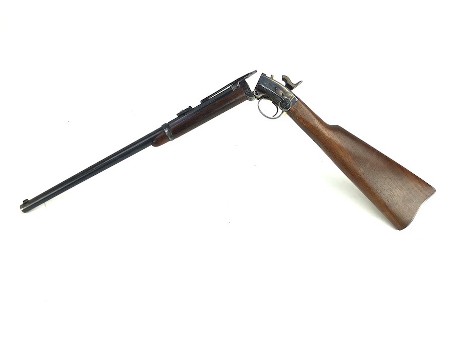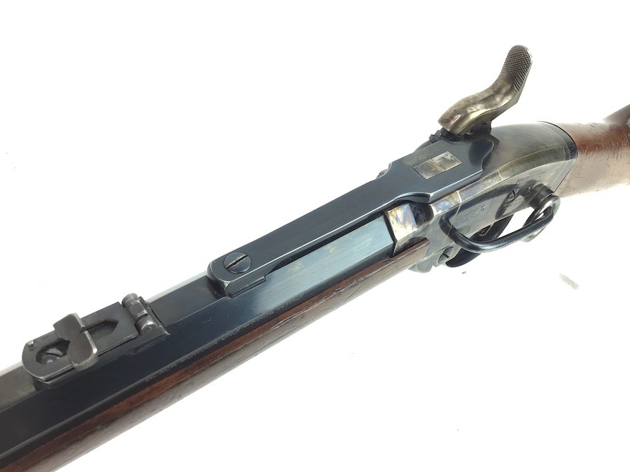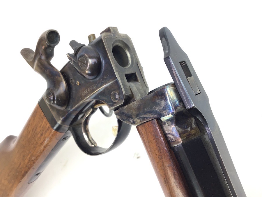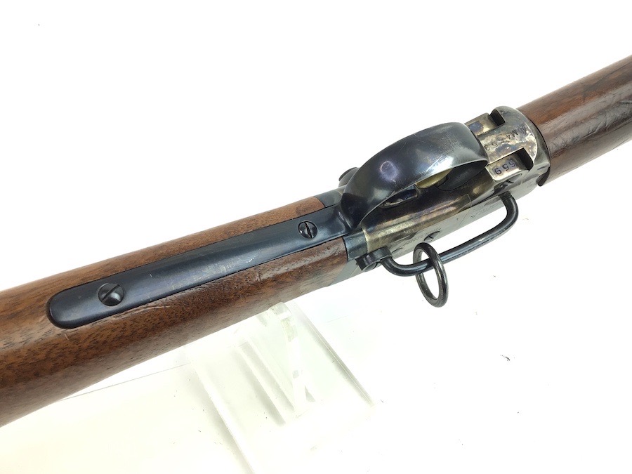 8/30/24 – Very nice condition Pietta Smith Carbine Percussion rifle, chambered in .50 Cal. black powder. Pietta is the only company that reproduces this model. The break open style provides easy access for cleaning. Bluing shows wear mostly around the muzzle area and trigger guard. Color case breech area still maintains nice coloring. There is some handling wear and a few dings on the wood furniture but overall still a nice piece. Bore is clean and rates a good 9 of 10. No FFL required.