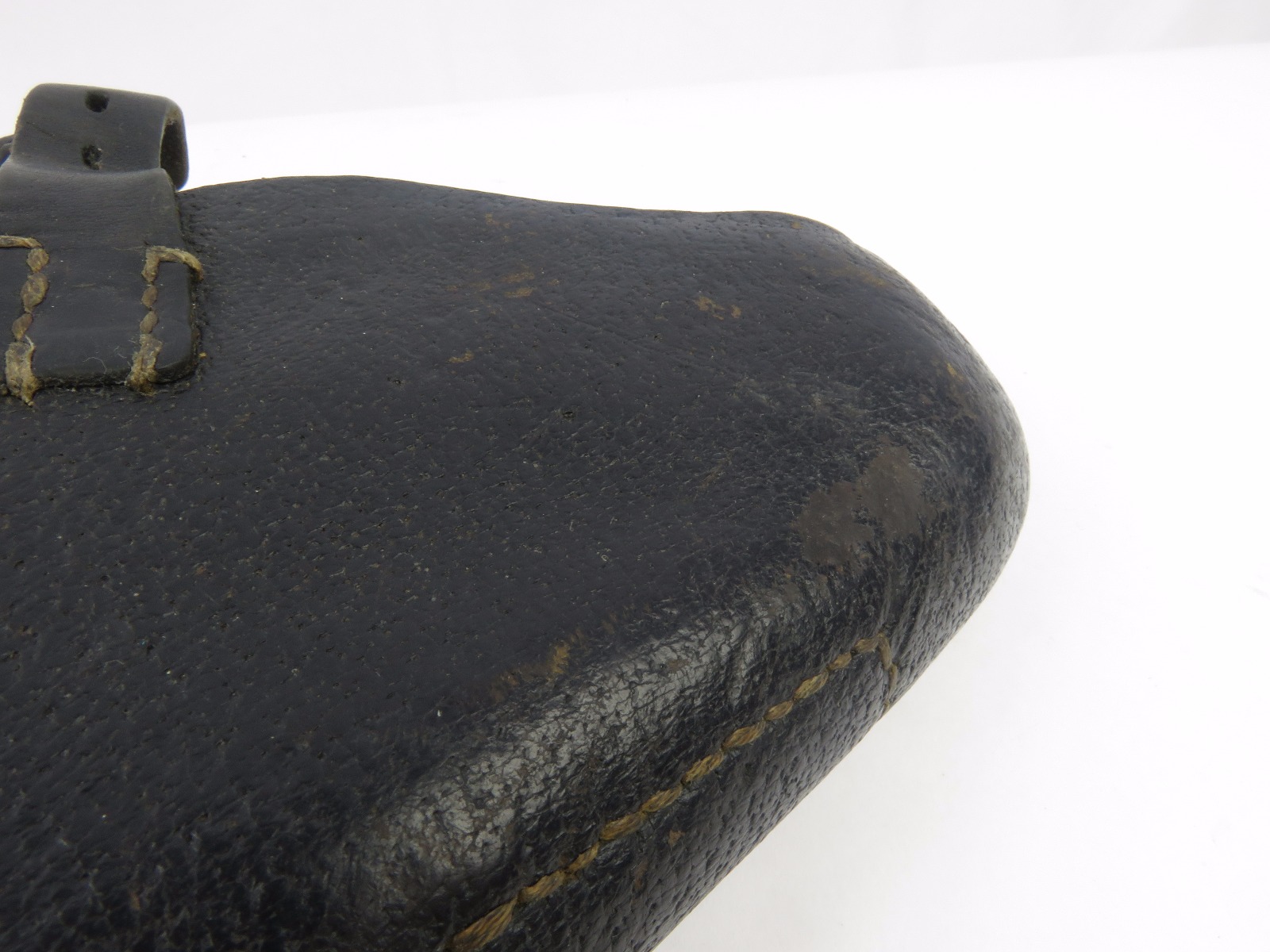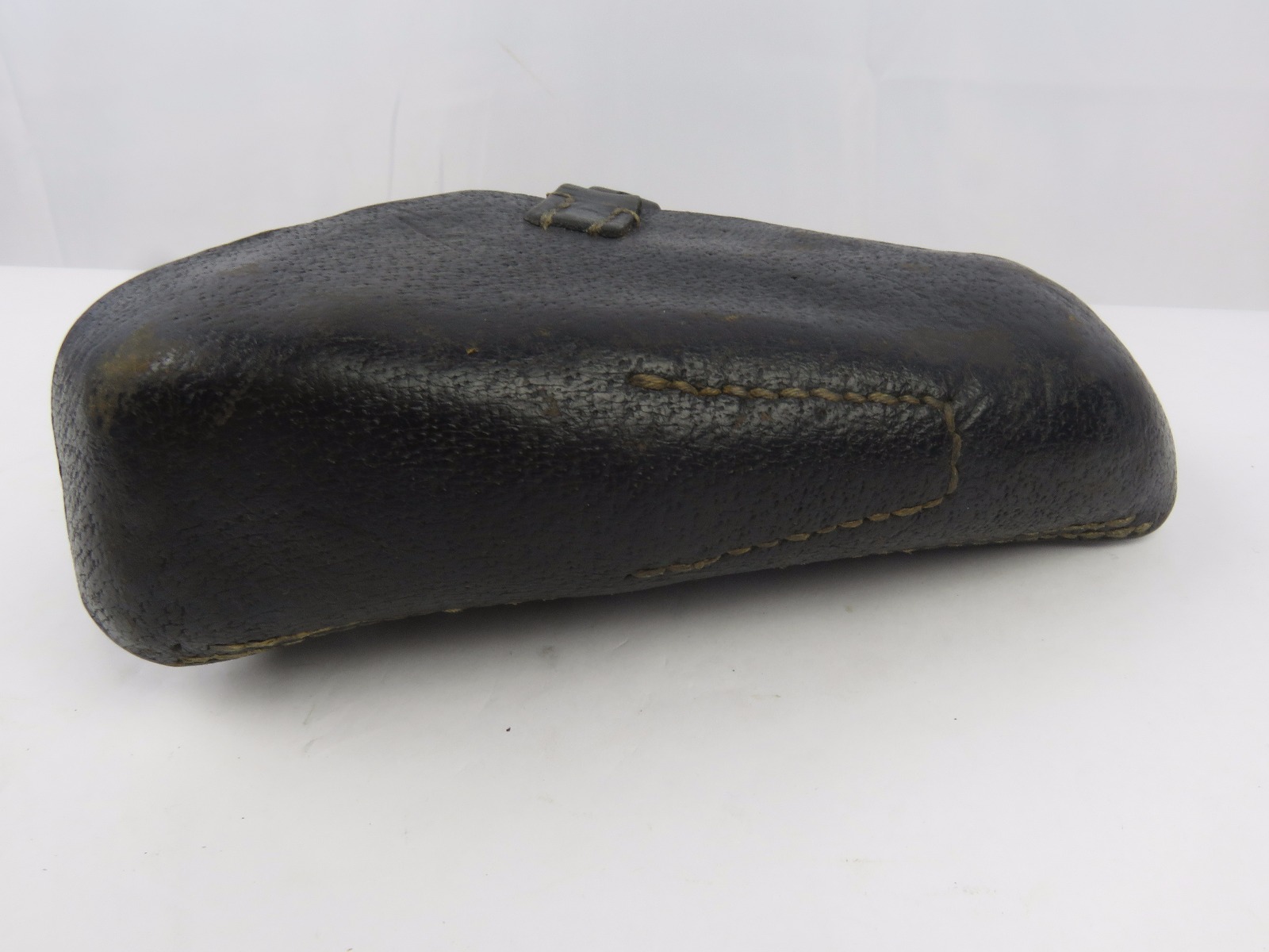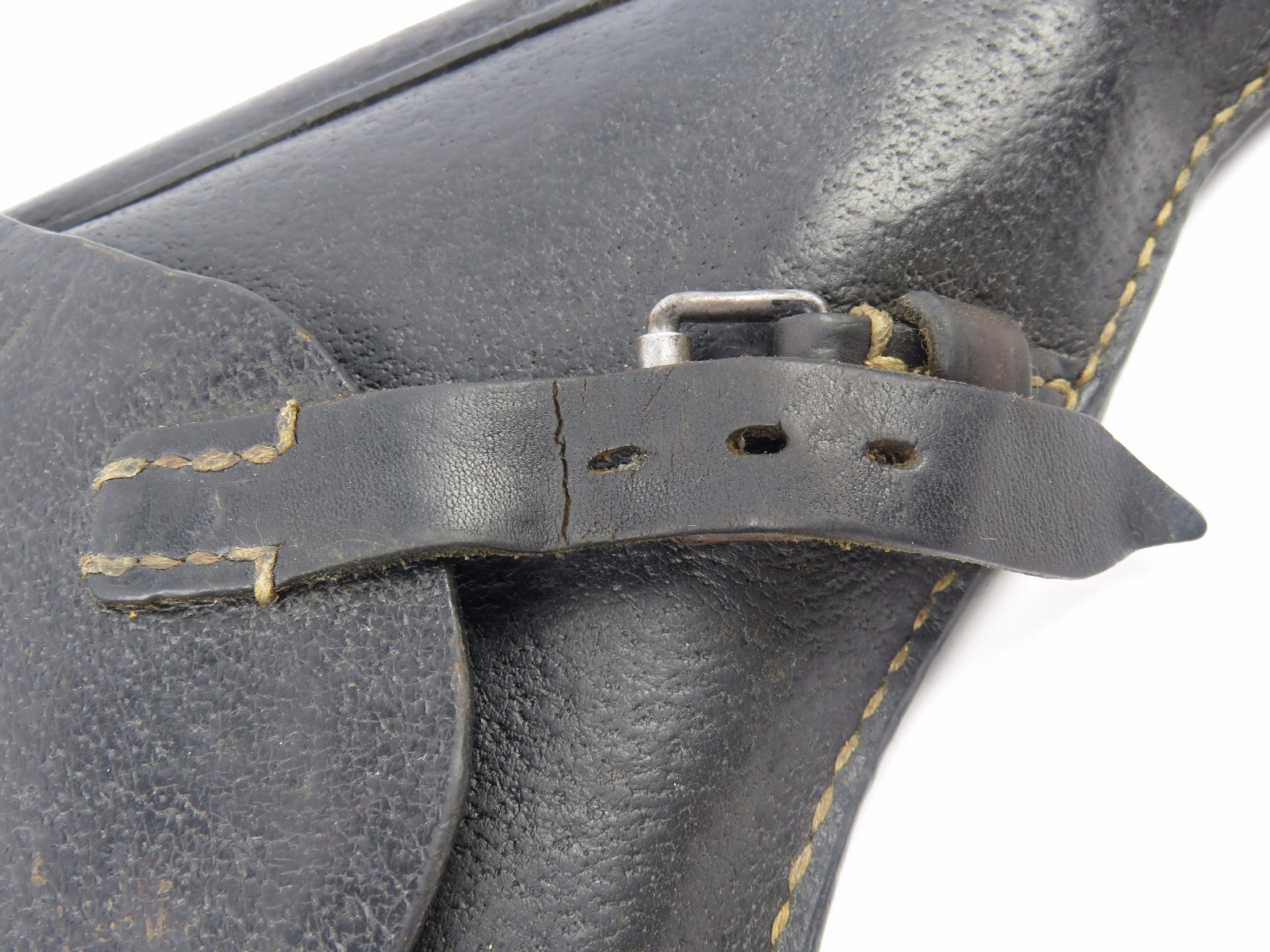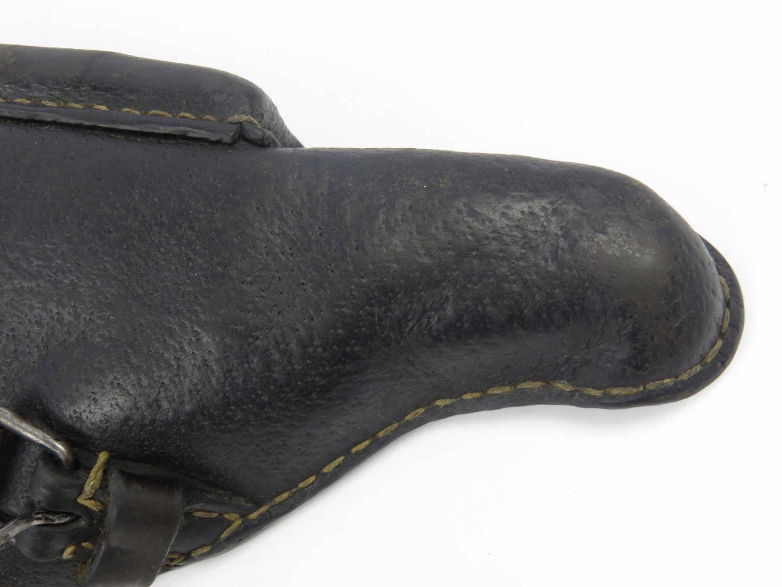 10/31/17 – This is a rare variation Luger holster made with pigskin leather. These holsters are often paired/seen with Black Widow Lugers, but it’s only speculation that they were often issued this way. This holster is correct for a black widow though, given the black leather and “42” date stamp on the back leather. The back leather is also P.08 stamped and “erg” stamped. I can’t find a waffen proof although there could be one within the poc marks of the pigskin leather. The leather is worn and shows signs of signifcant use – which makes it a cool piece of history. The leather is completely in tact though with nice shape and excellent stitching. The closure strap has a surface crack that doesn’t go very deep but is notable. Guaranteed original.