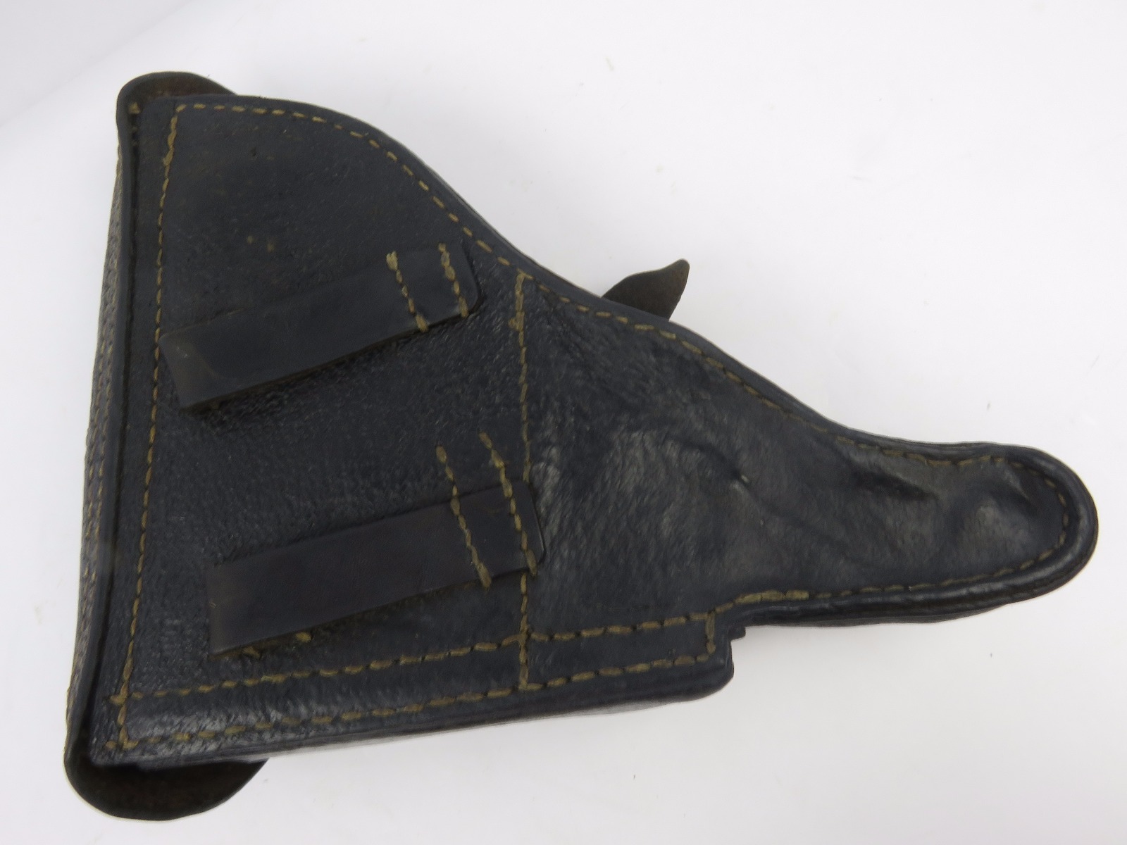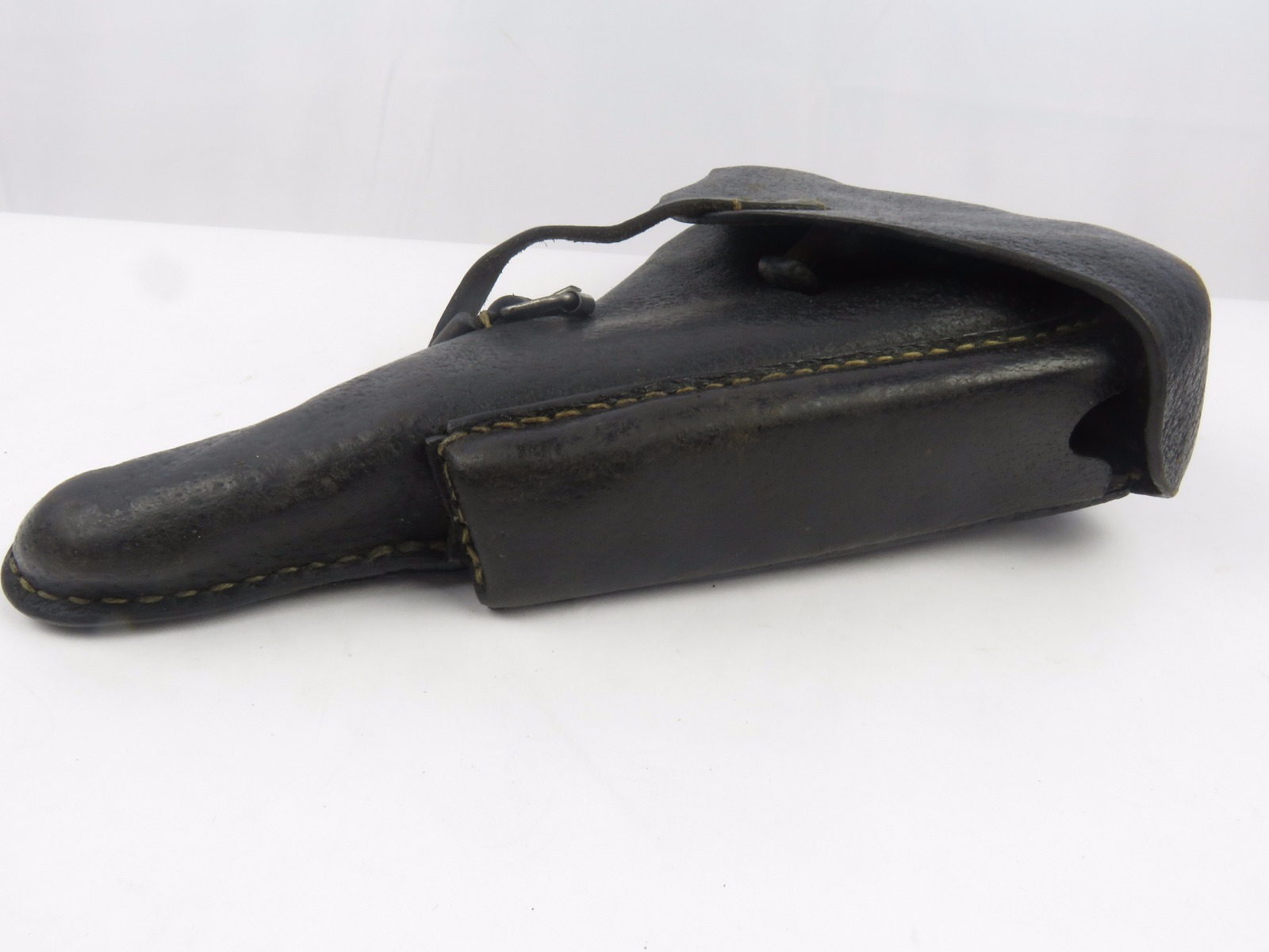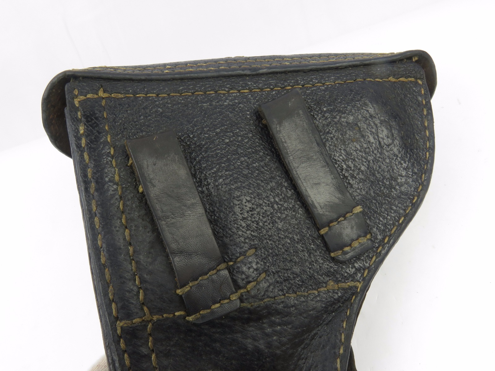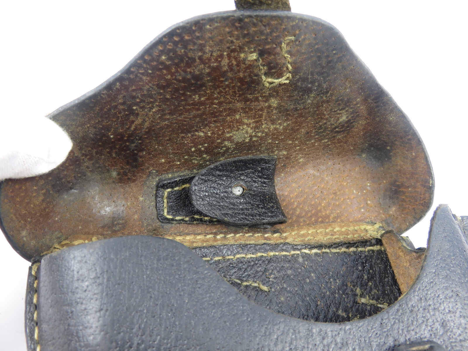 10/31/17 – This is a rare variation Luger holster made with pigskin leather. These holsters are often paired/seen with Black Widow Lugers, but it’s only speculation that they were often issued this way. This holster is correct for a black widow though, given the black leather and “42” date stamp on the back leather. The back leather is also P.08 stamped and “erg” stamped. I can’t find a waffen proof although there could be one within the poc marks of the pigskin leather. The leather is worn and shows signs of signifcant use – which makes it a cool piece of history. The leather is completely in tact though with nice shape and excellent stitching. The closure strap has a surface crack that doesn’t go very deep but is notable. Guaranteed original.