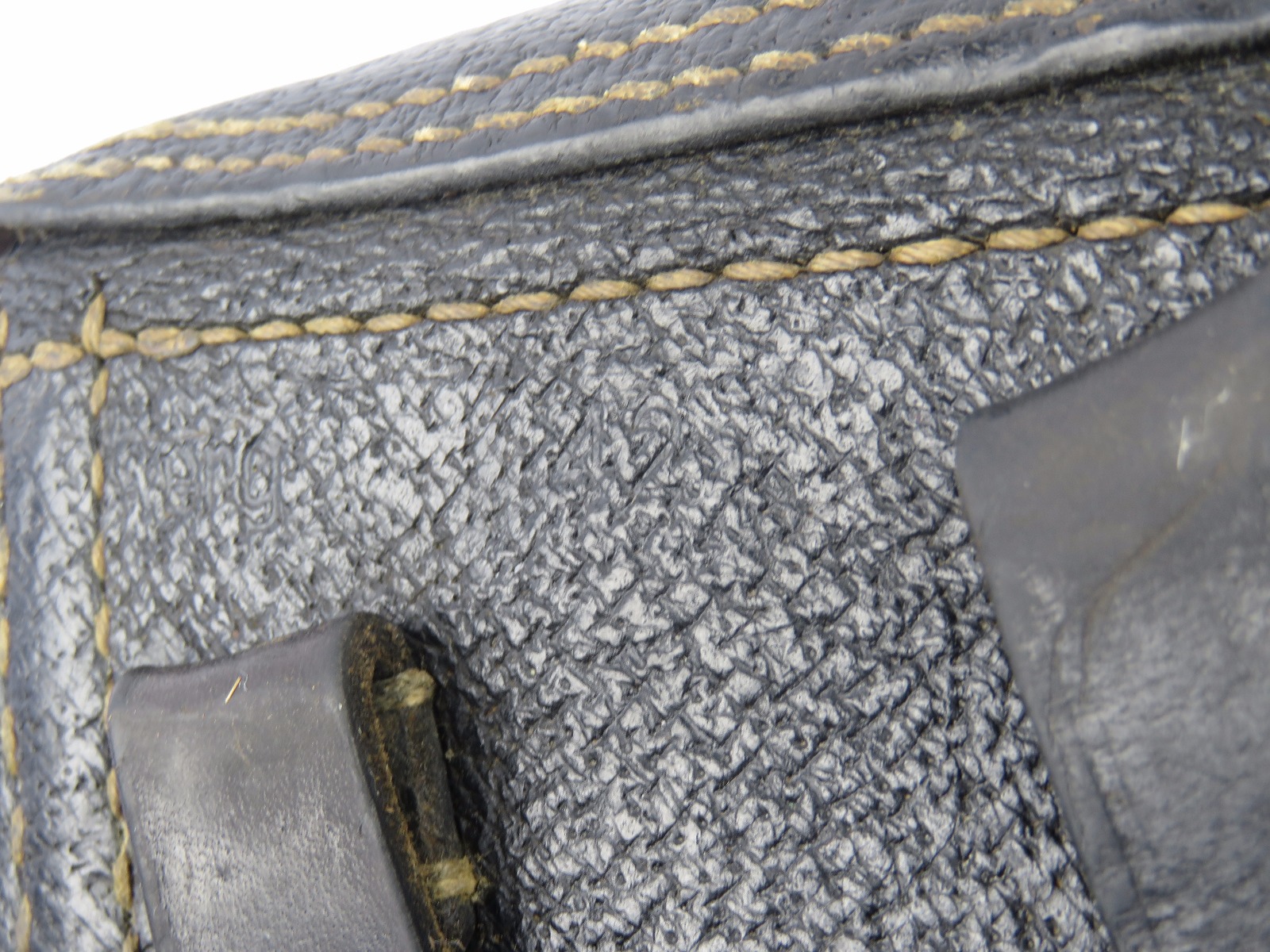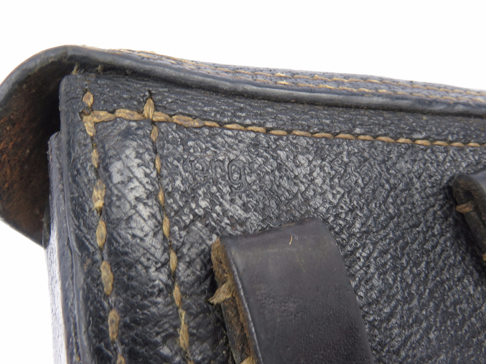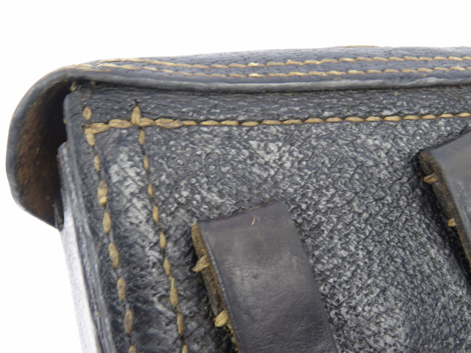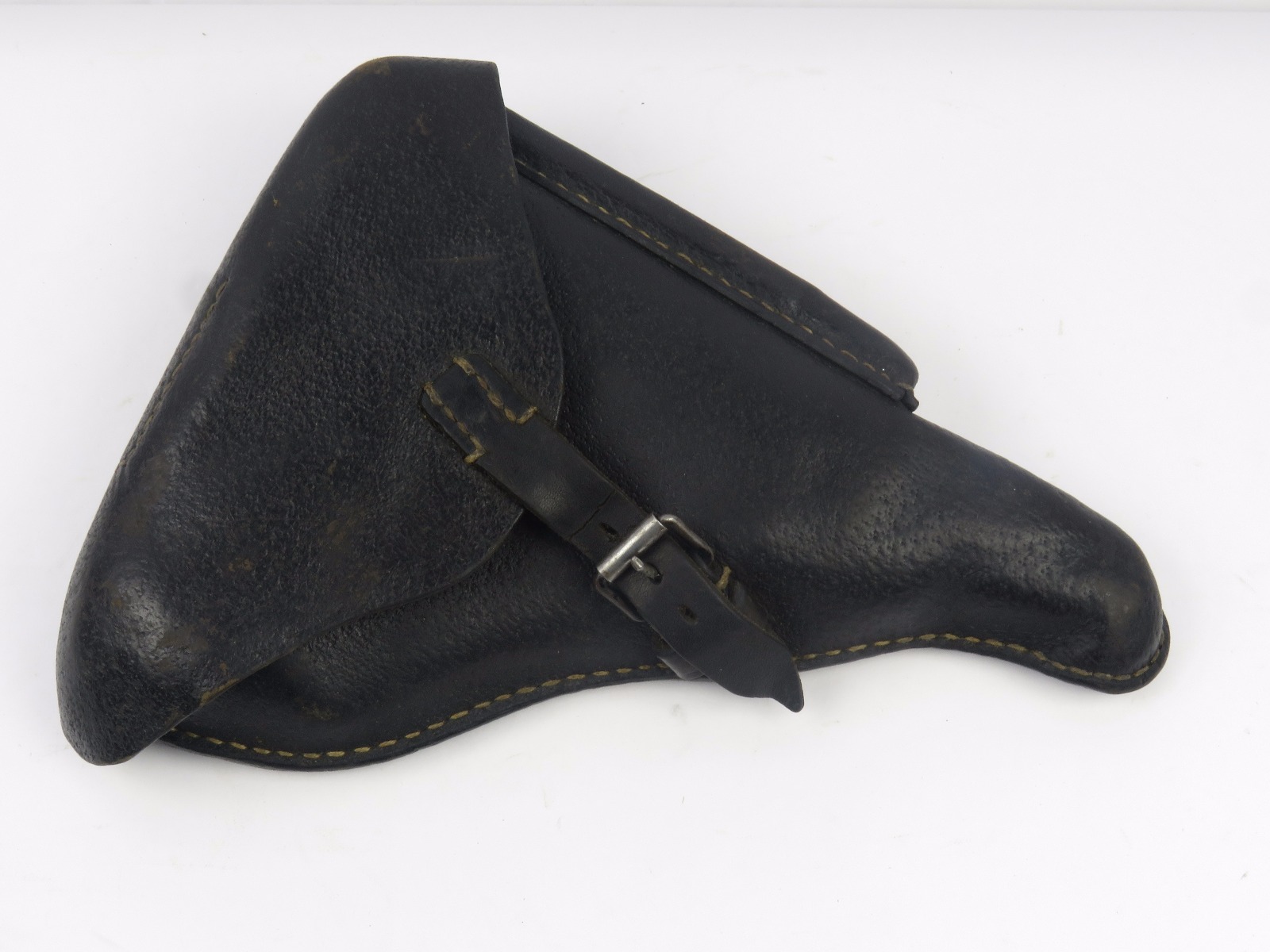 10/31/17 – This is a rare variation Luger holster made with pigskin leather. These holsters are often paired/seen with Black Widow Lugers, but it’s only speculation that they were often issued this way. This holster is correct for a black widow though, given the black leather and “42” date stamp on the back leather. The back leather is also P.08 stamped and “erg” stamped. I can’t find a waffen proof although there could be one within the poc marks of the pigskin leather. The leather is worn and shows signs of signifcant use – which makes it a cool piece of history. The leather is completely in tact though with nice shape and excellent stitching. The closure strap has a surface crack that doesn’t go very deep but is notable. Guaranteed original.