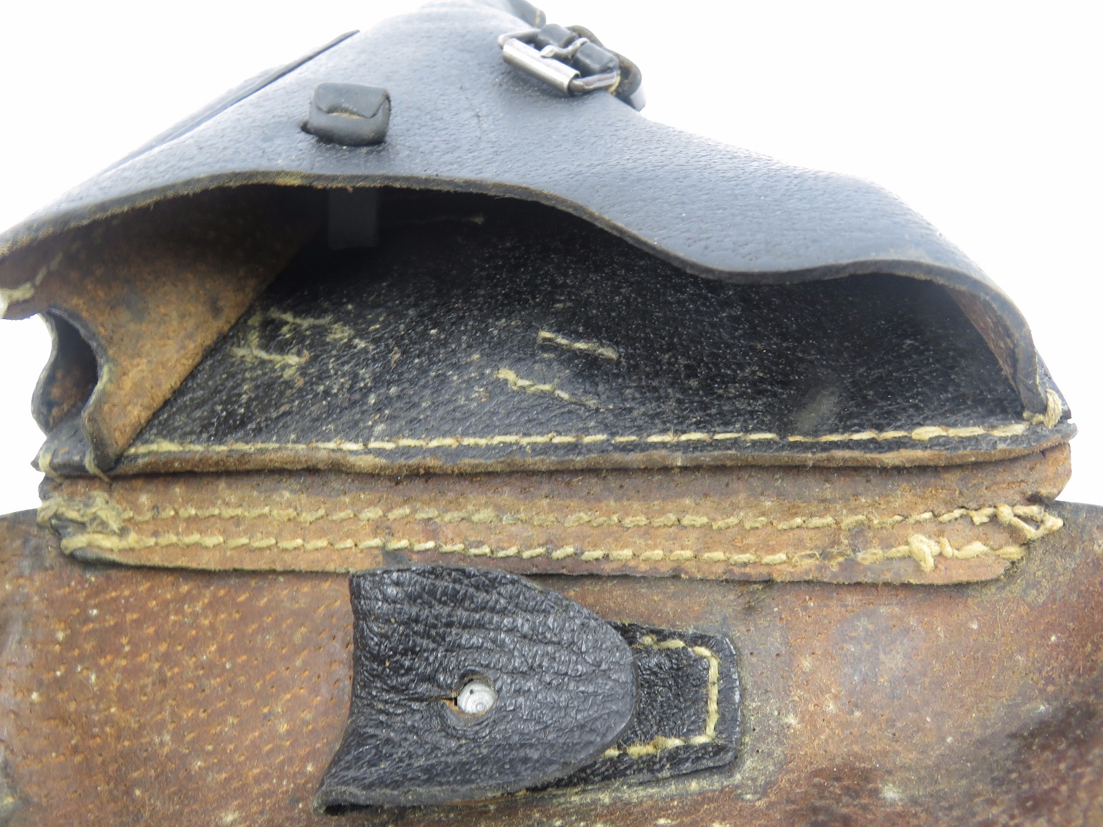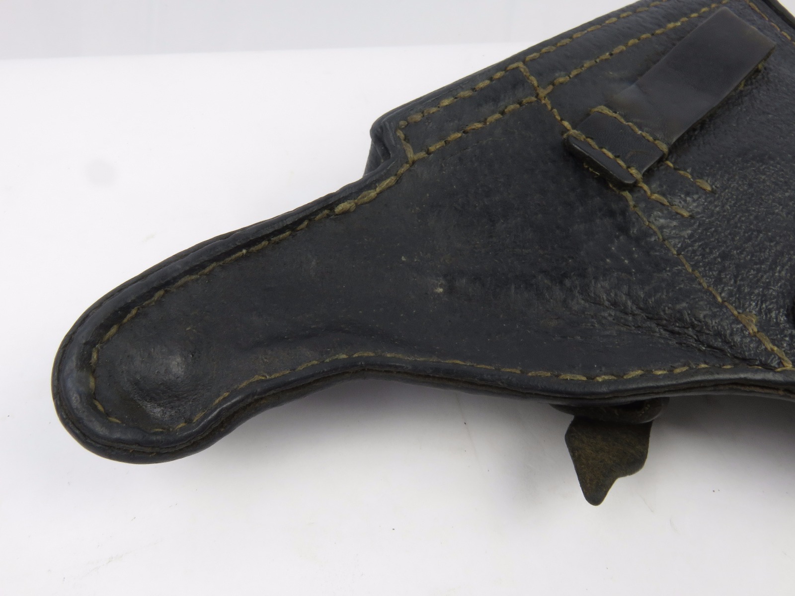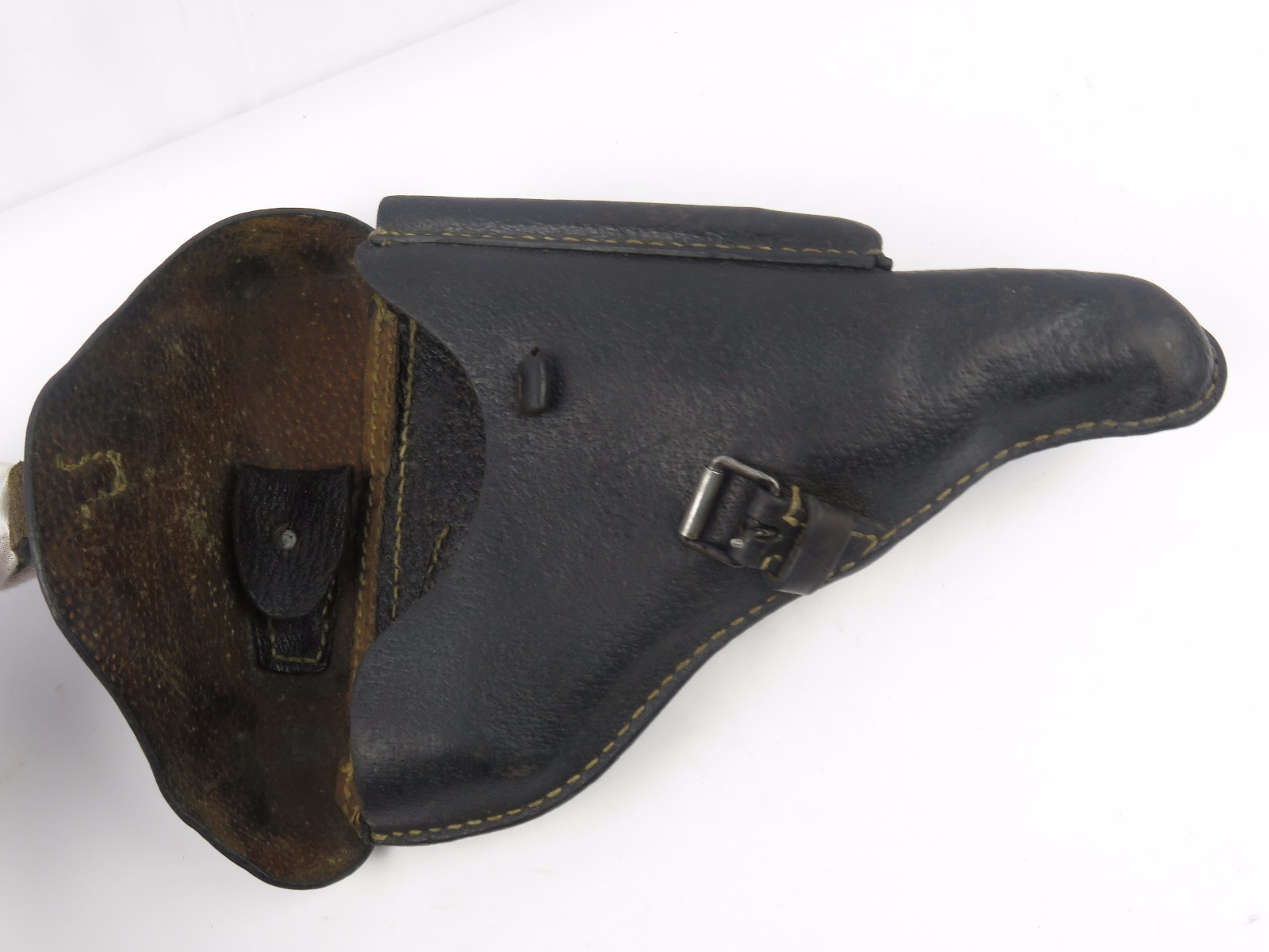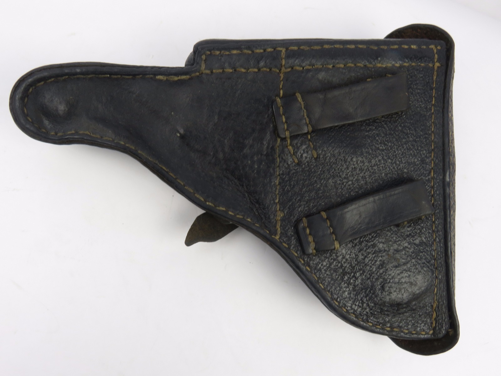 10/31/17 – This is a rare variation Luger holster made with pigskin leather. These holsters are often paired/seen with Black Widow Lugers, but it’s only speculation that they were often issued this way. This holster is correct for a black widow though, given the black leather and “42” date stamp on the back leather. The back leather is also P.08 stamped and “erg” stamped. I can’t find a waffen proof although there could be one within the poc marks of the pigskin leather. The leather is worn and shows signs of signifcant use – which makes it a cool piece of history. The leather is completely in tact though with nice shape and excellent stitching. The closure strap has a surface crack that doesn’t go very deep but is notable. Guaranteed original.