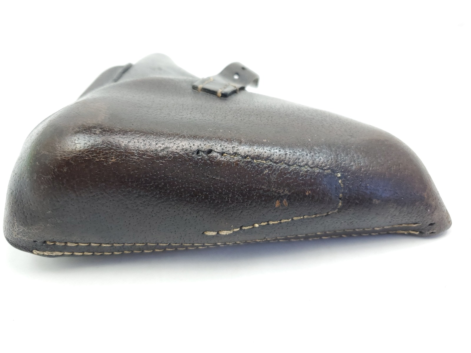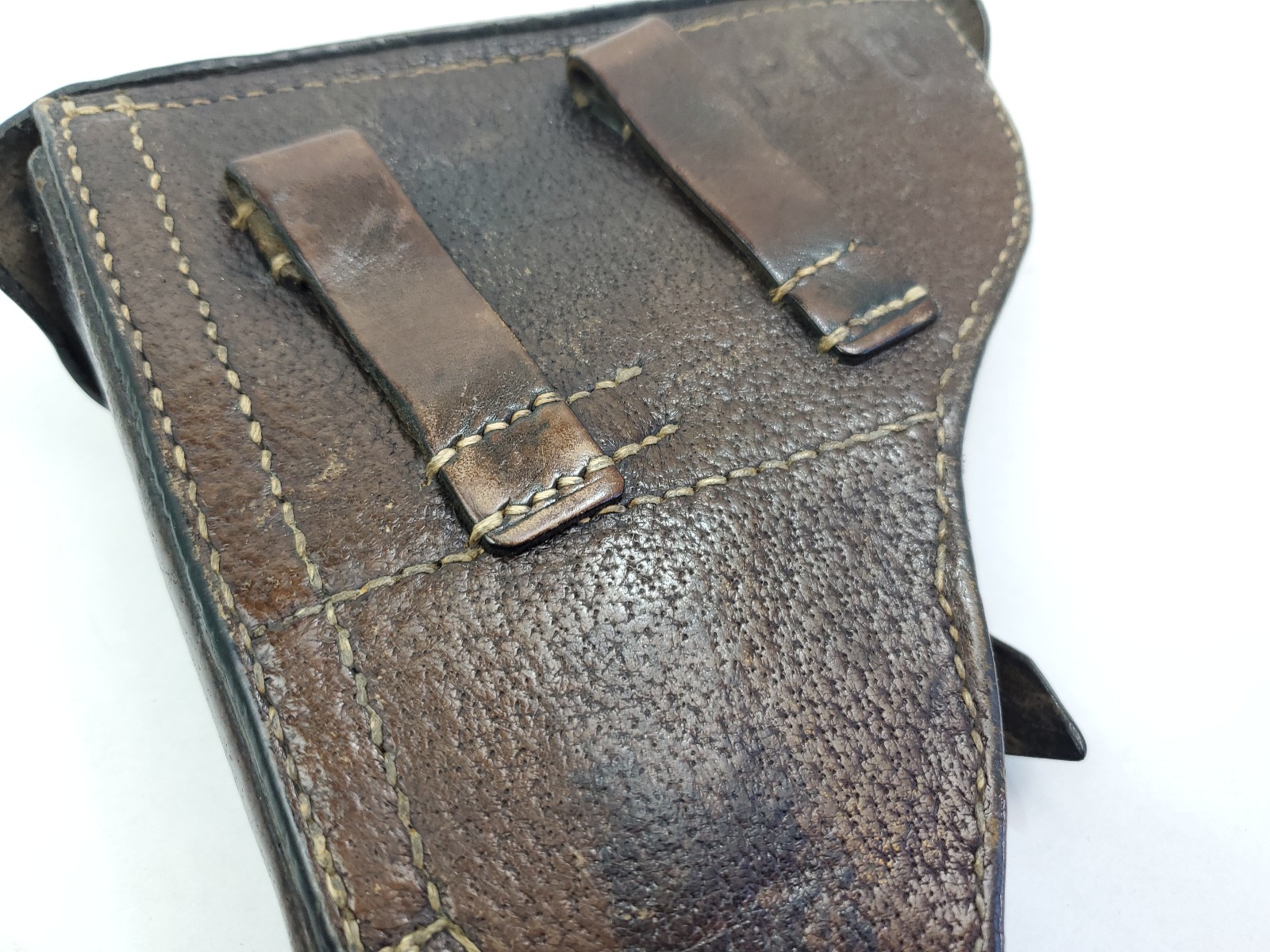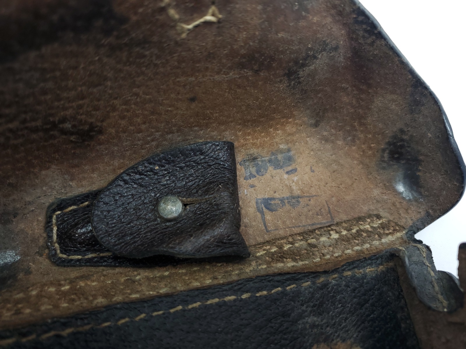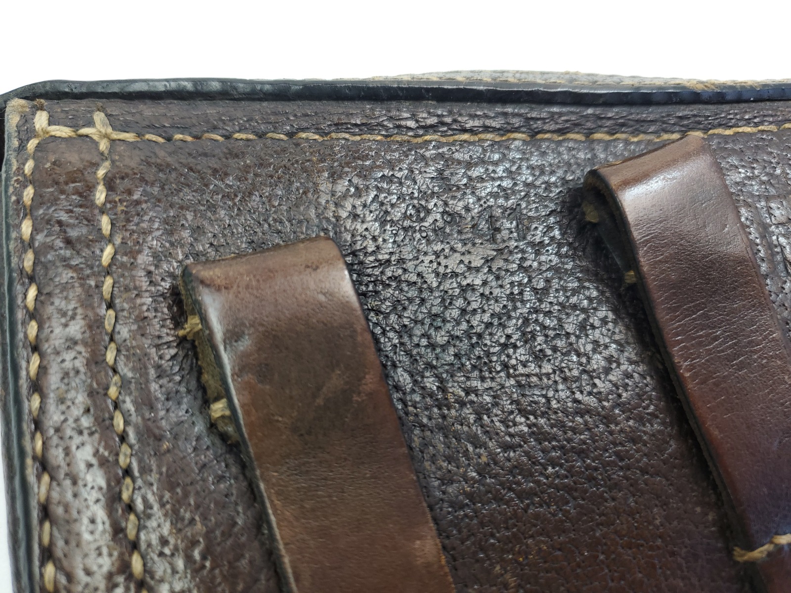 7/22/20 – This is a fairly rare, unique Luger holster from the end of Luger production. This holster is unique in that it has a ’42 ink stamp on the interior of the lid, yet the back of the holster is ’41 dated. We believe this was put together from two different pigskin pieces of leather, and made this way back in 1942. The stitching is congruent throughout the holster which helps back this theory. Also interesting is the lack of maker code on the back leather. We see a ’41 date and waffen proof but no maker code. The leather has nice shape and has faded to a brownish color, especially on the back leather. This would have been dyed black when it left the factory. Normal pliability and great stitching with minimal stitching issues.
