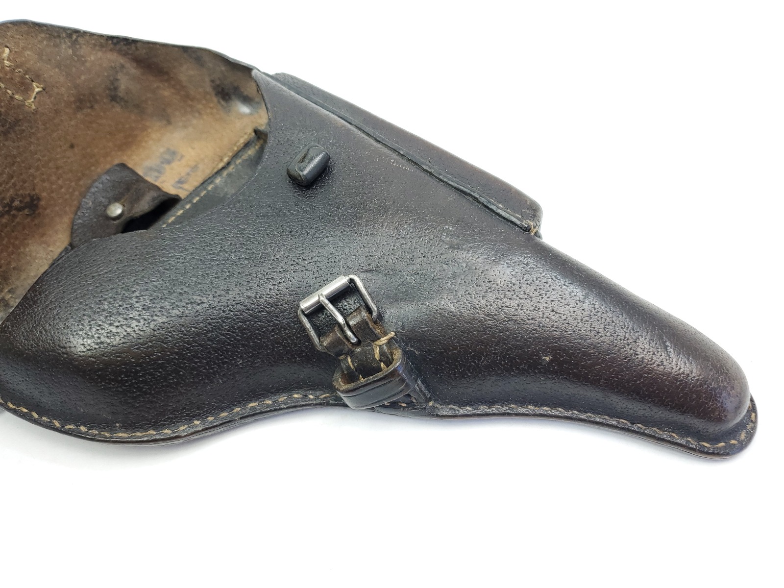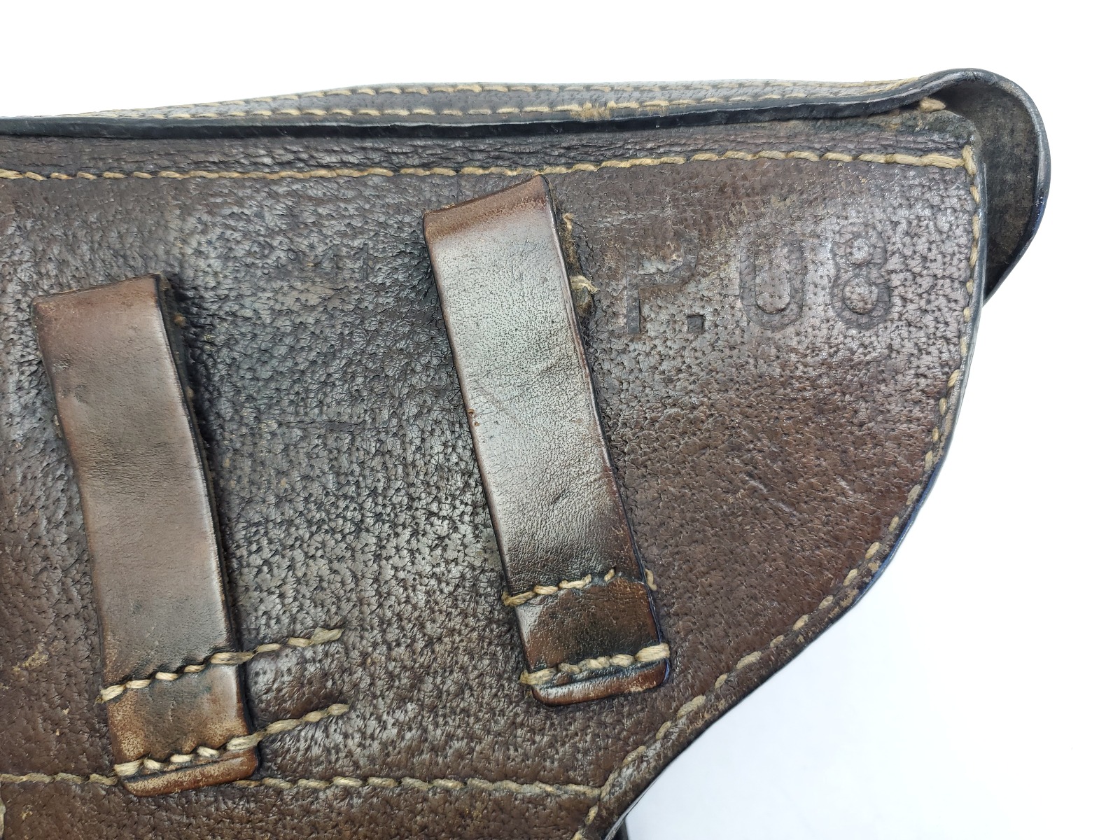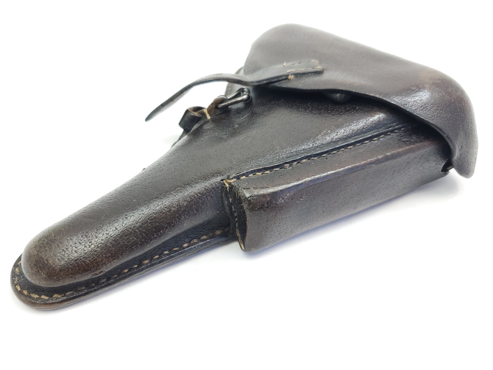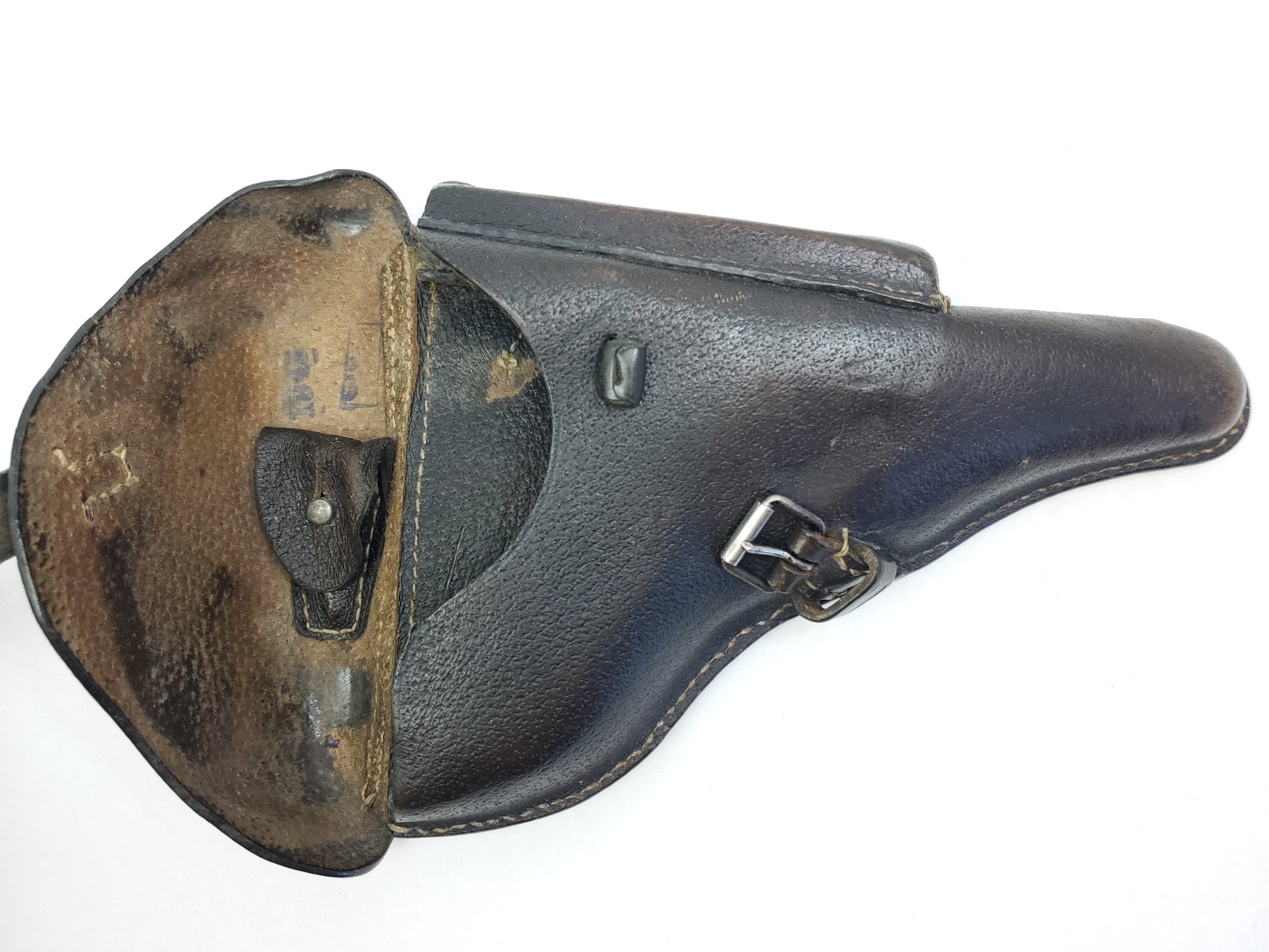 7/22/20 – This is a fairly rare, unique Luger holster from the end of Luger production. This holster is unique in that it has a ’42 ink stamp on the interior of the lid, yet the back of the holster is ’41 dated. We believe this was put together from two different pigskin pieces of leather, and made this way back in 1942. The stitching is congruent throughout the holster which helps back this theory. Also interesting is the lack of maker code on the back leather. We see a ’41 date and waffen proof but no maker code. The leather has nice shape and has faded to a brownish color, especially on the back leather. This would have been dyed black when it left the factory. Normal pliability and great stitching with minimal stitching issues.